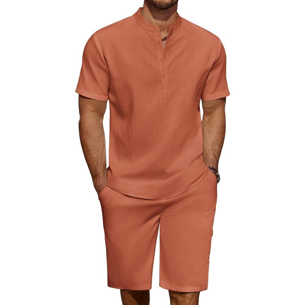 COOFANDY Men’s 2 Pieces Linen Set Casual Henley Shirts Short Sleeve Beach Yoga Shorts Summer Pants Outfits(Caramel)