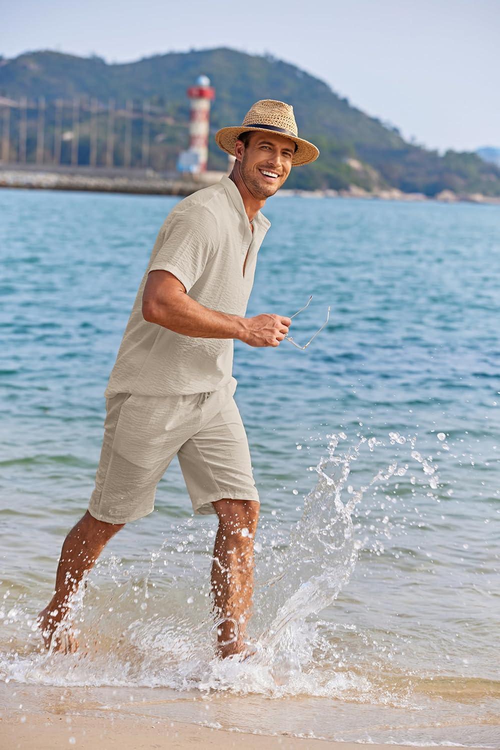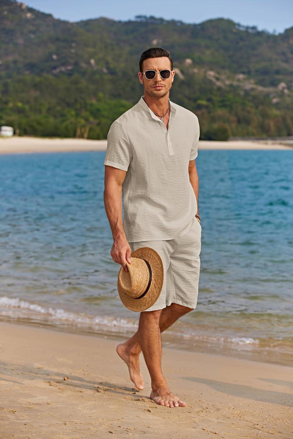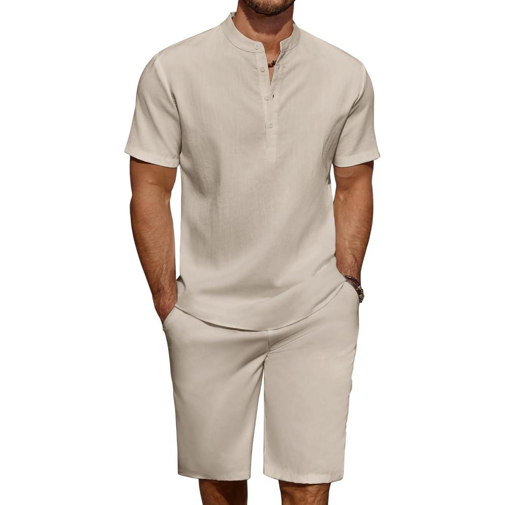 COOFANDY Men’s 2 Pieces Linen Set Casual Henley Shirts Short Sleeve Beach Yoga Shorts Summer Pants Outfits(Light Khaki)