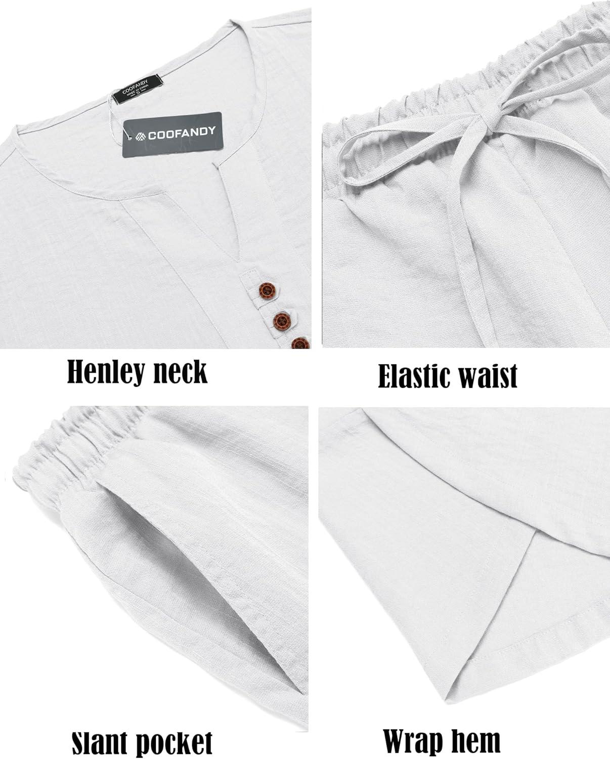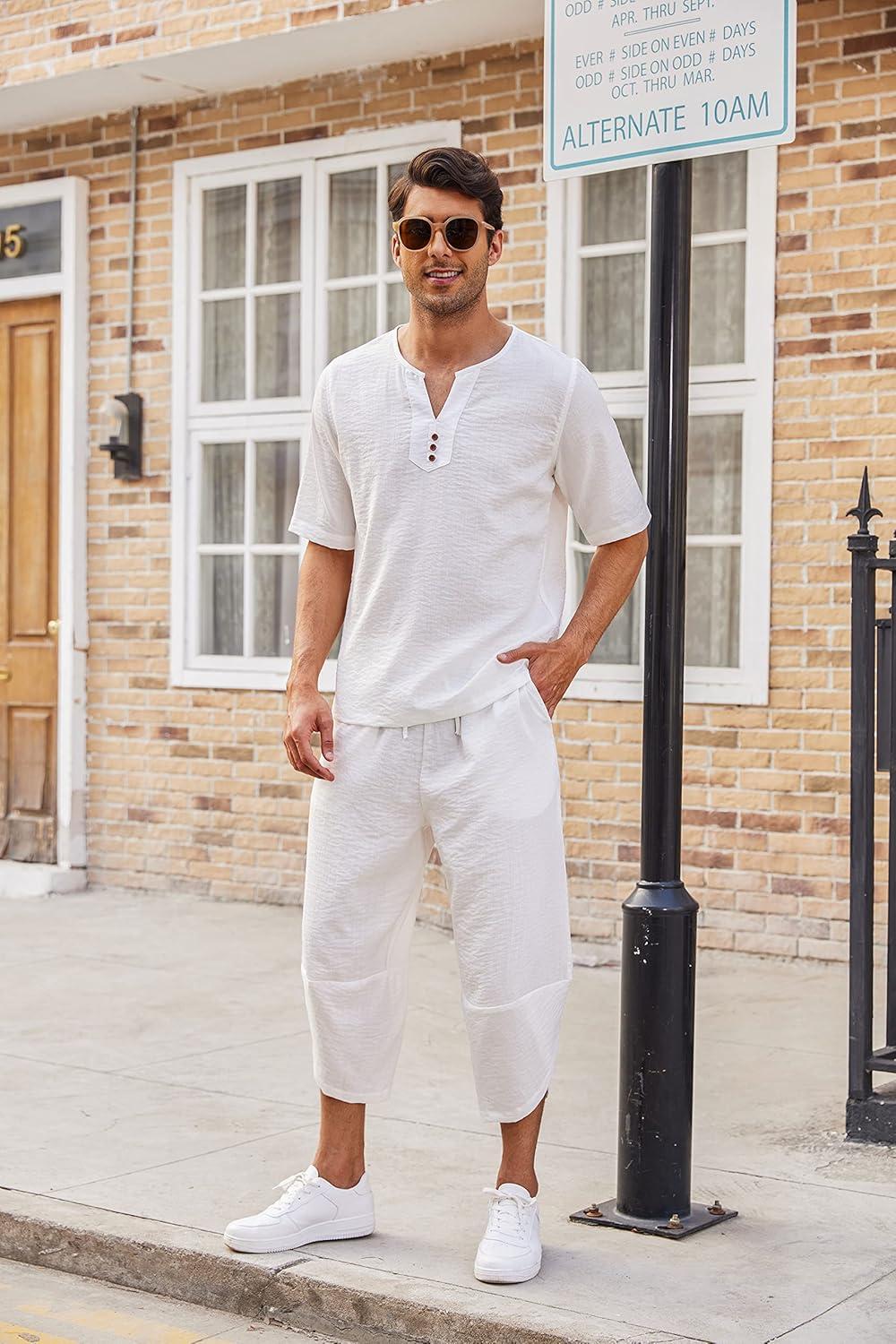 COOFANDY Men’s 2 Pieces Linen Set Henley Shirt Short Sleeve and Harem Capri Pants Wide Leg Baggy Beach Yoga Trousers Outfits(01-white)