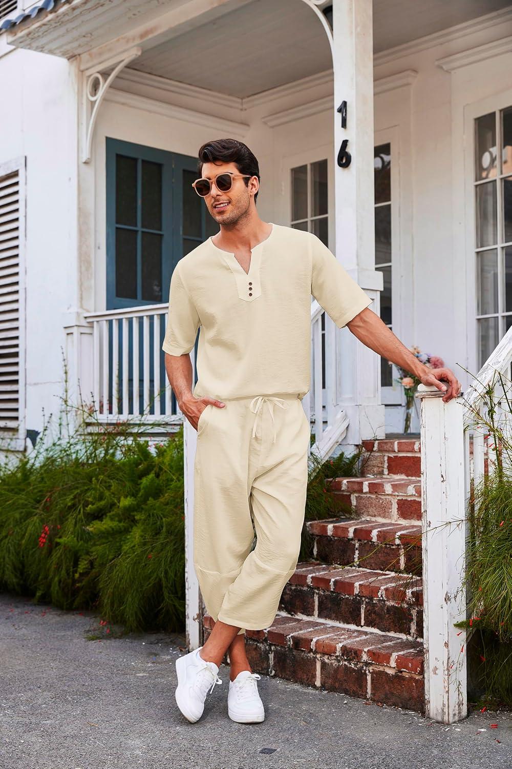 COOFANDY Men’s 2 Pieces Linen Set Henley Shirt Short Sleeve and Harem Capri Pants Wide Leg Baggy Beach Yoga Trousers Outfits(Beige)