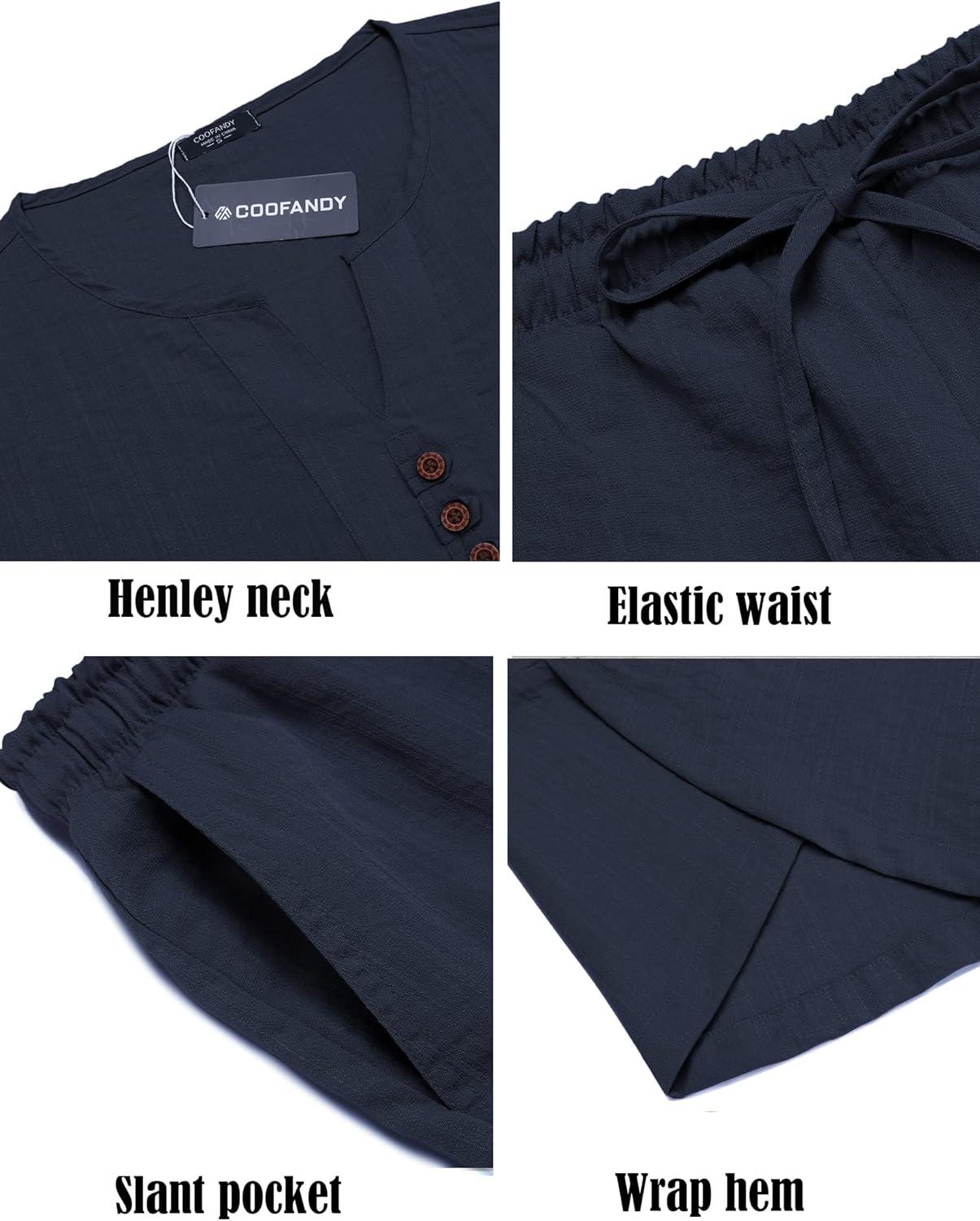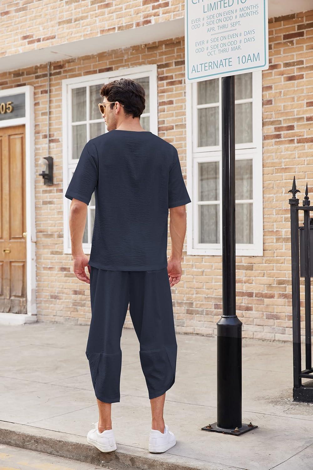 COOFANDY Men’s 2 Pieces Linen Set Henley Shirt Short Sleeve and Harem Capri Pants Wide Leg Baggy Beach Yoga Trousers Outfits(Navy Blue)