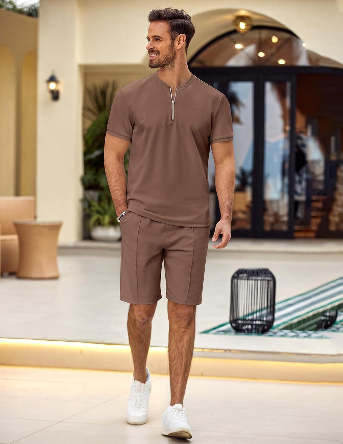 COOFANDY Men’s 2 Pieces Outfits Casual Quarter Zip Polo T Shirt and Shorts Set Athletic Jogging Summer Tracksuit(Brown)
