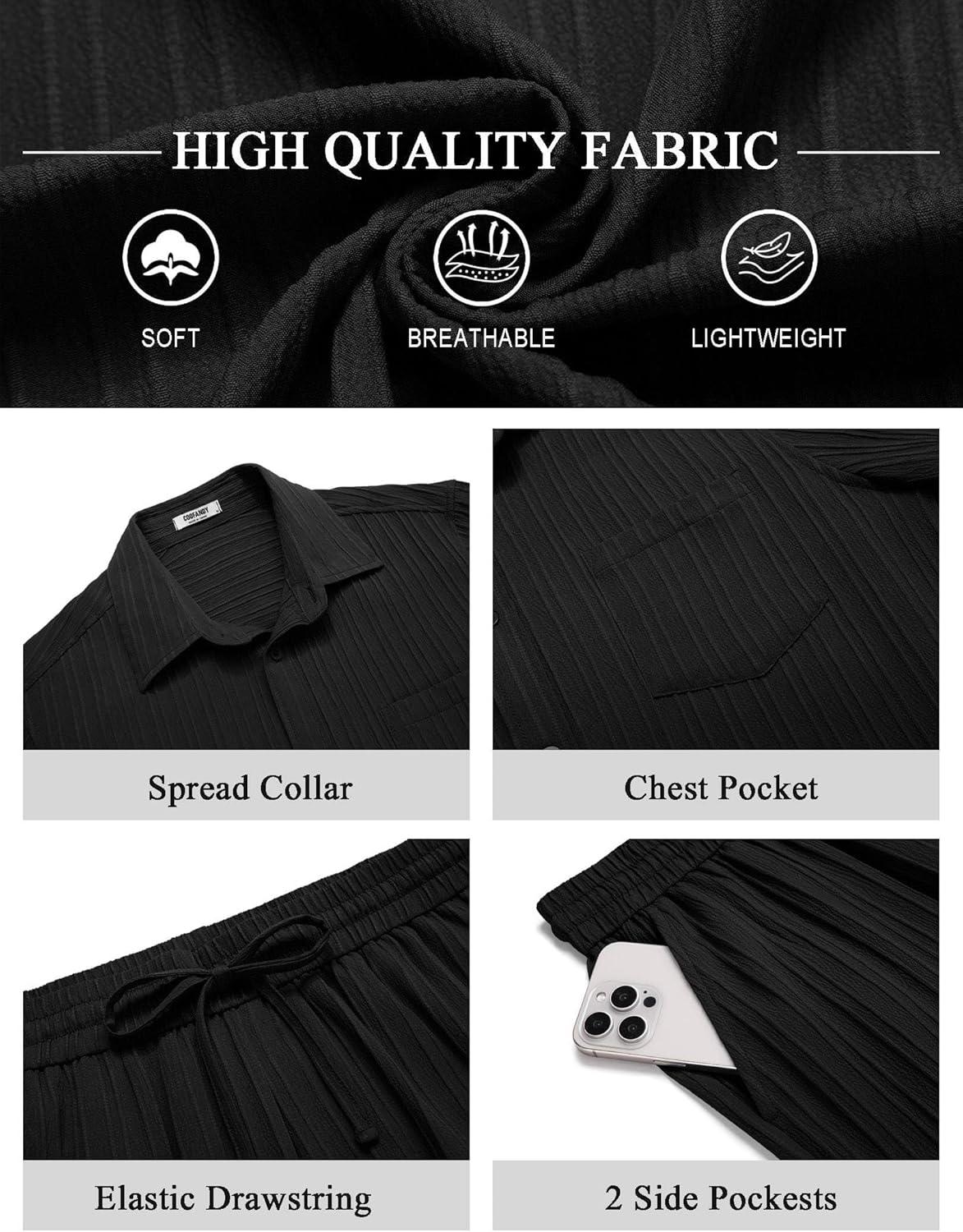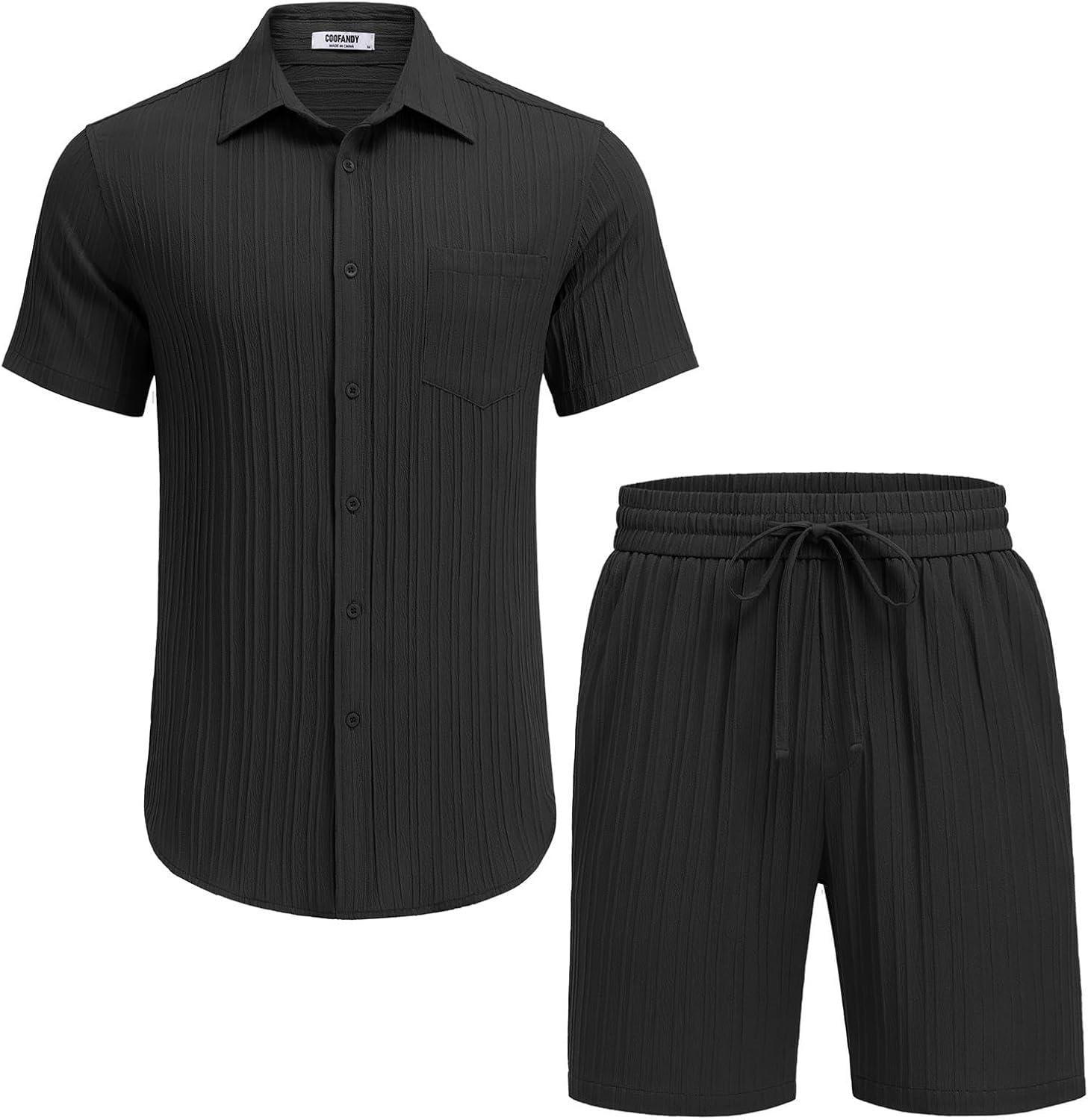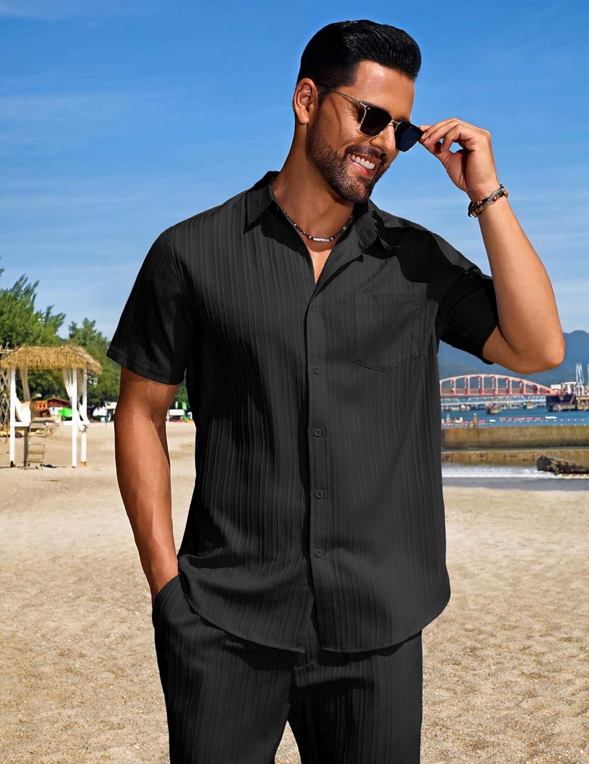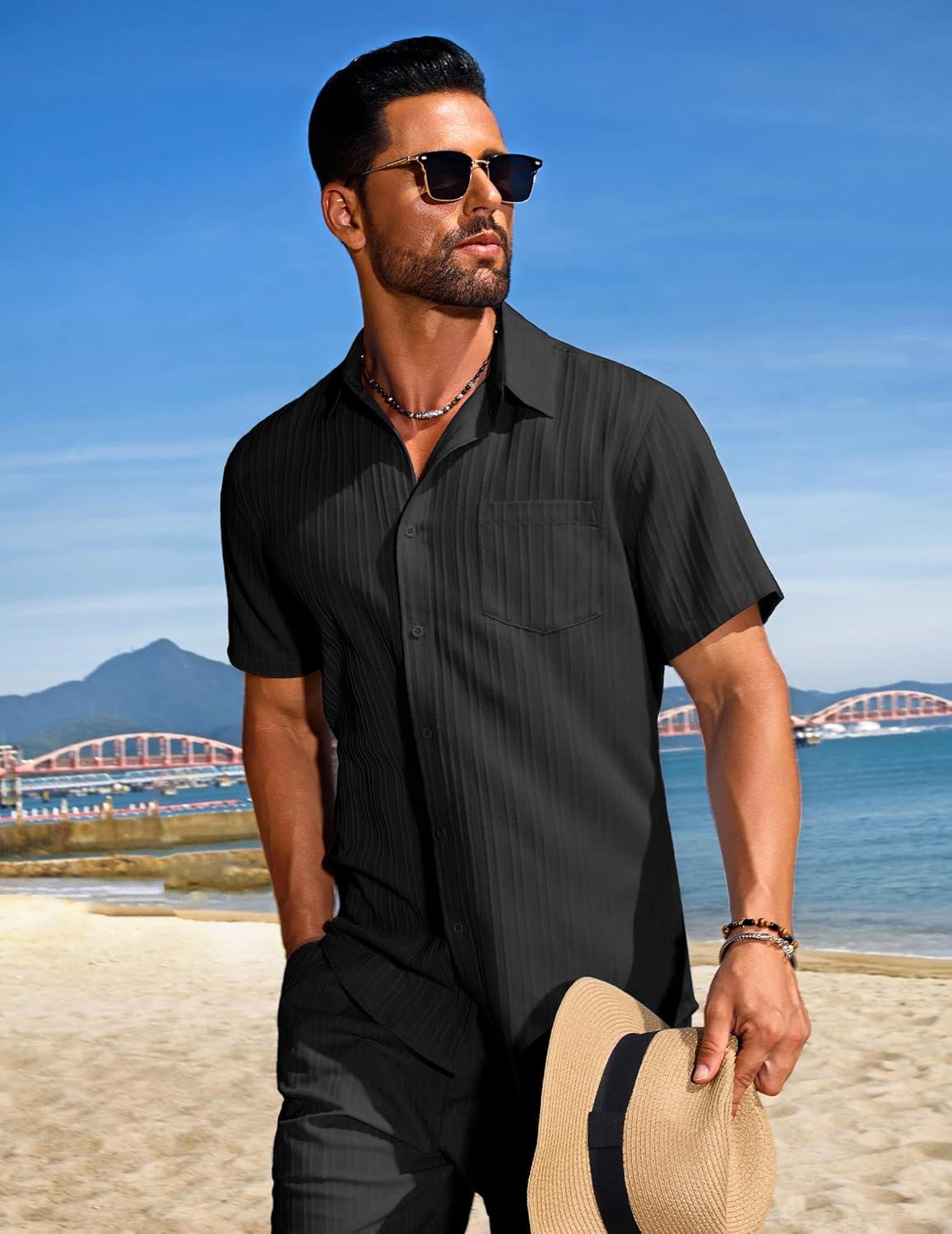 COOFANDY Mens Beach Outfits 2 Piece Sets Casual Short Sleeve Button Down Summer Textured Shirt(Black)
