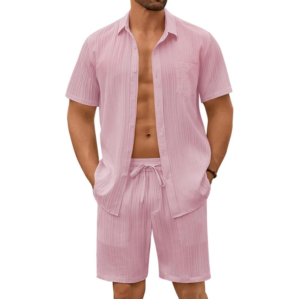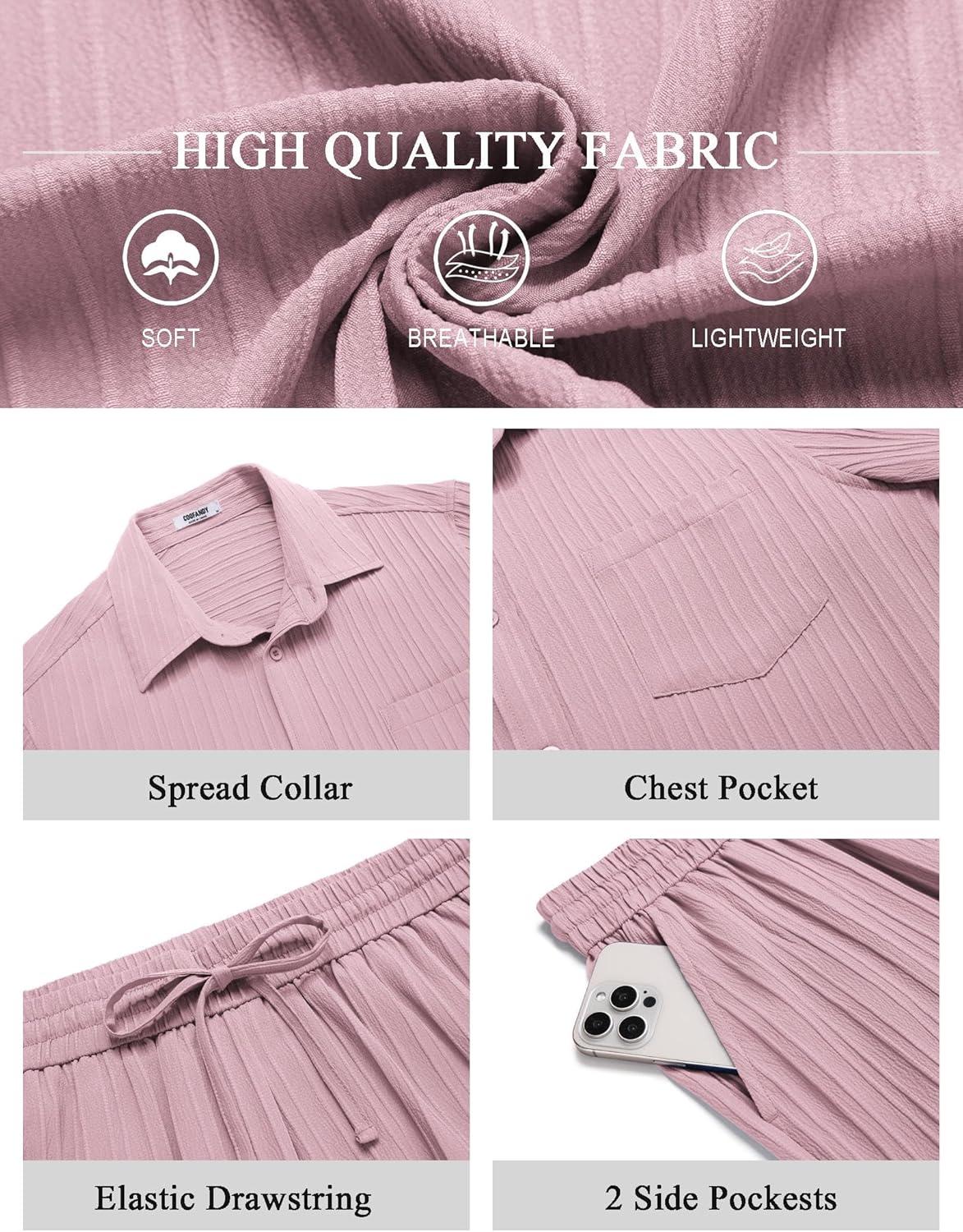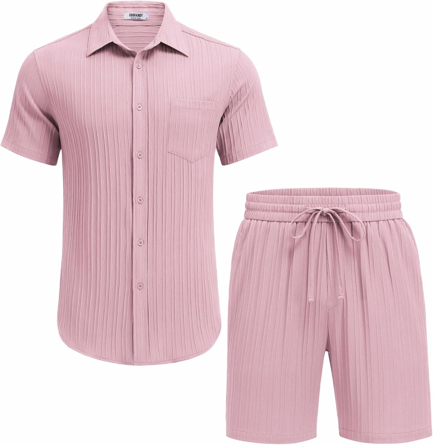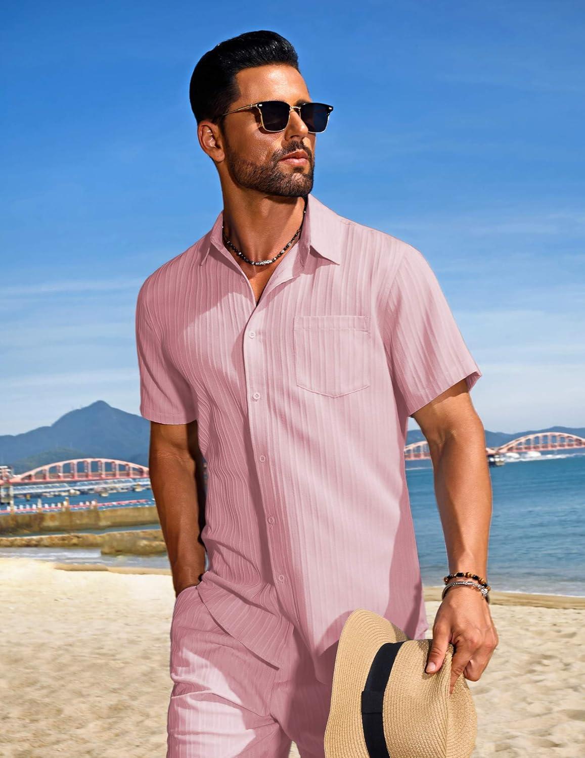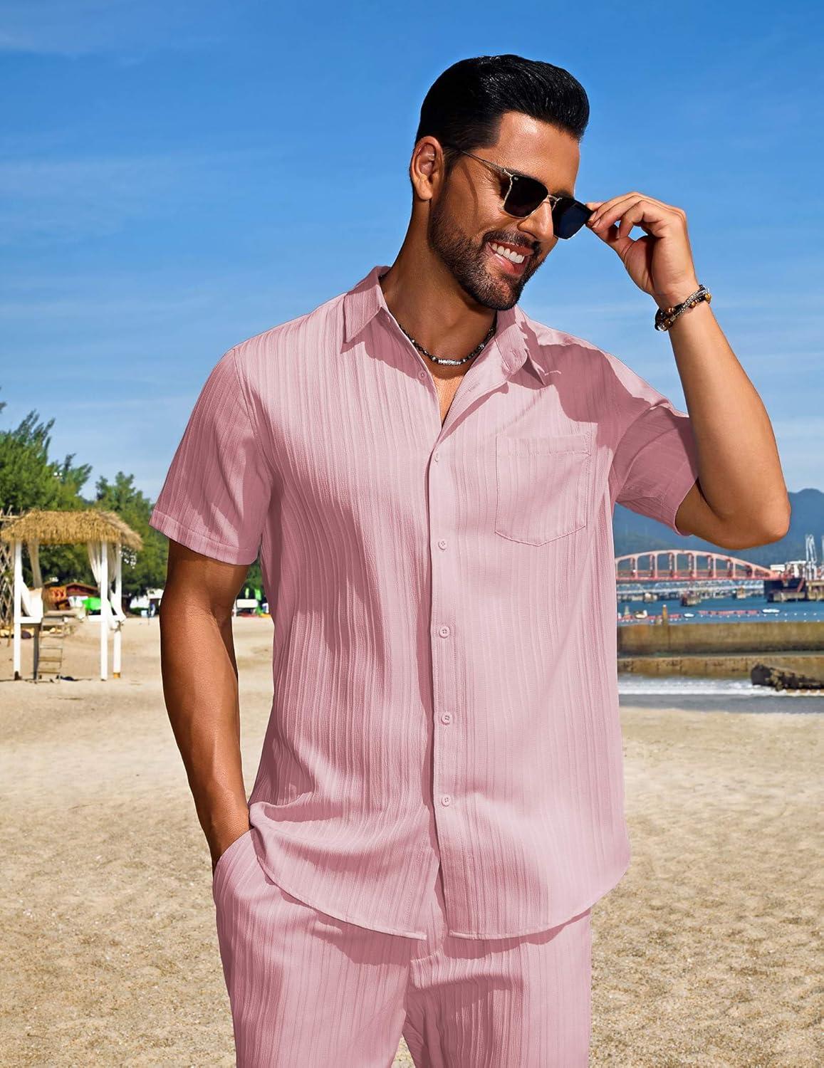 COOFANDY Mens Beach Outfits 2 Piece Sets Casual Short Sleeve Button Down Summer Textured Shirt(Dark Pink)