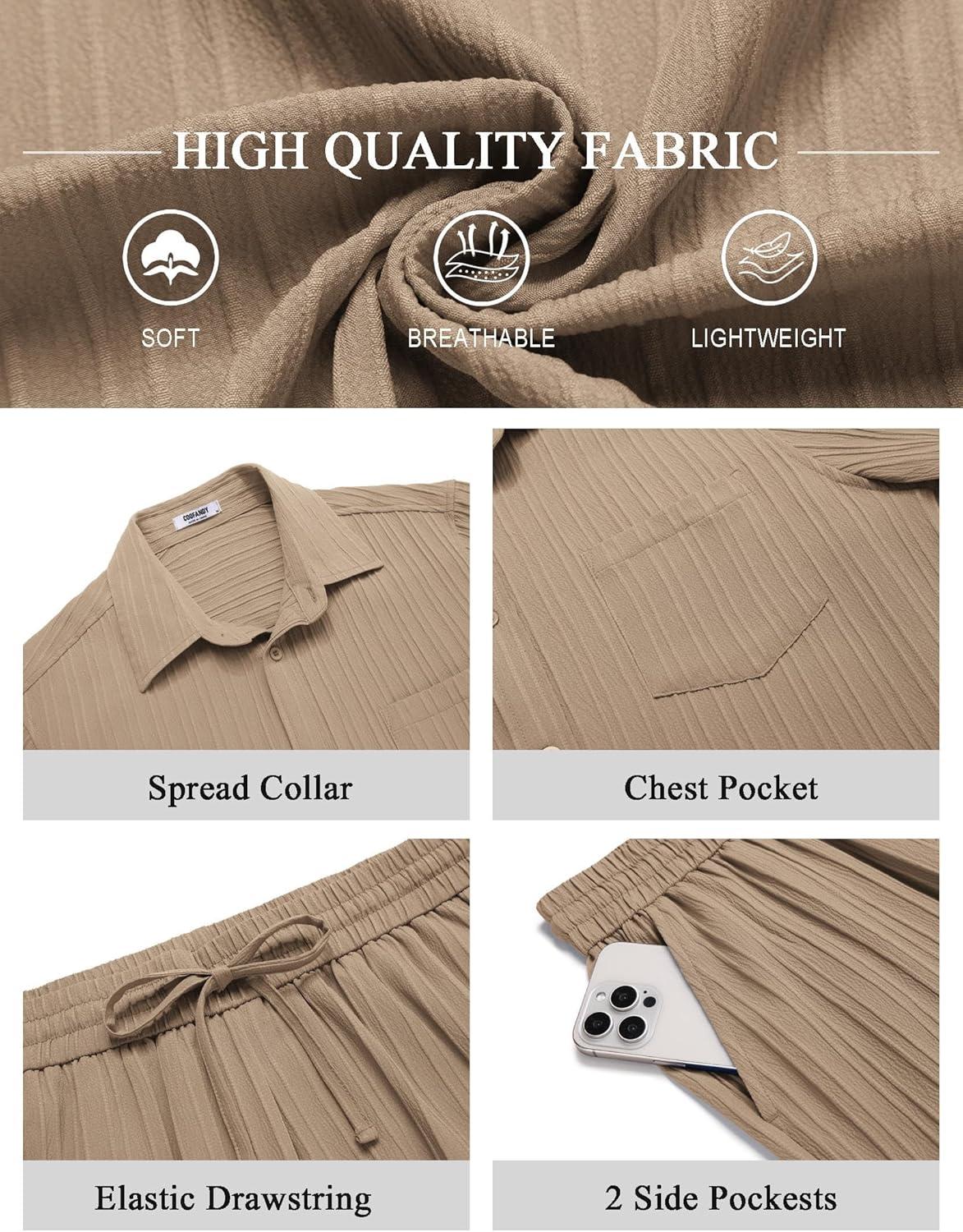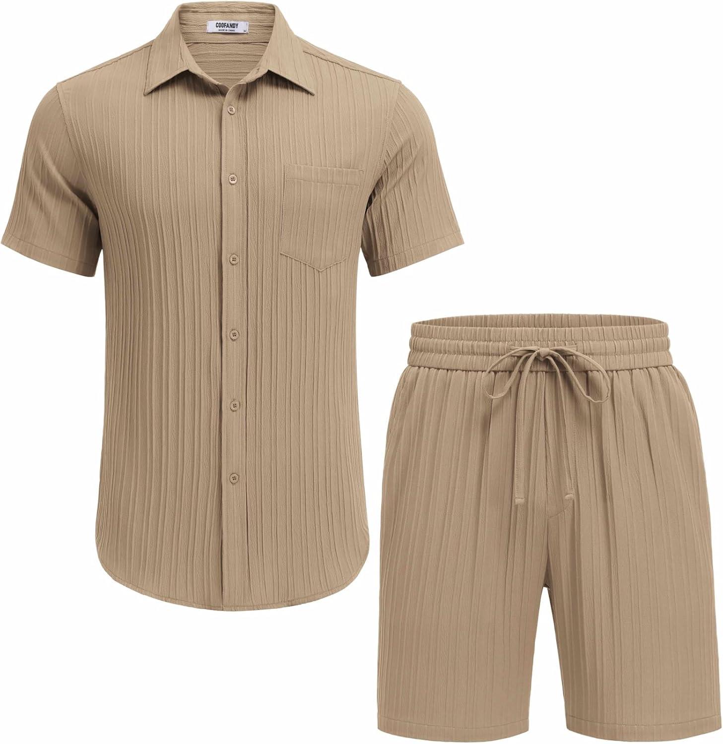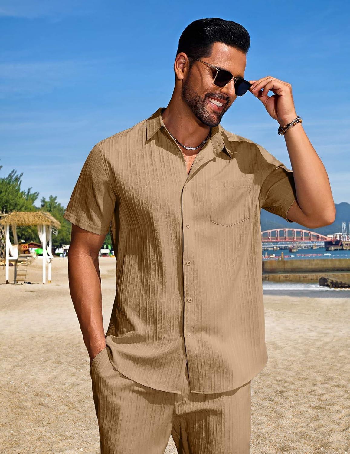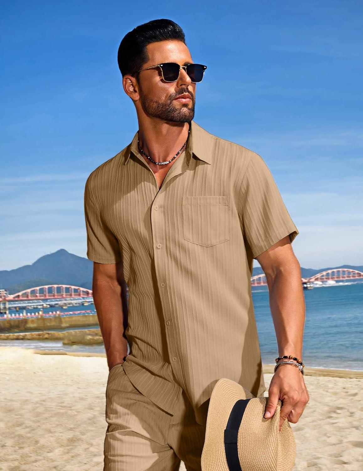 COOFANDY Mens Beach Outfits 2 Piece Sets Casual Short Sleeve Button Down Summer Textured Shirt(Khaki)