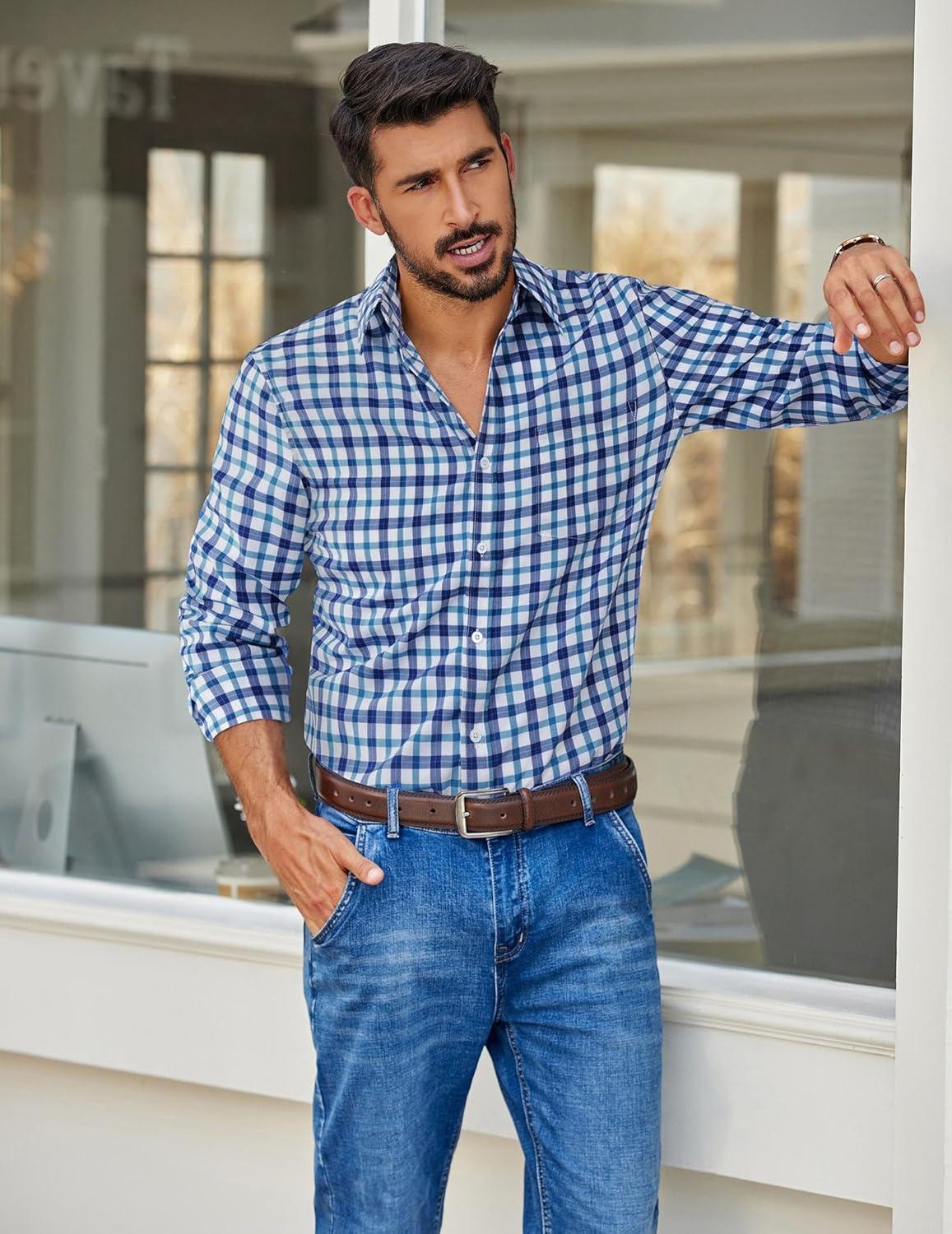 COOFANDY Mens Button Down Shirt Cotton Long Sleeves Dress Shirt Wrinkle Free Casual Plaid Shirt(Blue Gingham)