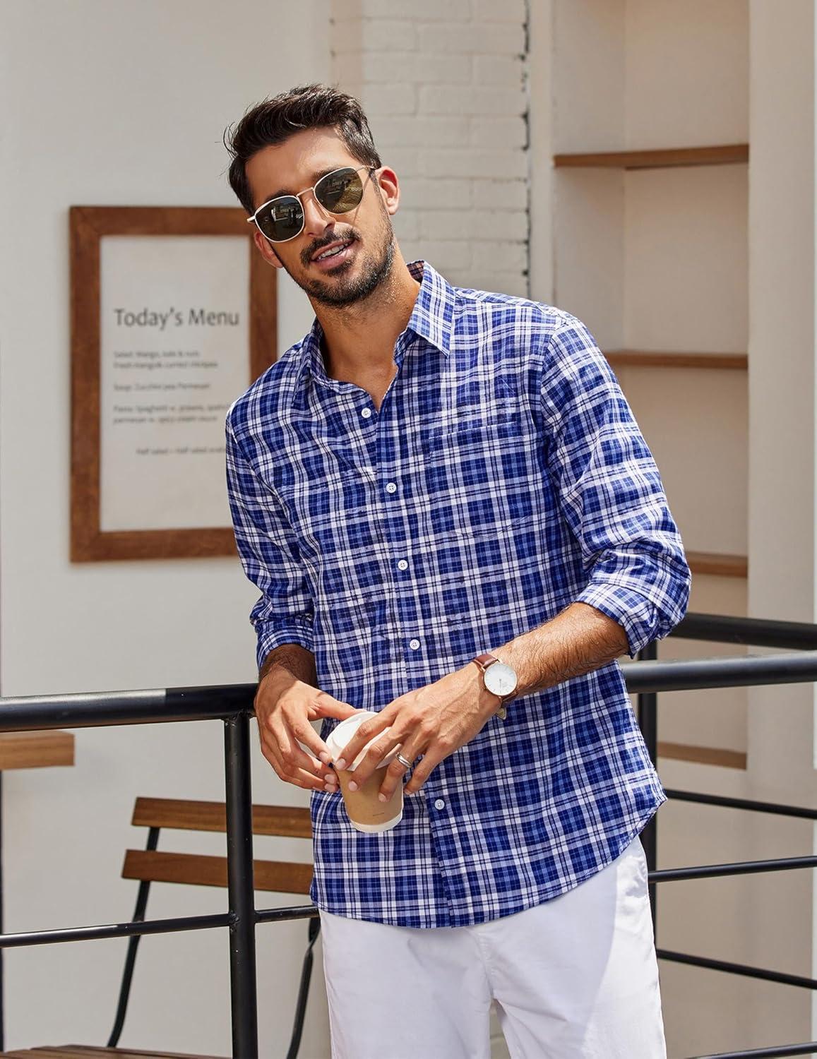 COOFANDY Mens Button Down Shirt Cotton Long Sleeves Dress Shirt Wrinkle Free Casual Plaid Shirt(Blue White Plaid)