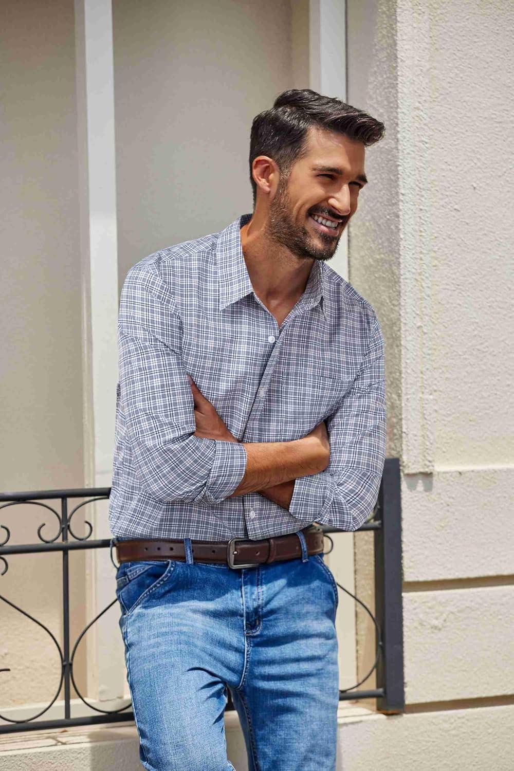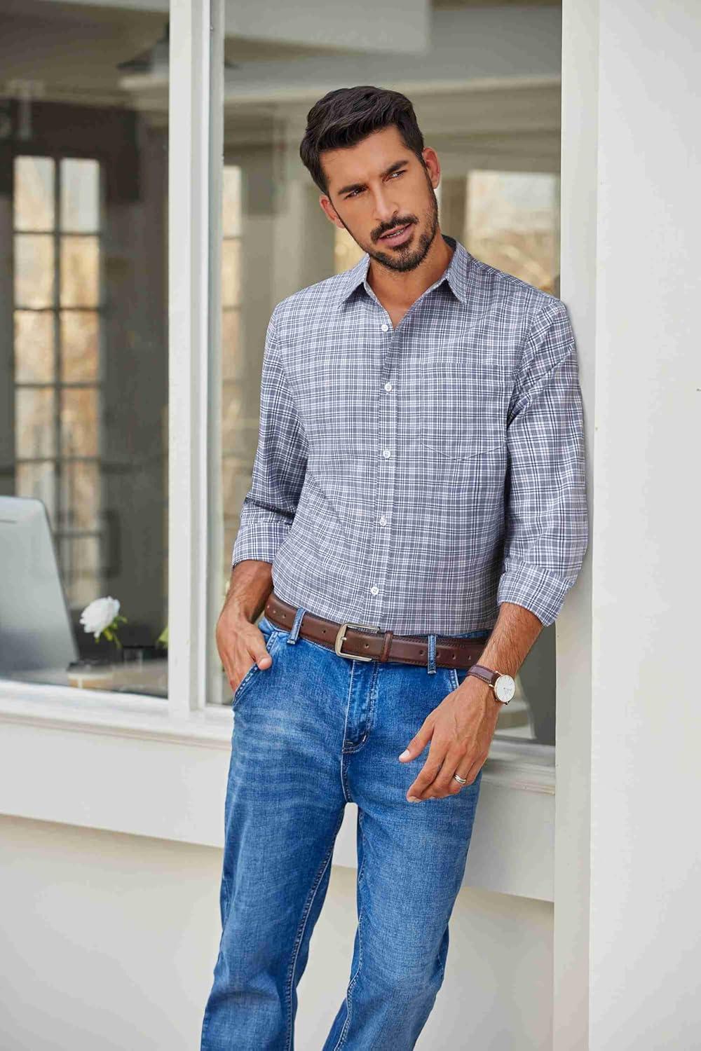 COOFANDY Mens Button Down Shirt Cotton Long Sleeves Dress Shirt Wrinkle Free Casual Plaid Shirt(Grey Plaid)