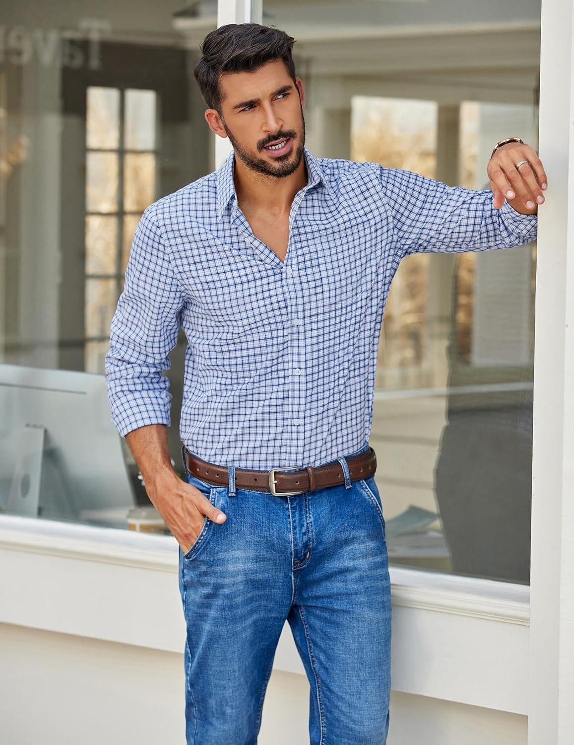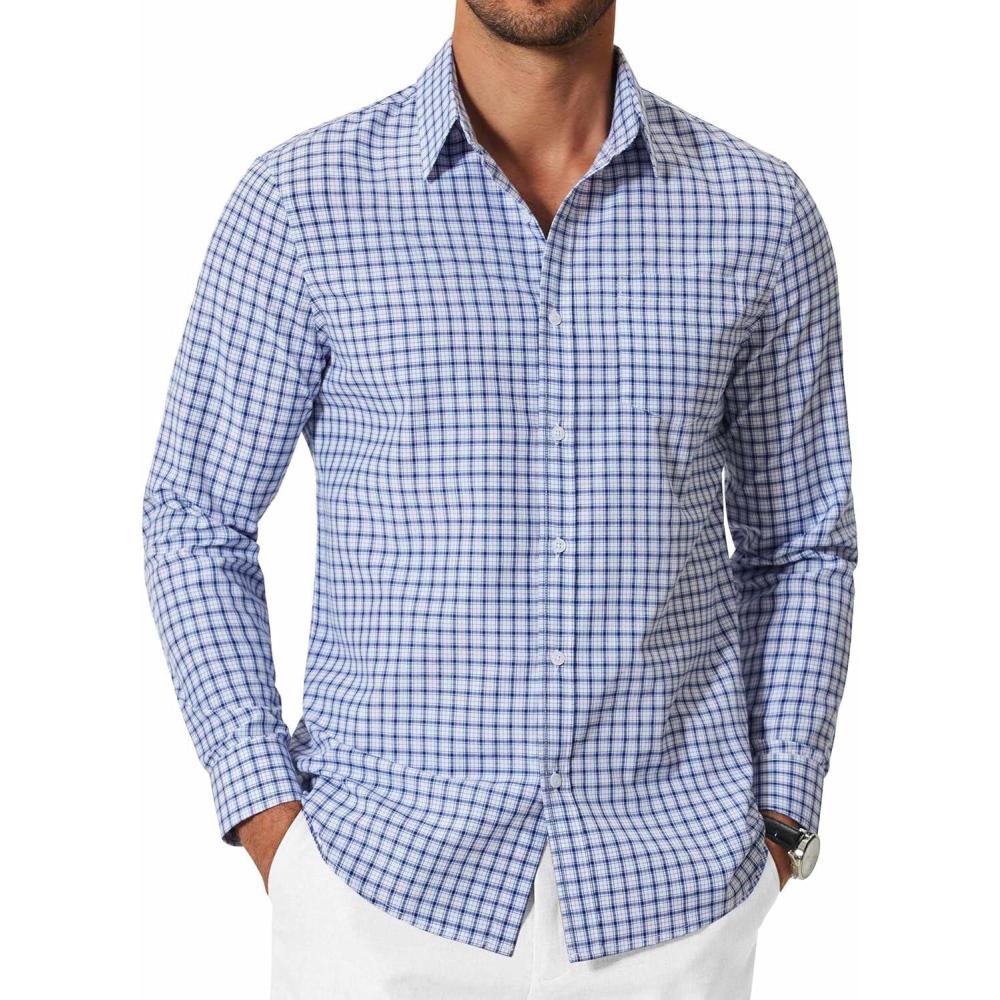 COOFANDY Mens Button Down Shirt Cotton Long Sleeves Dress Shirt Wrinkle Free Casual Plaid Shirt(White Blue Plaid)
