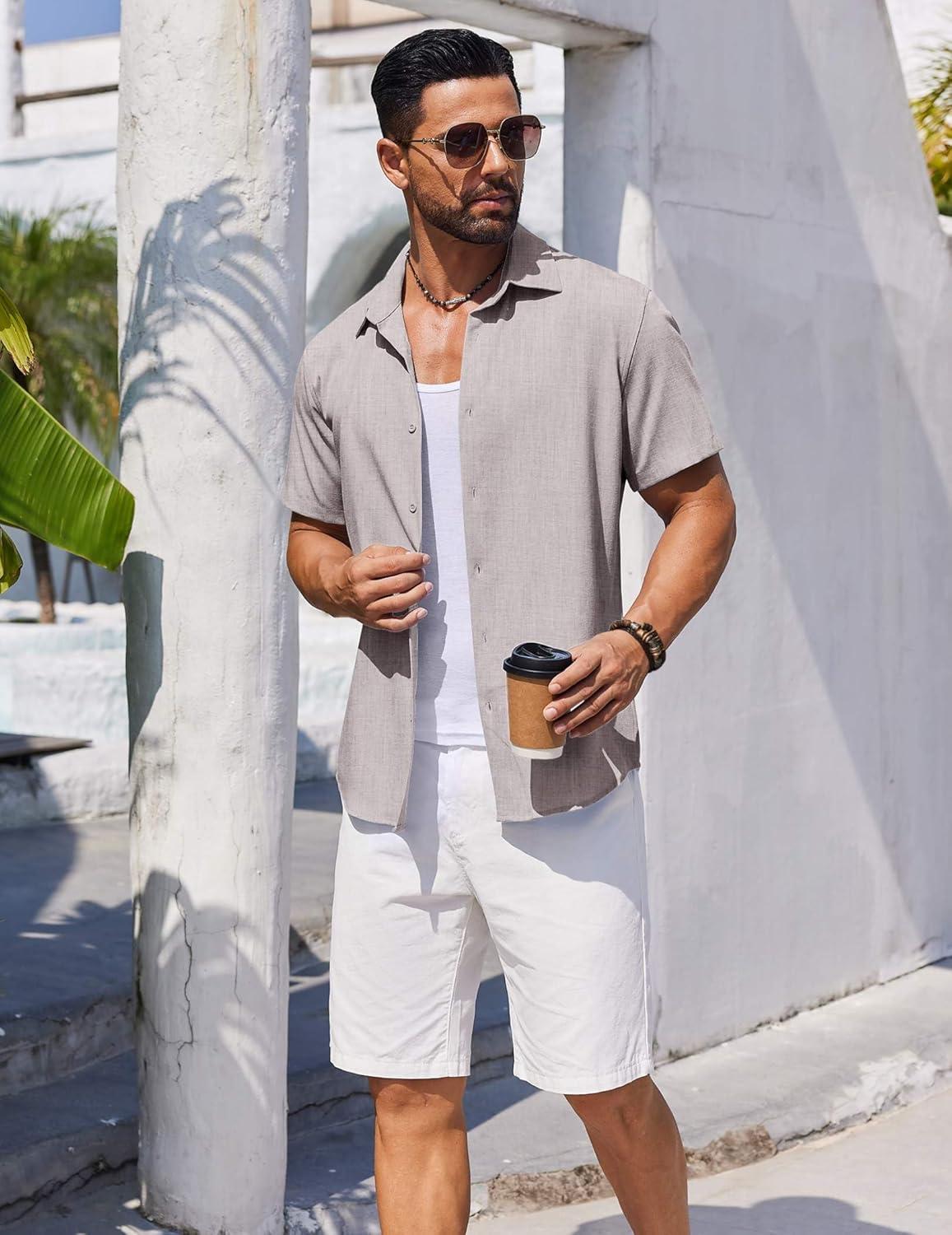 COOFANDY Mens Button Down Shirt Short Sleeve Casual Shirts Beach Summer Linen Shirts Wedding Vacation Shirt(Stone)