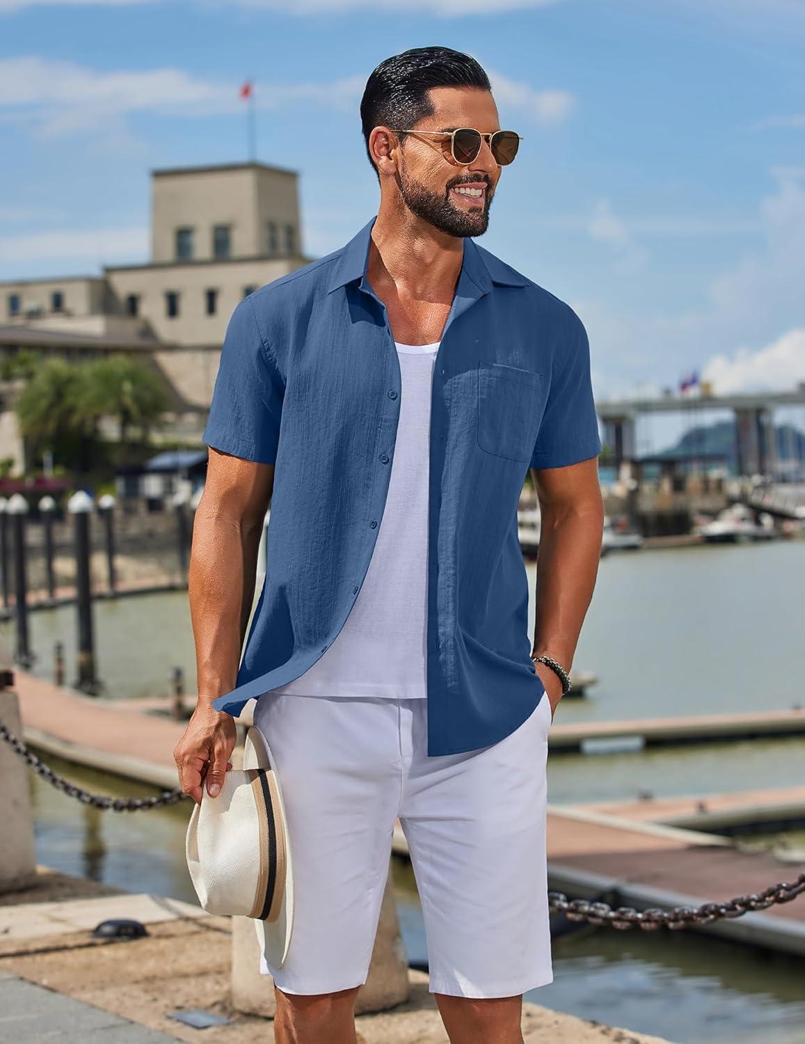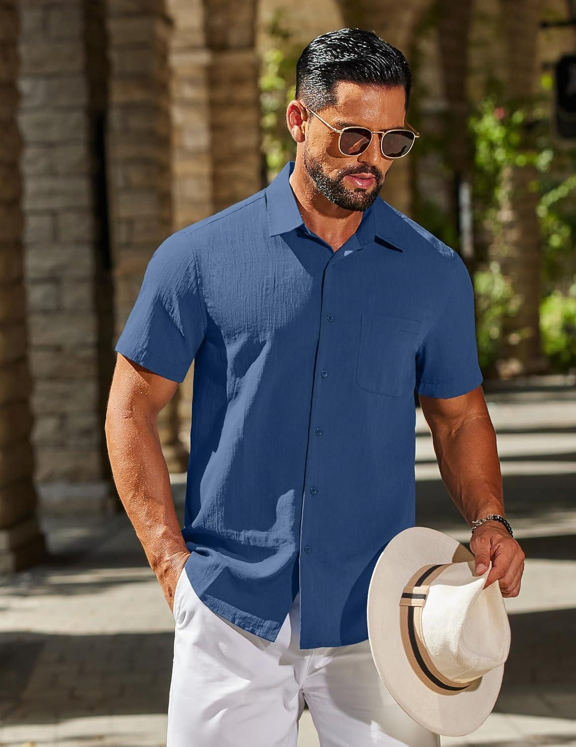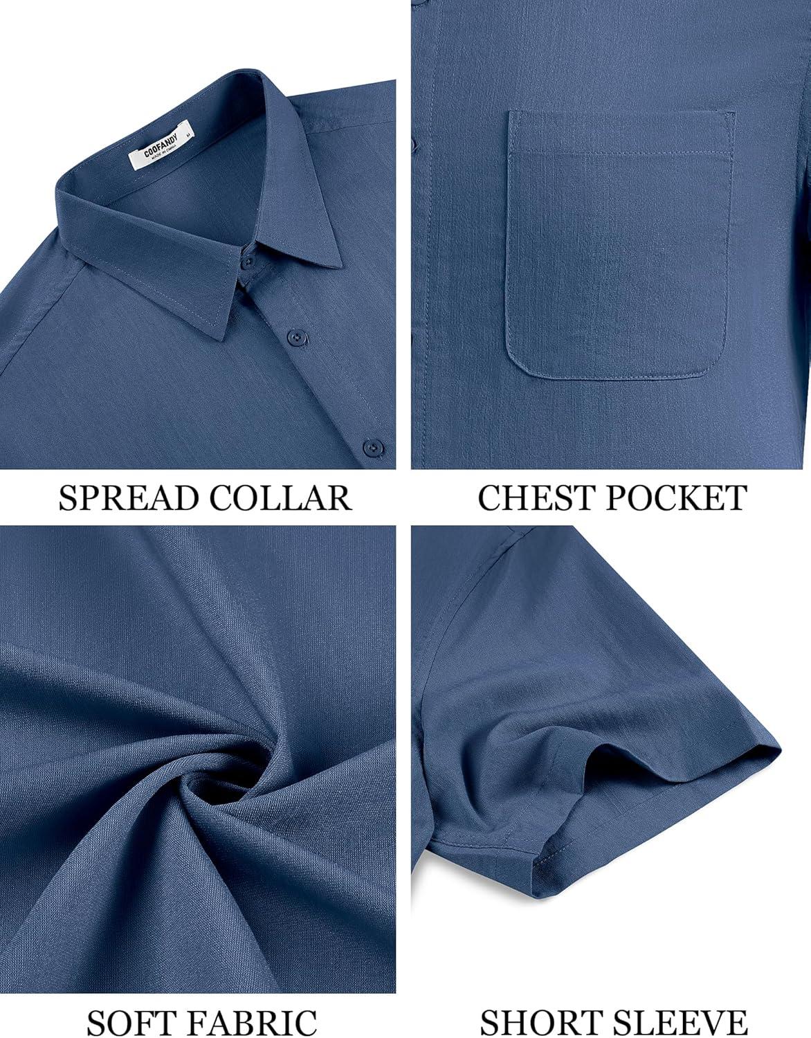 COOFANDY Men’s Button Down Shirts Casual Short Sleeve Linen Shirt Summer Beach Top with Pocket(Denim Blue)