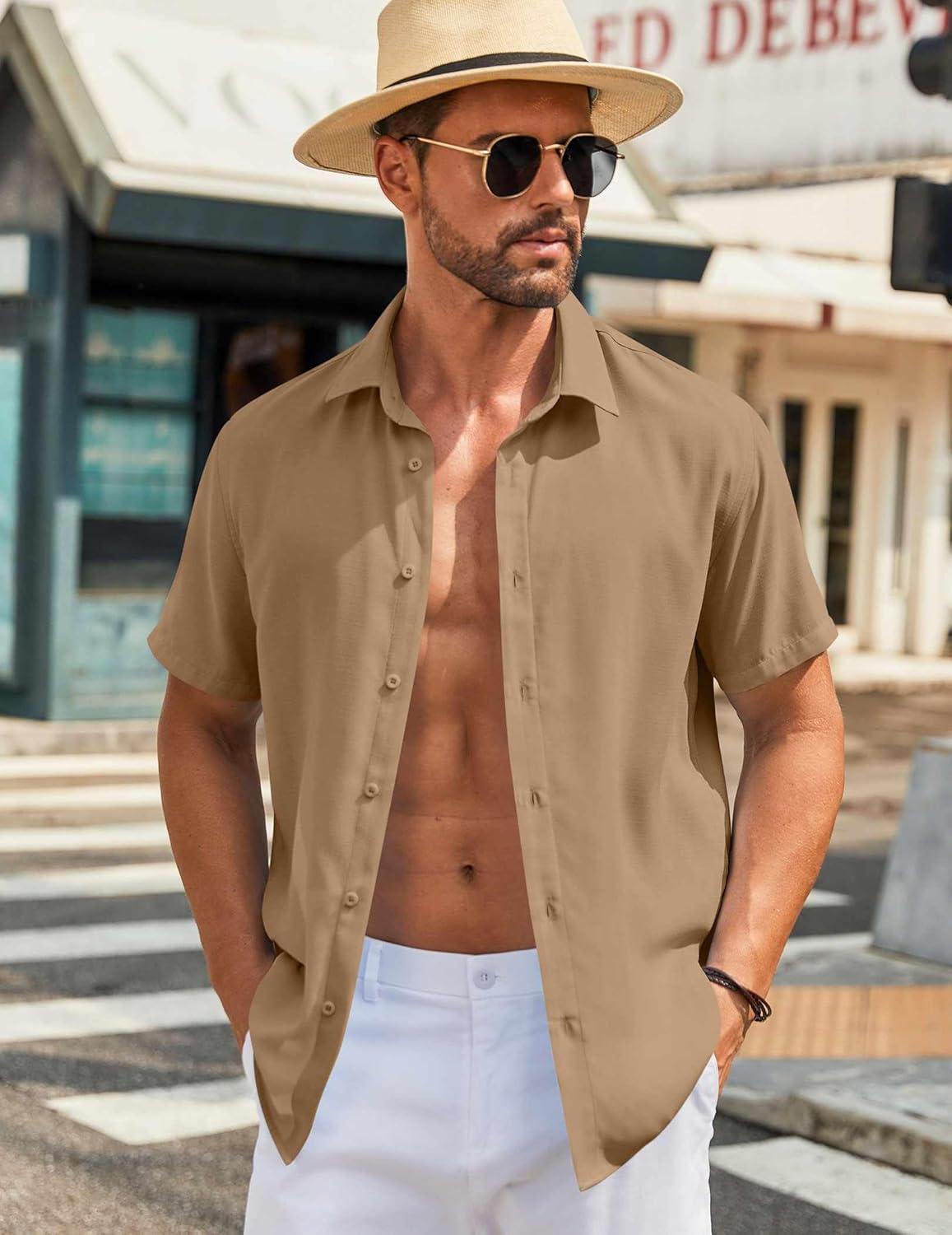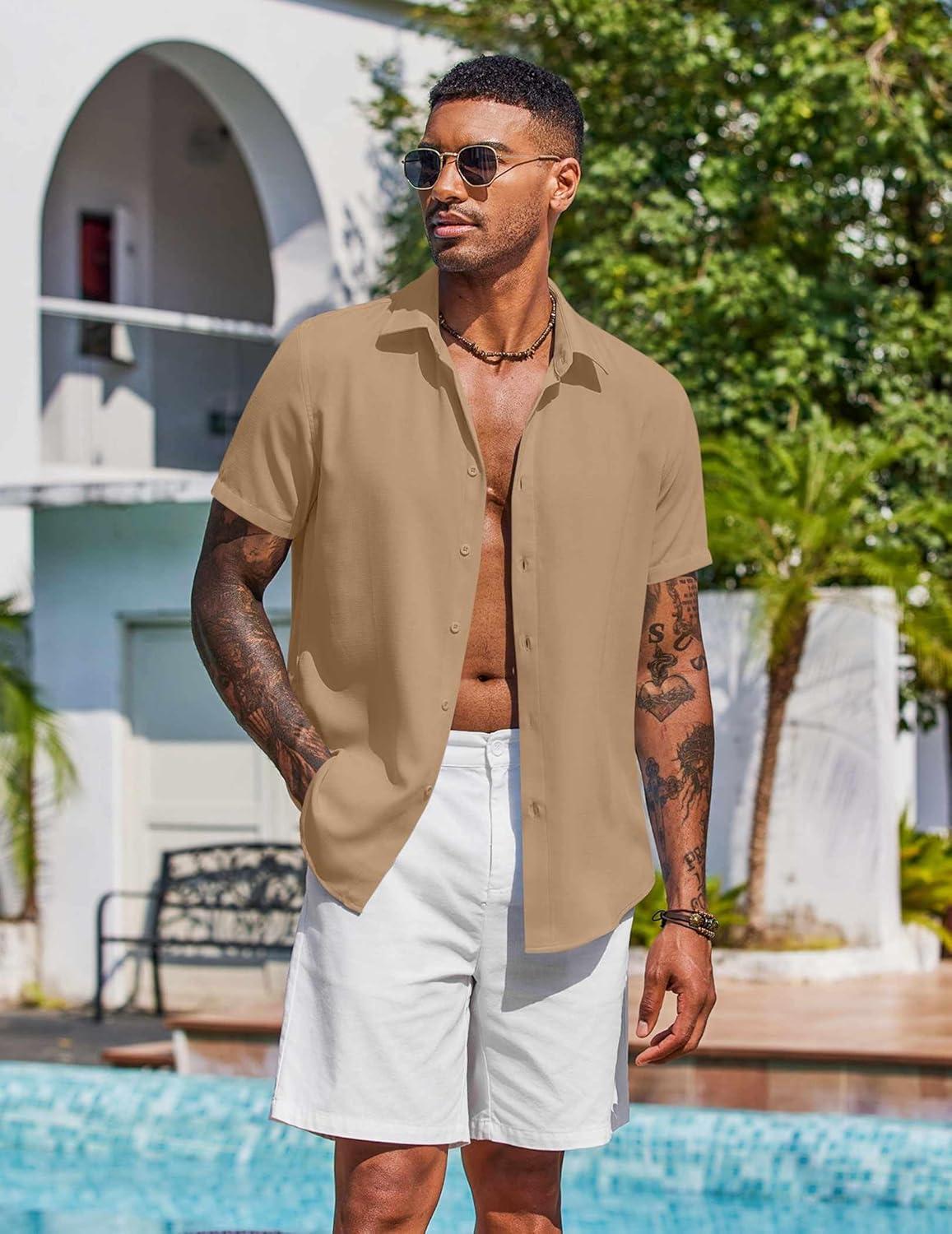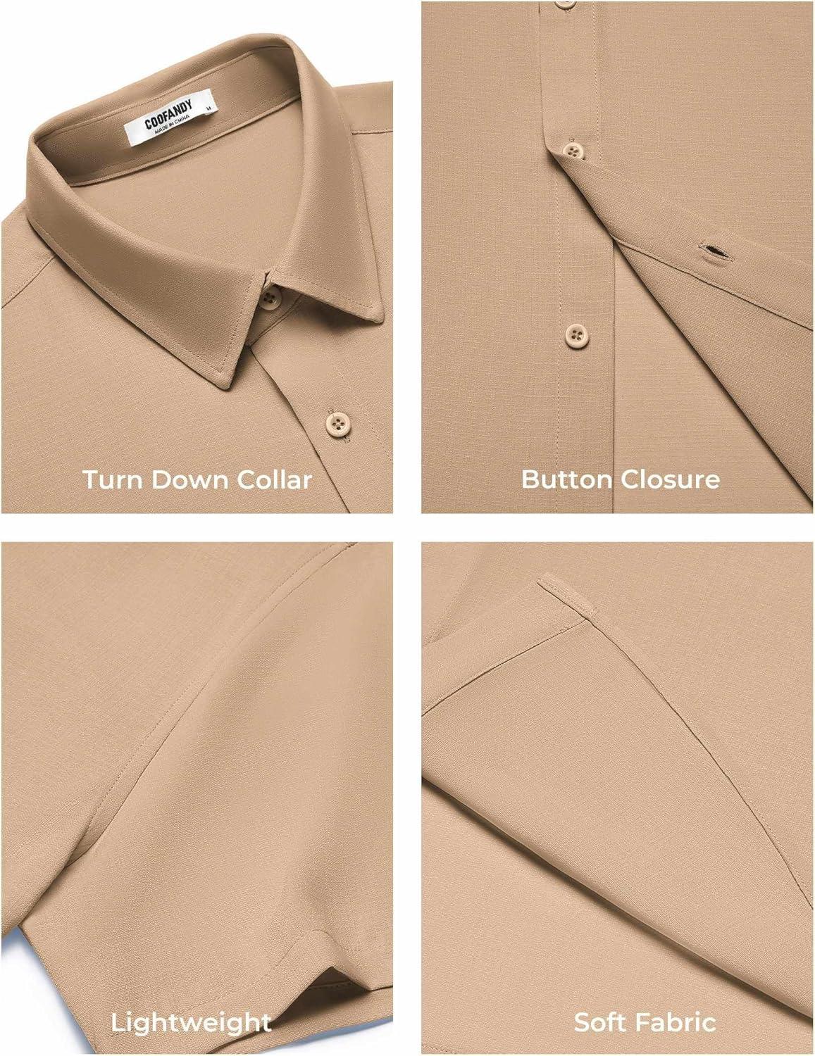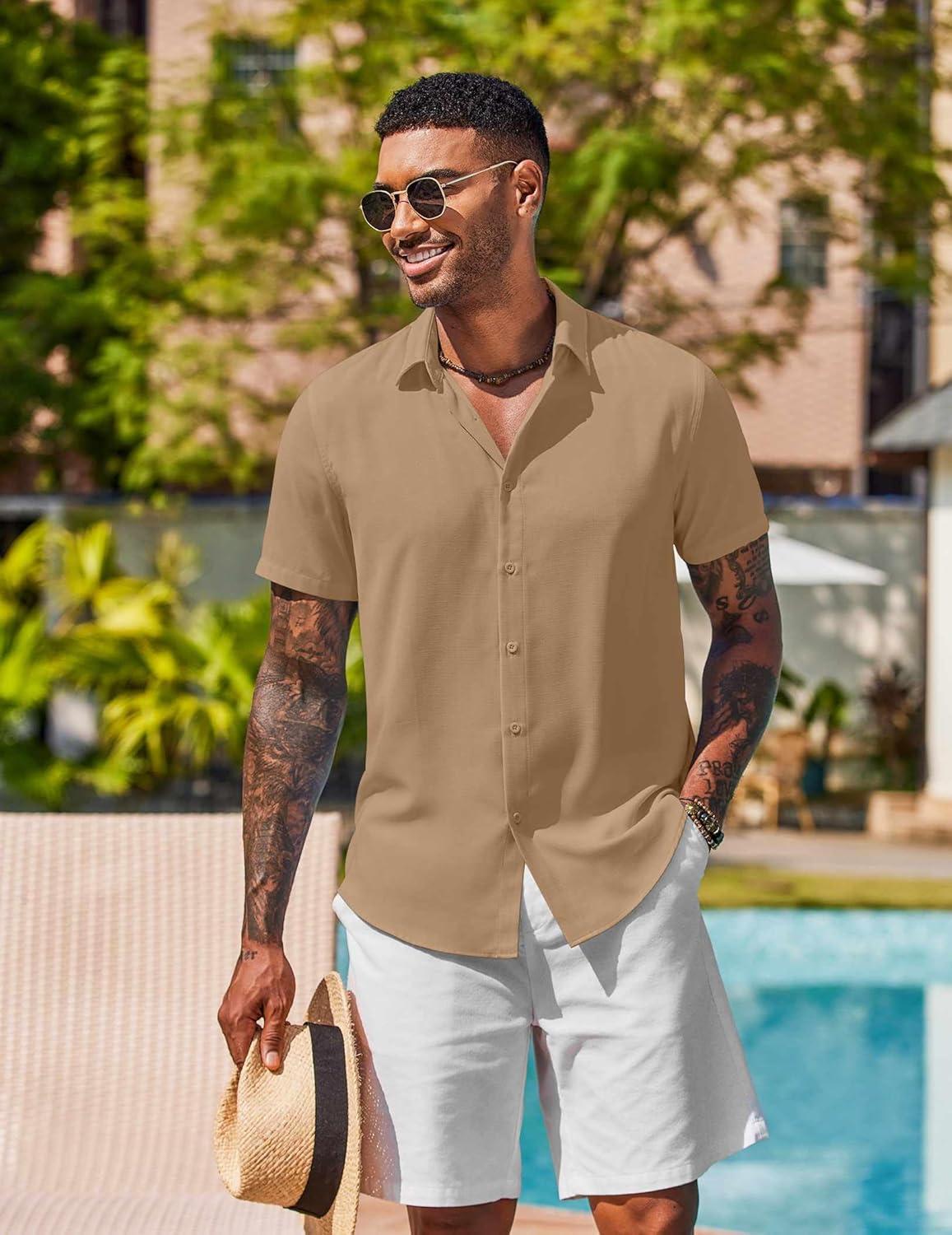 COOFANDY Mens Button Down Shirts Short Sleeve Casual Shirt Summer Beach Wedding Shirts(Khaki)