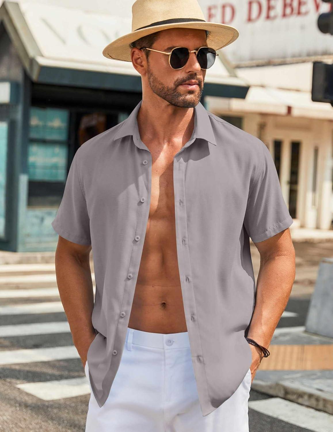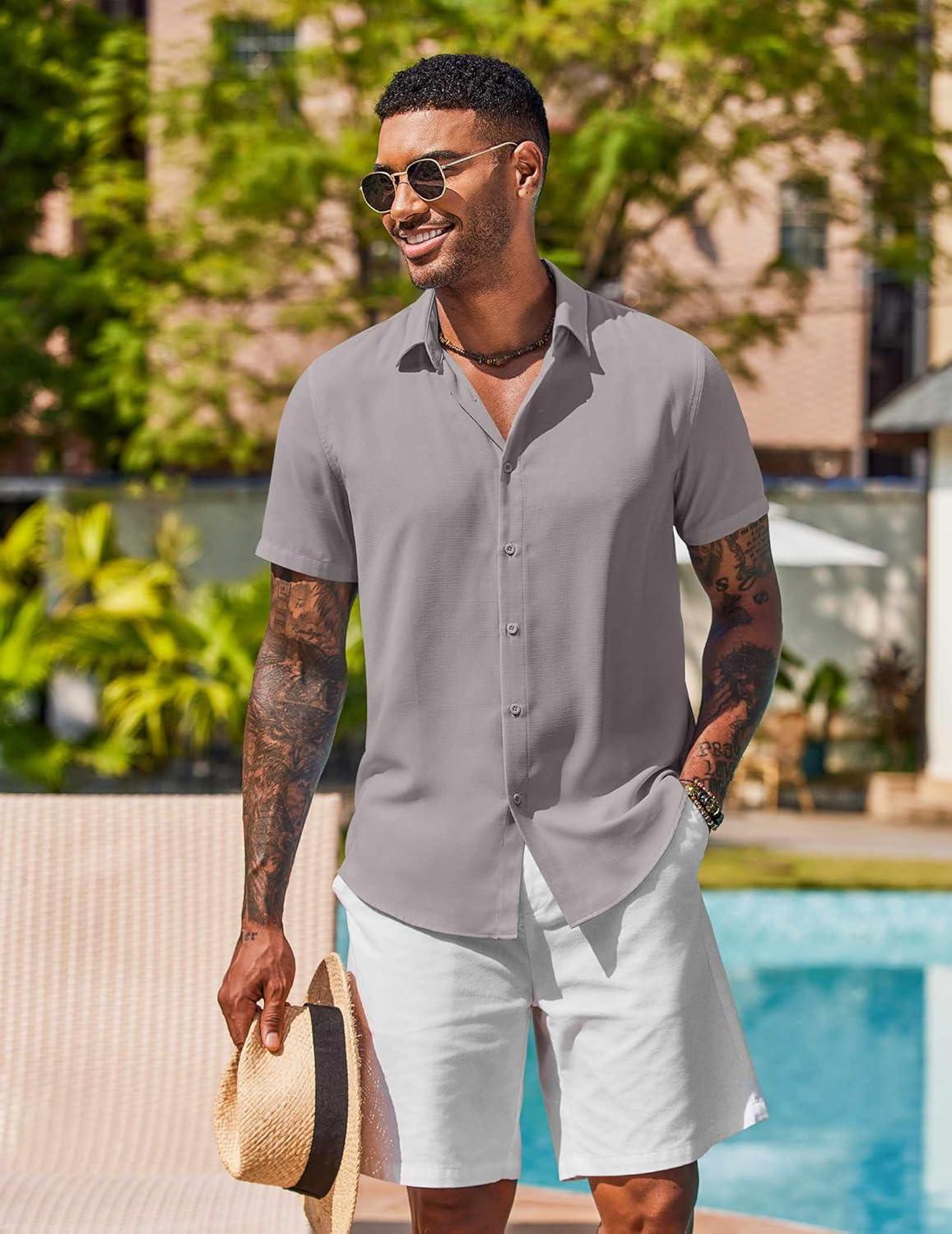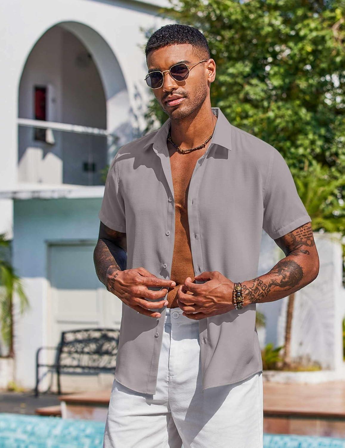 COOFANDY Mens Button Down Shirts Short Sleeve Casual Shirt Summer Beach Wedding Shirts(Light Grey)