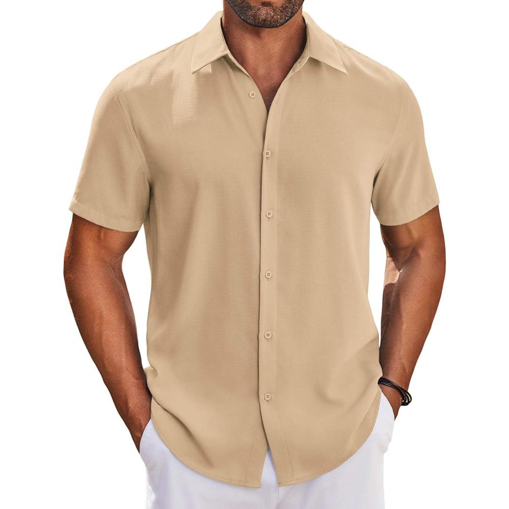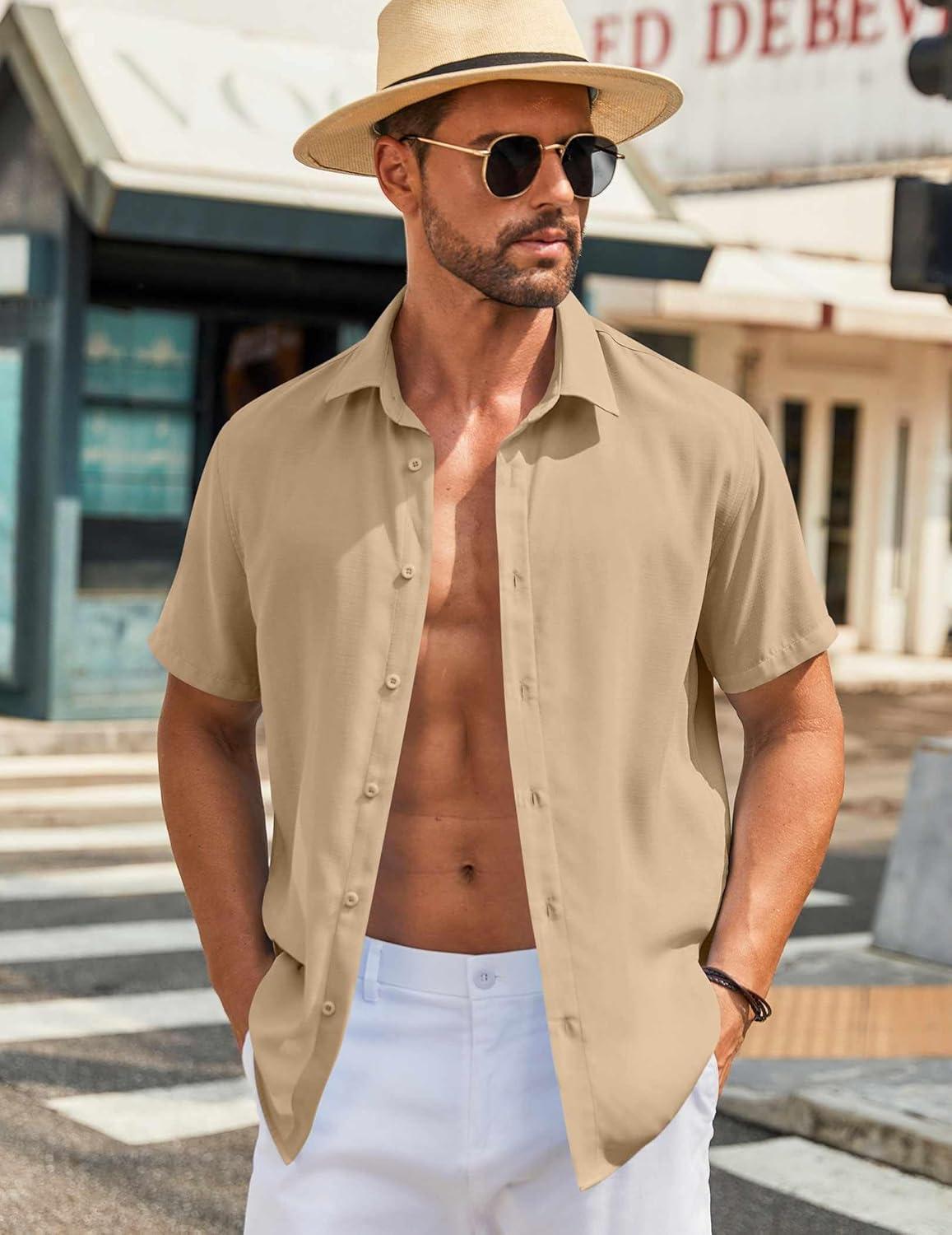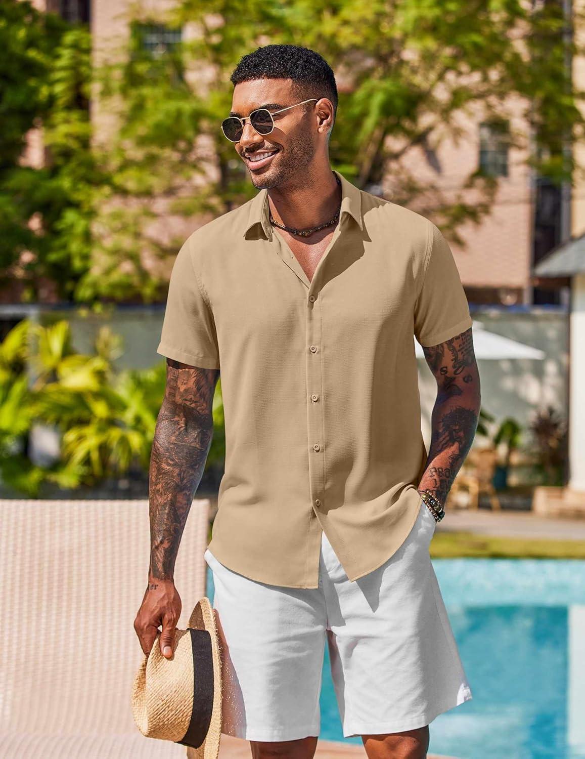 COOFANDY Mens Button Down Shirts Short Sleeve Casual Shirt Summer Beach Wedding Shirts(Light Khaki)