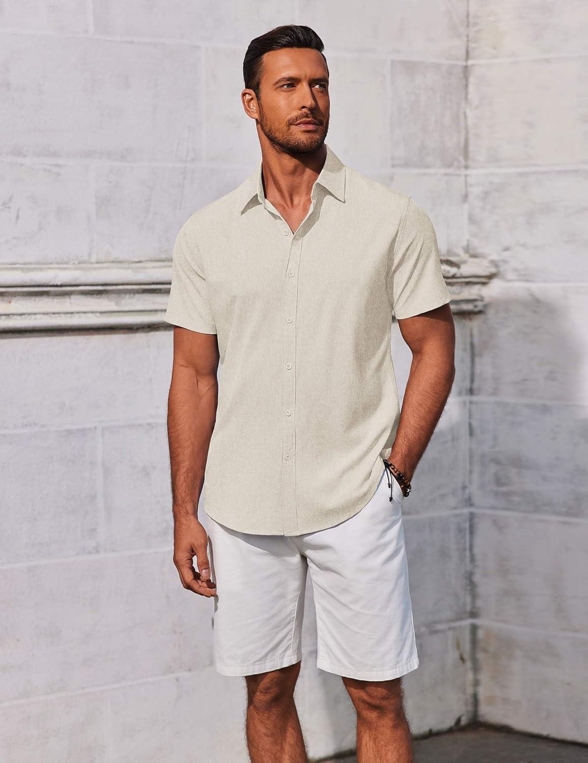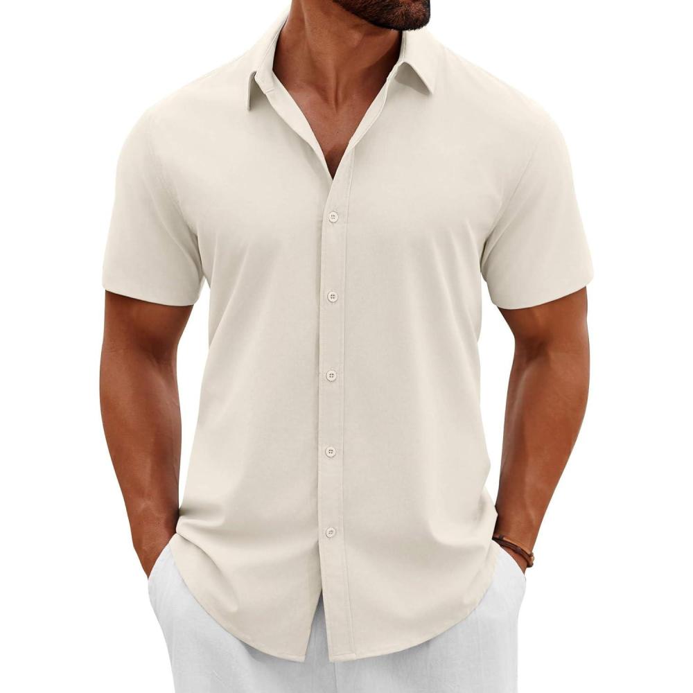 COOFANDY Men’s Button Down Shirts Short Sleeve Casual Summer Beach Shirts Vacation Wedding Shirts(Beige)