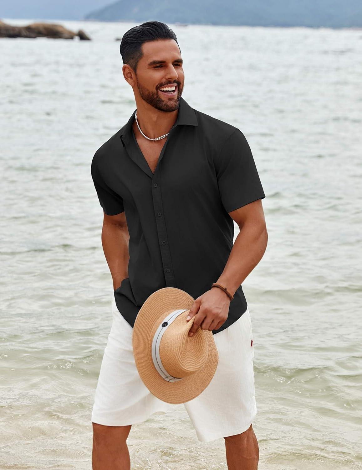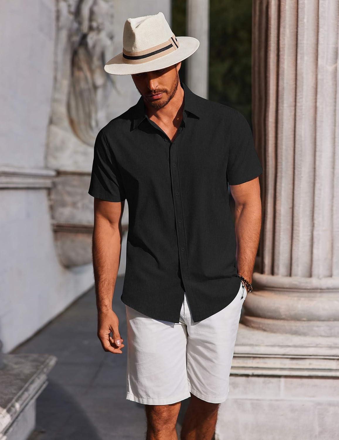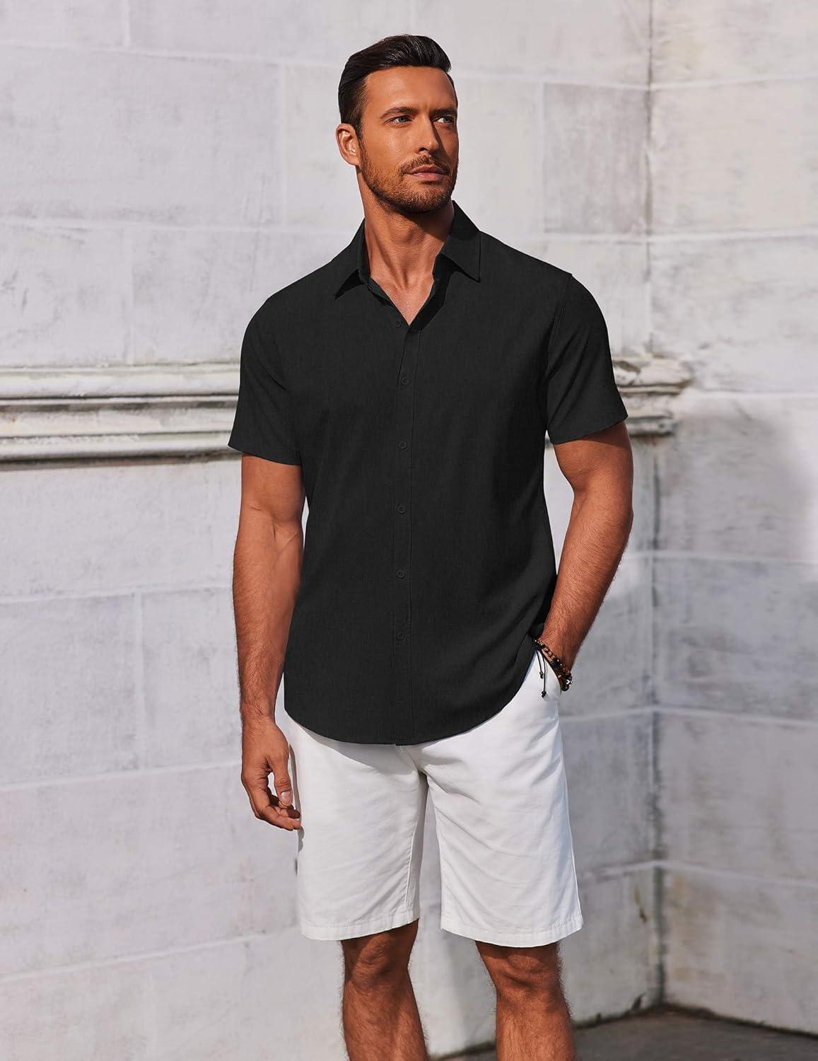COOFANDY Men’s Linen Shirts Short Sleeve Casual Shirts Button Down Shirt for Men Beach Summer Wedding Shirt(Black)