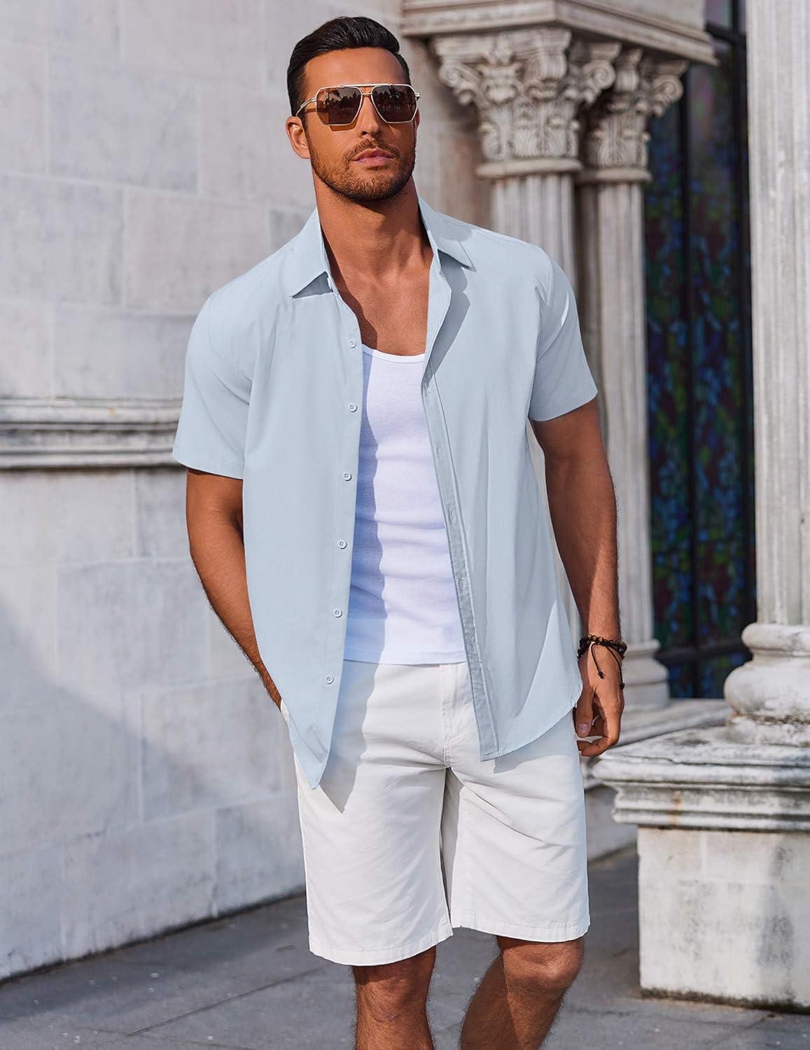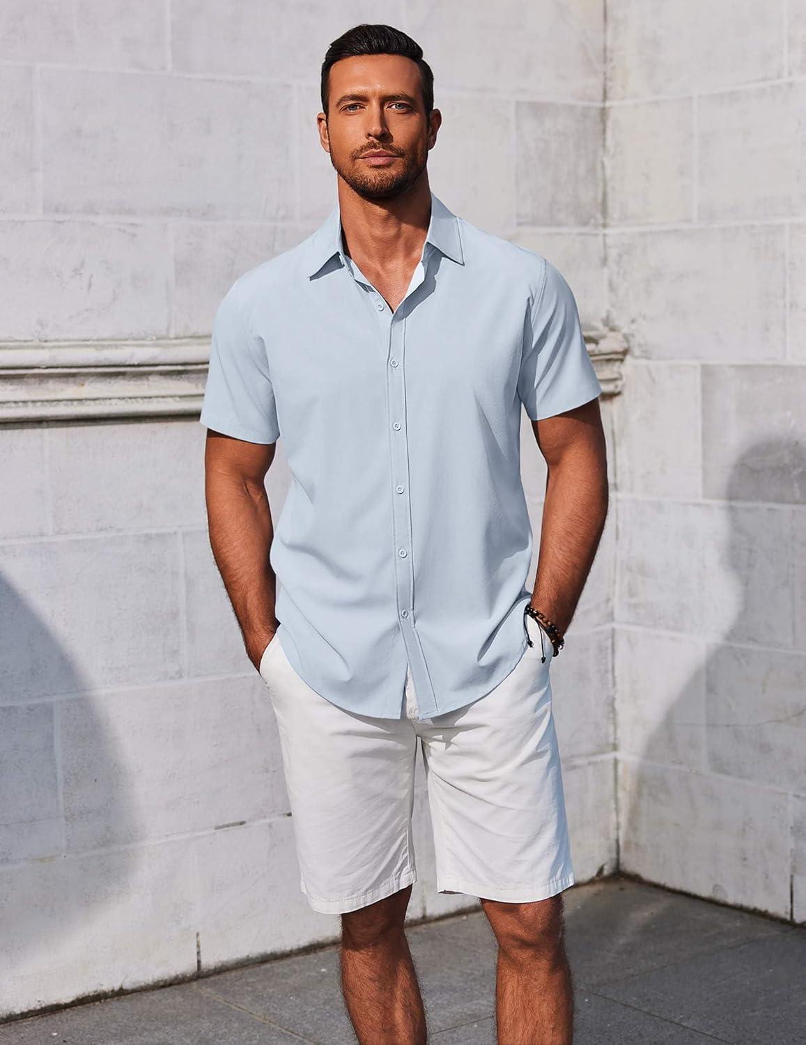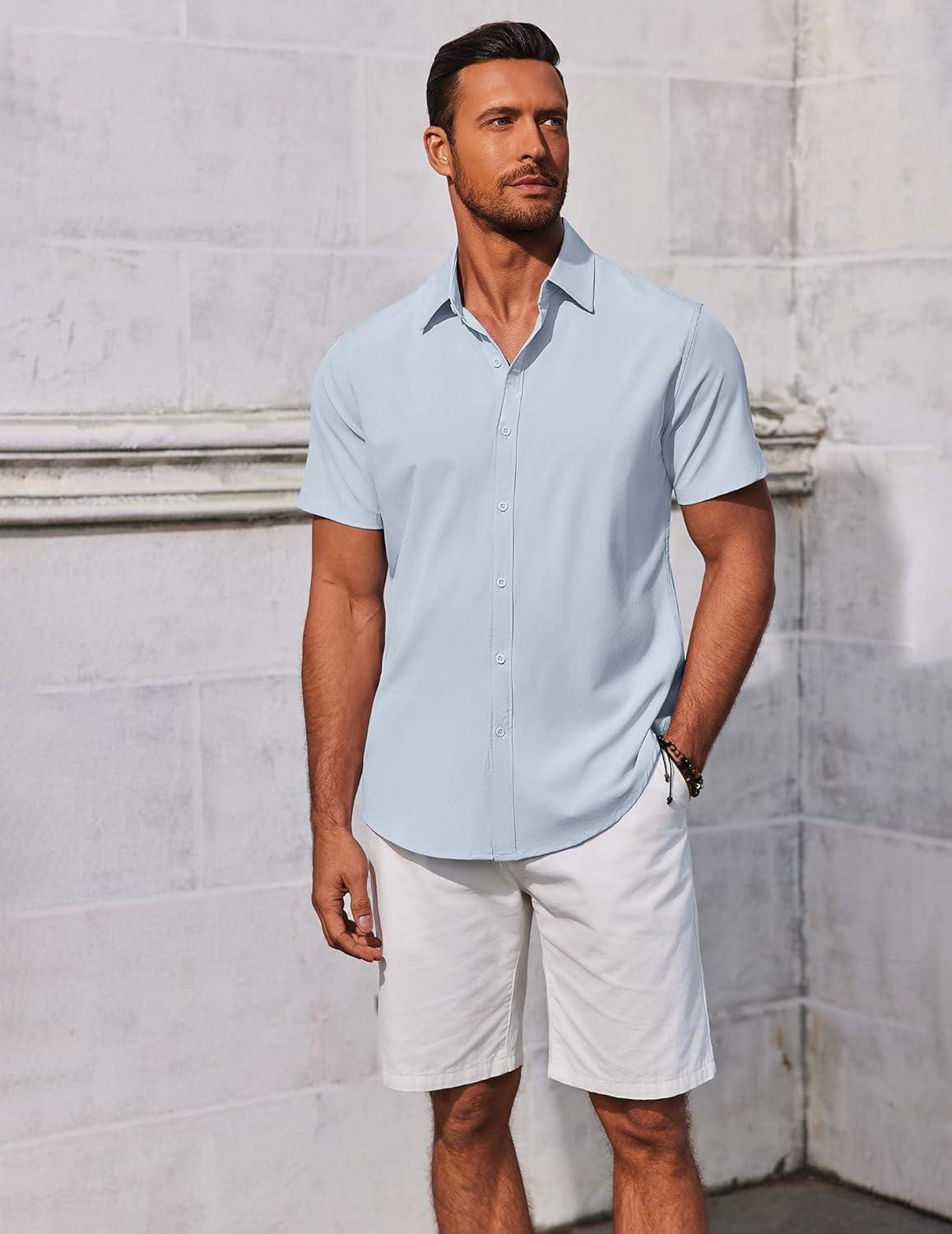 COOFANDY Men’s Button Down Shirts Short Sleeve Casual Summer Beach Shirts Vacation Wedding Shirts(Light Blue)