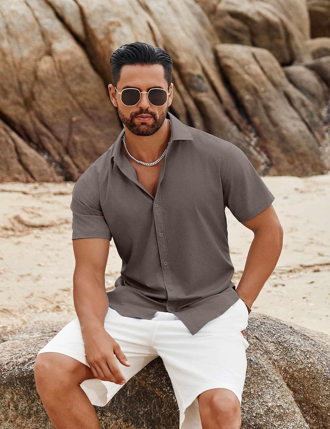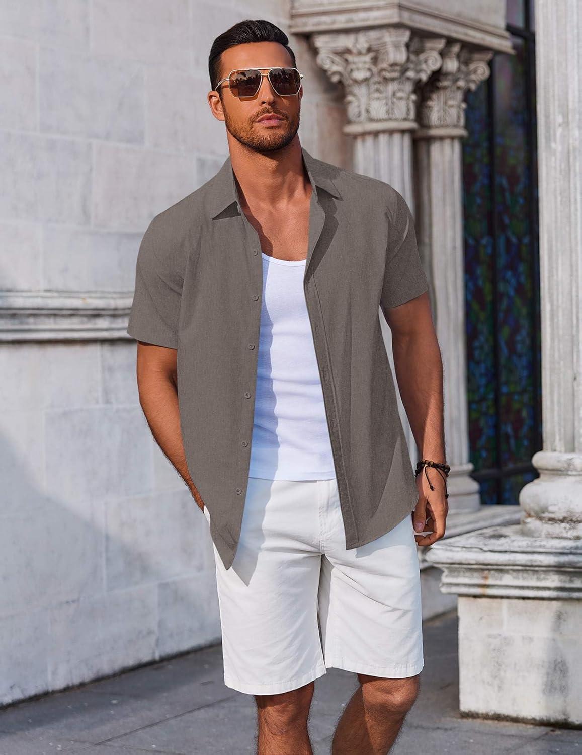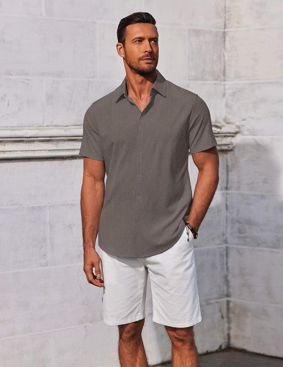 COOFANDY Men’s Linen Shirts Short Sleeve Casual Shirts Button Down Shirt for Men Beach Summer Wedding Shirt(Dark Grey)