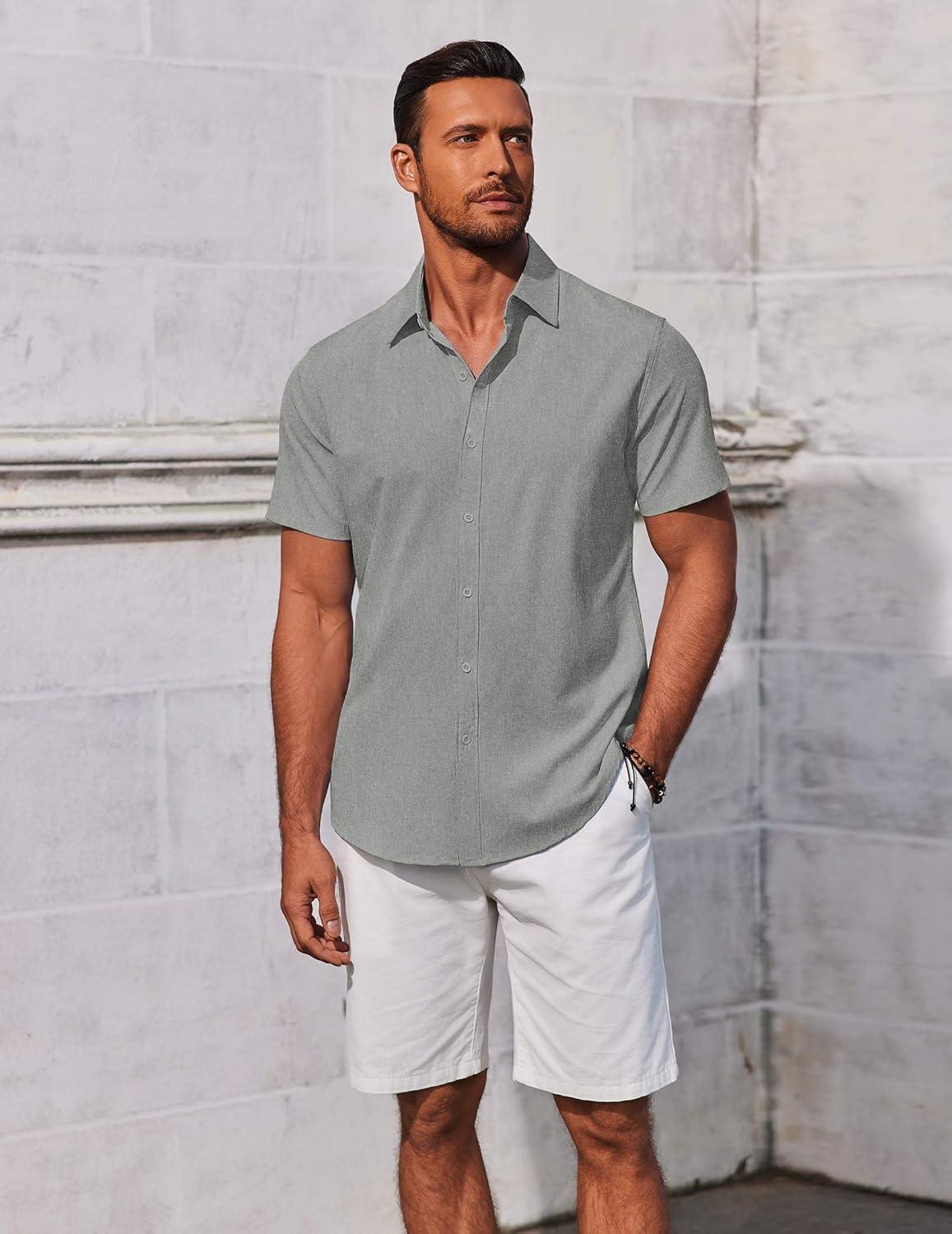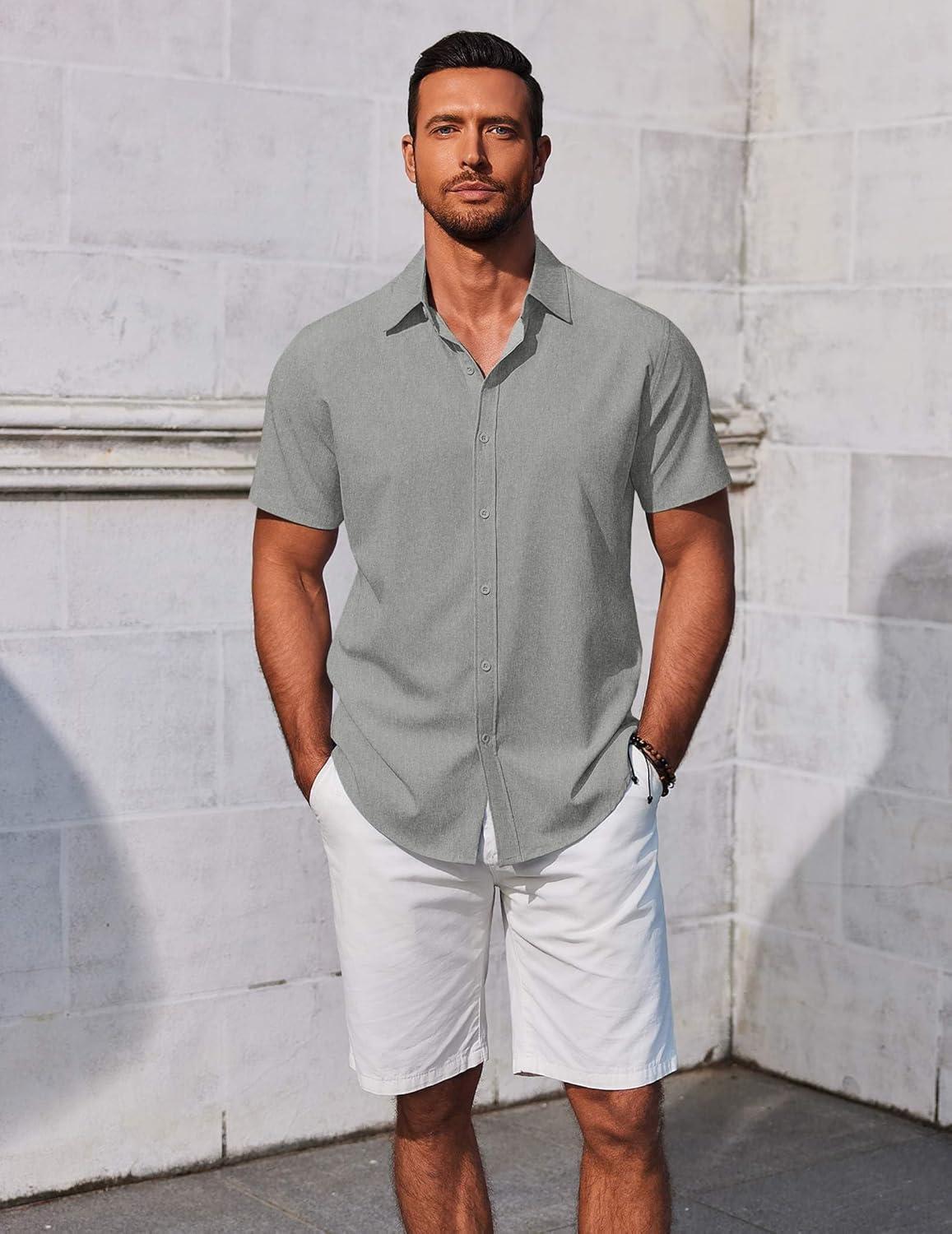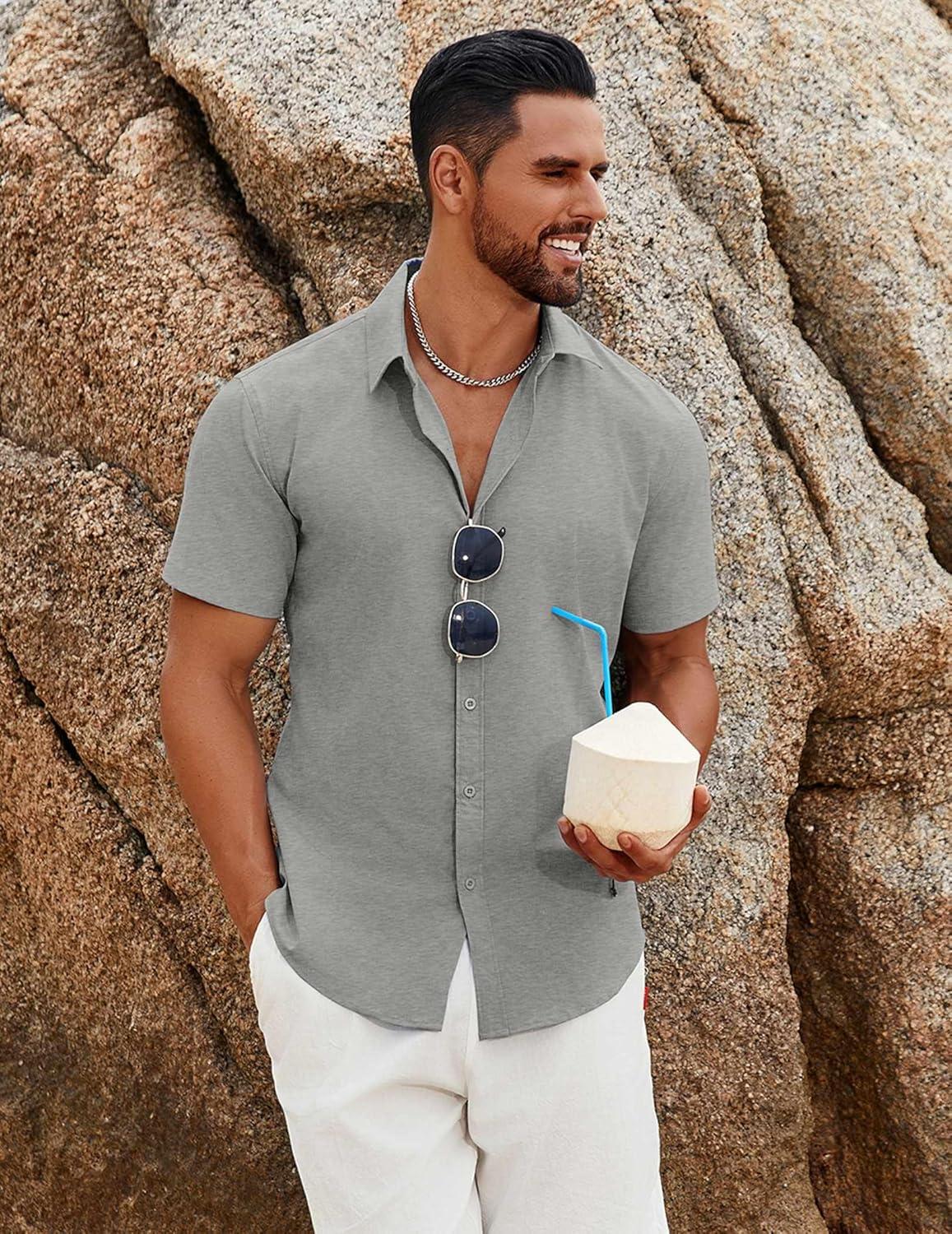 COOFANDY Men’s Button Down Shirts Short Sleeve Casual Summer Beach Shirts Vacation Wedding Shirts(Light Grey)