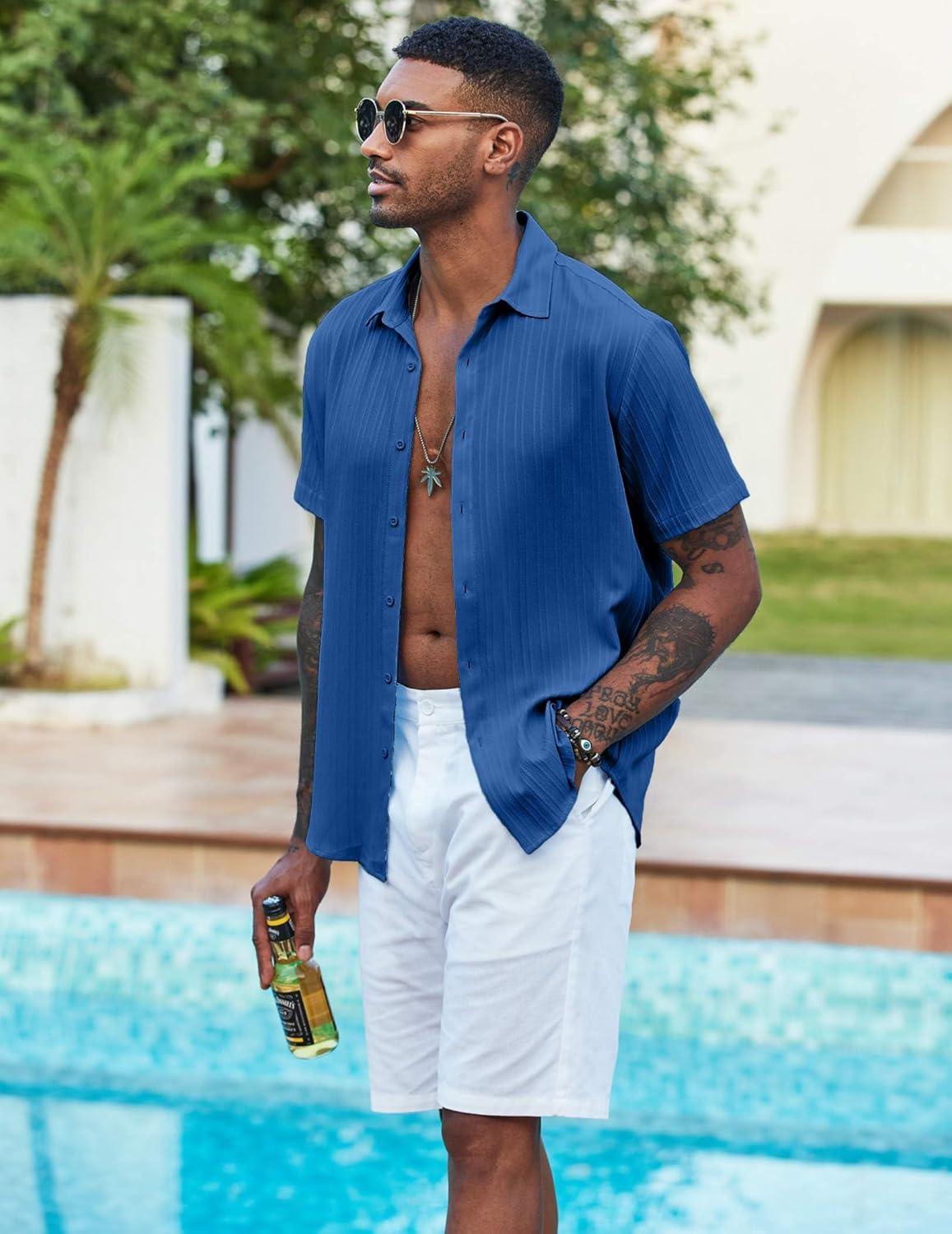 COOFANDY Mens Button Down Short Sleeve Shirt Casual Beach Shirt Summer Vacation Textured Shirts(Dark Blue)