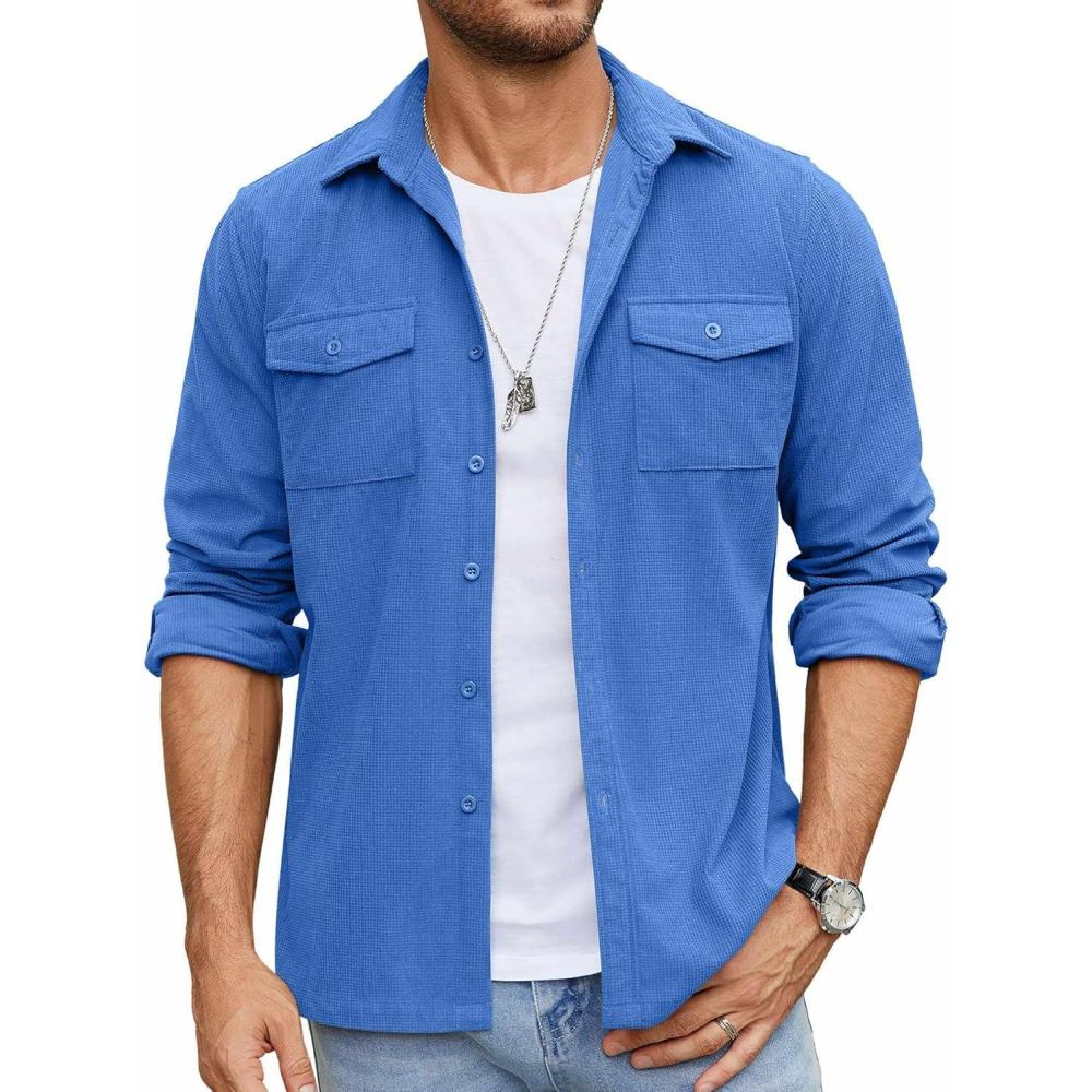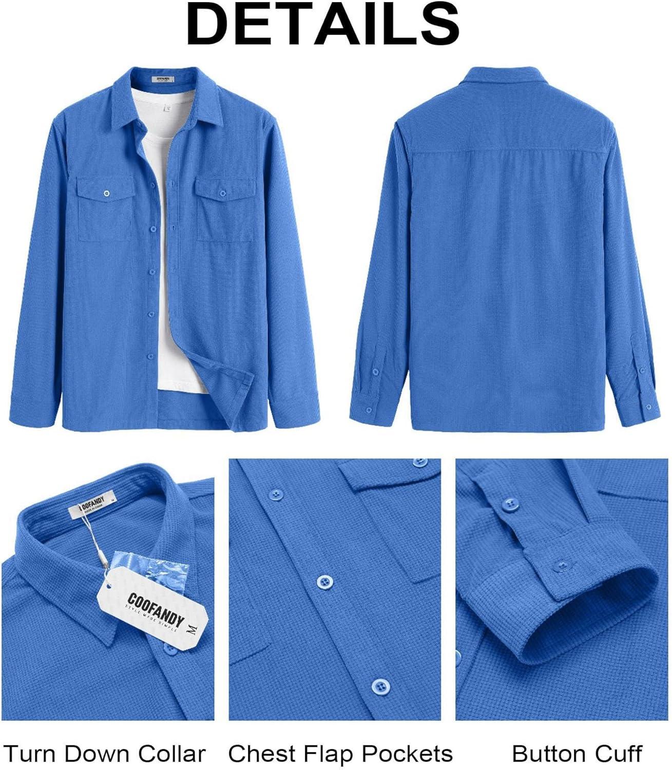 COOFANDY Men’s Button Down Waffle Shirt Jacket Casual Long Sleeve Shacket Lightweight Overshirts with Flap Pockets(Blue)