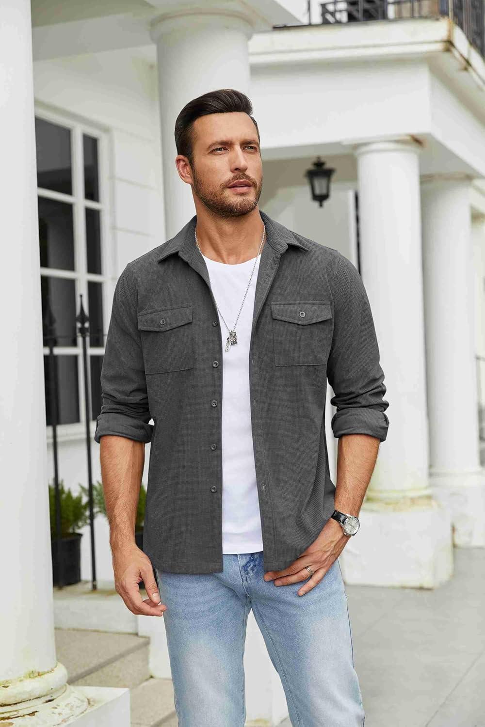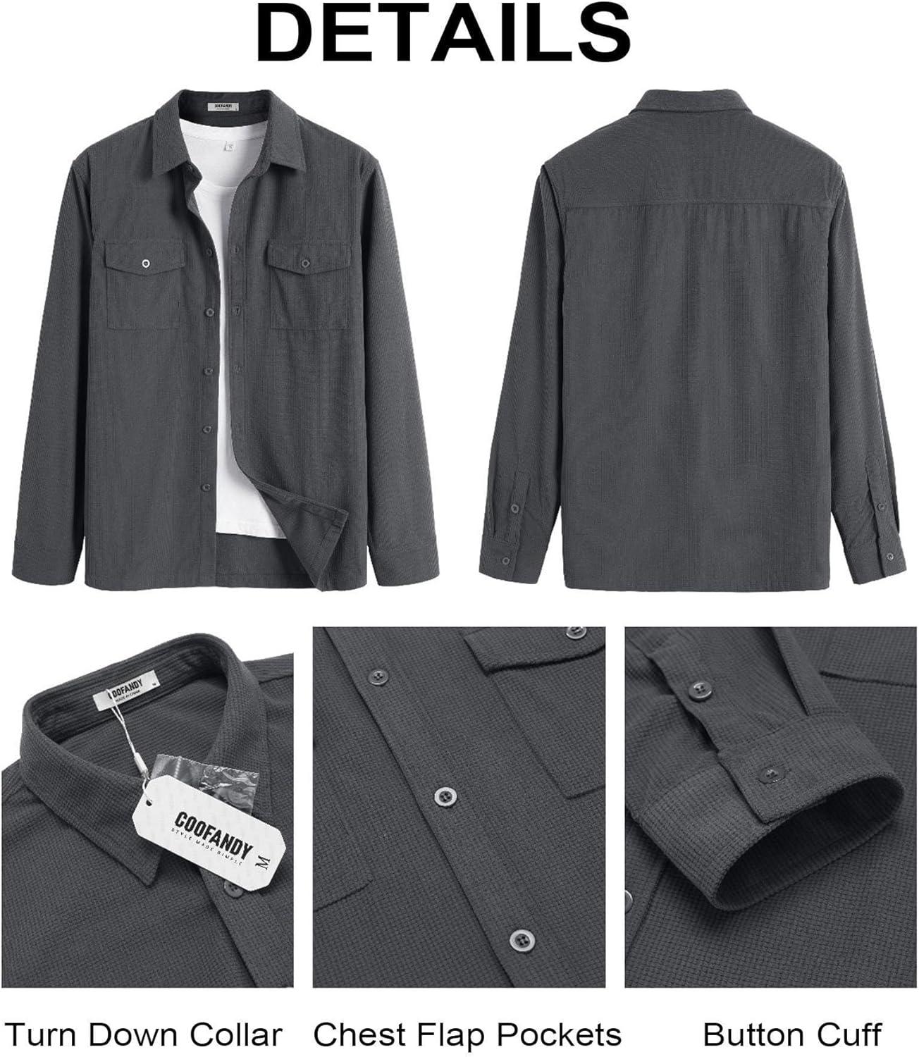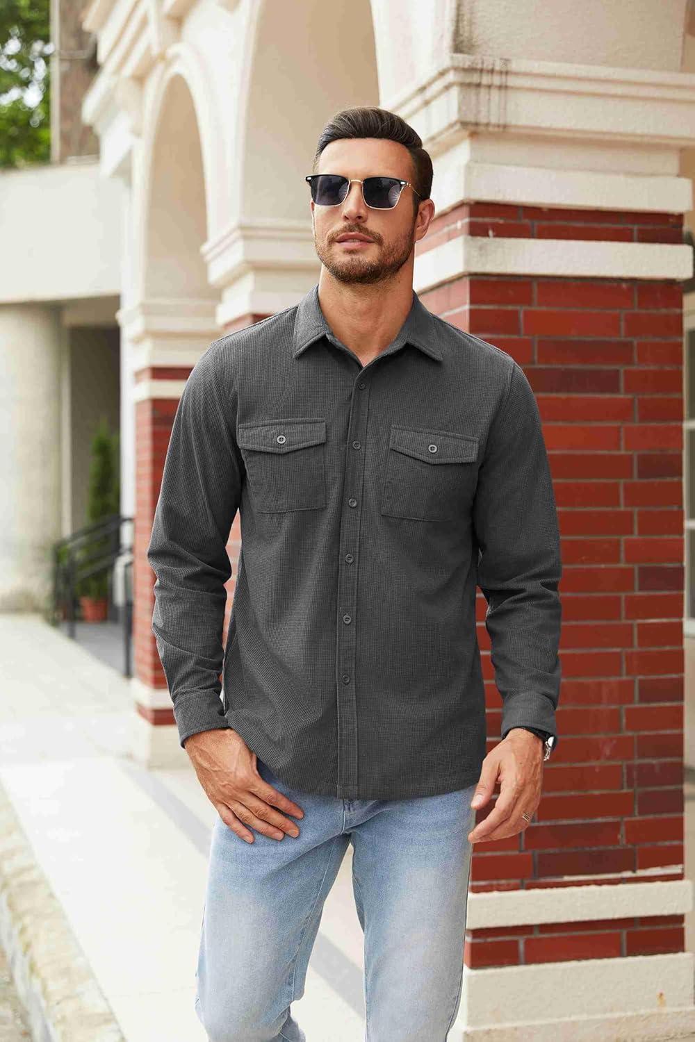 COOFANDY Men’s Button Down Waffle Shirt Jacket Casual Long Sleeve Shacket Lightweight Overshirts with Flap Pockets(Dark Gray)
