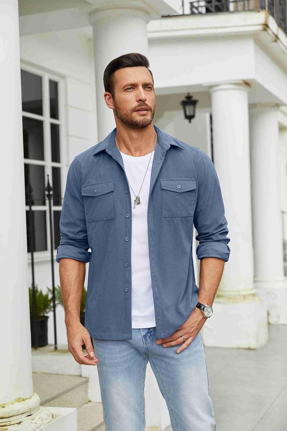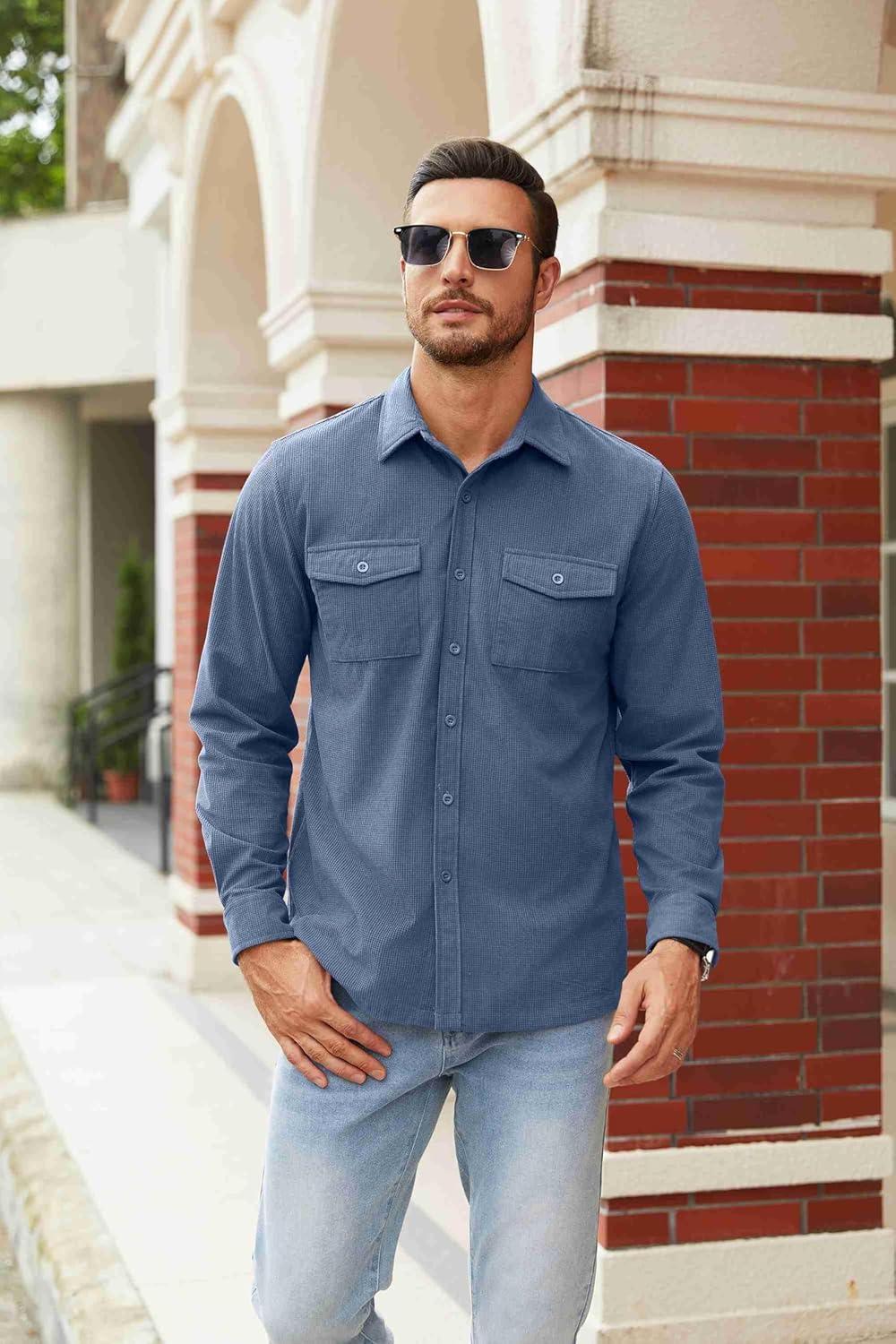 COOFANDY Men’s Button Down Waffle Shirt Jacket Casual Long Sleeve Shacket Lightweight Overshirts with Flap Pockets(Denim Blue)