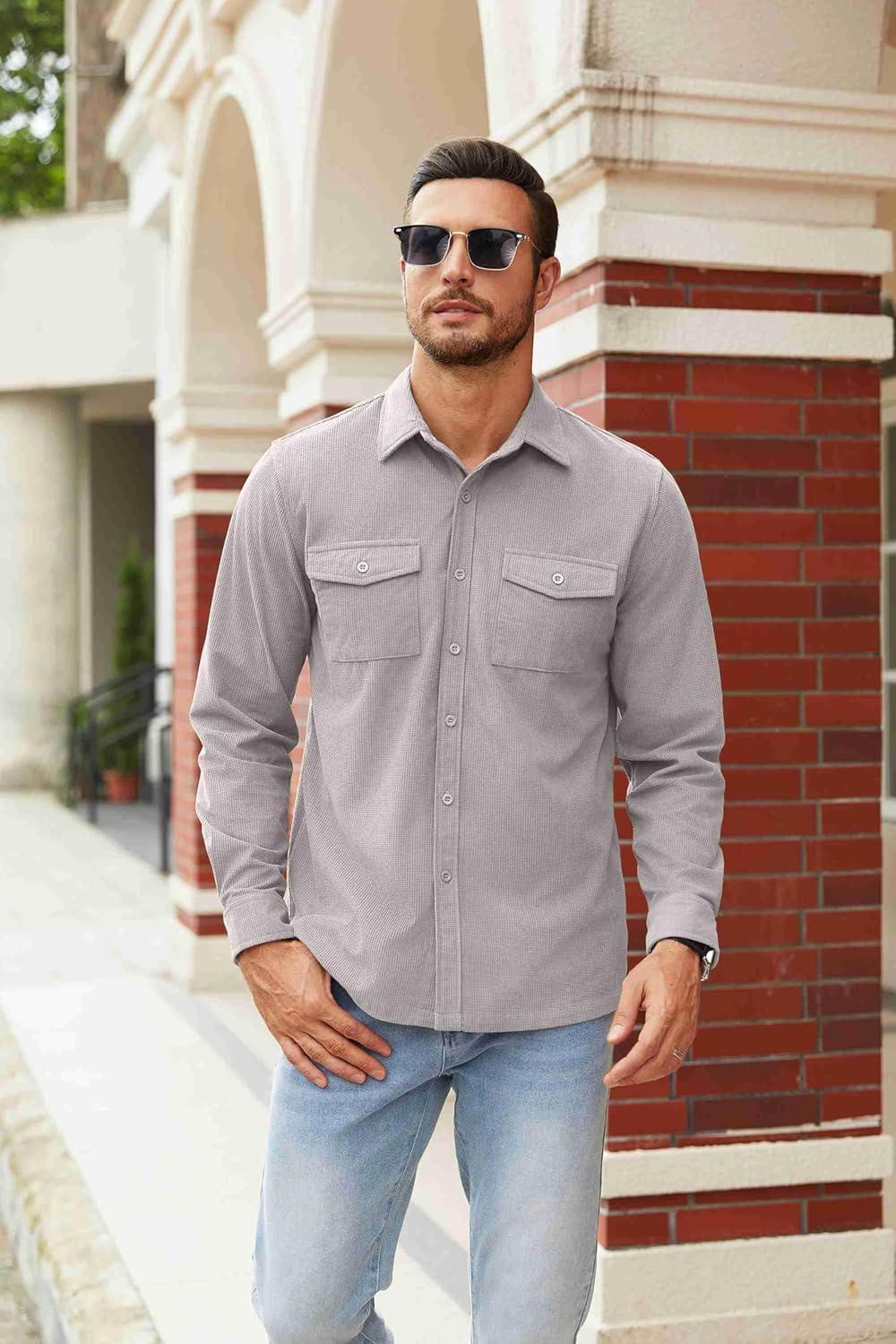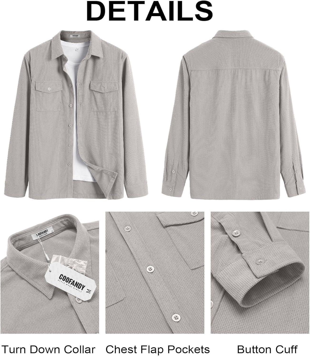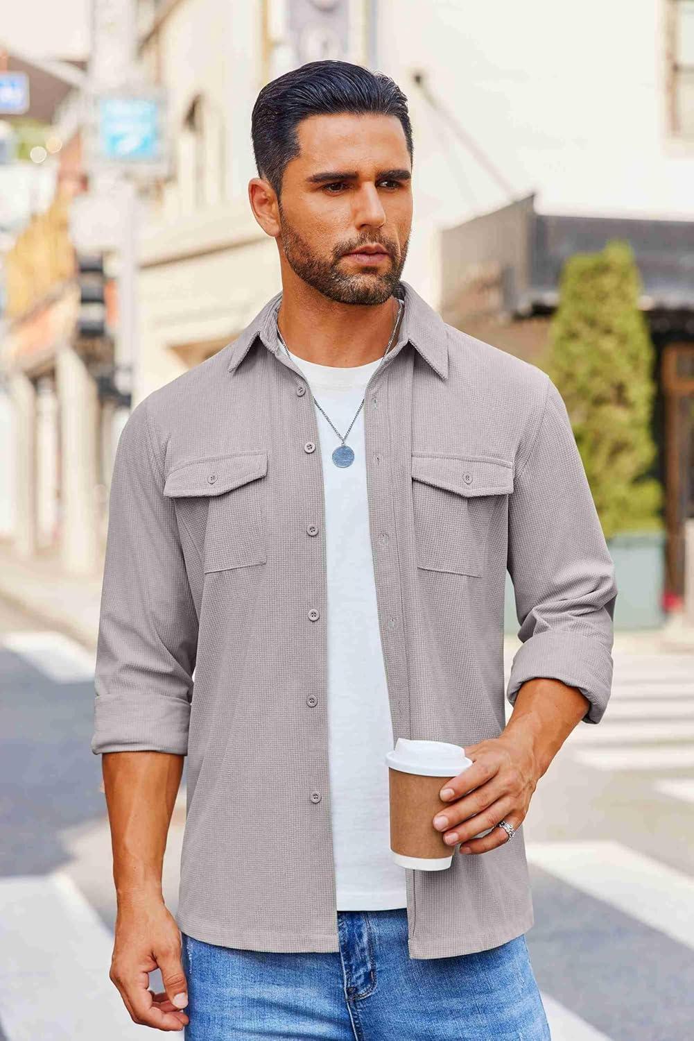COOFANDY Men’s Button Down Waffle Shirt Jacket Casual Long Sleeve Shacket Lightweight Overshirts with Flap Pockets(Light Gray)