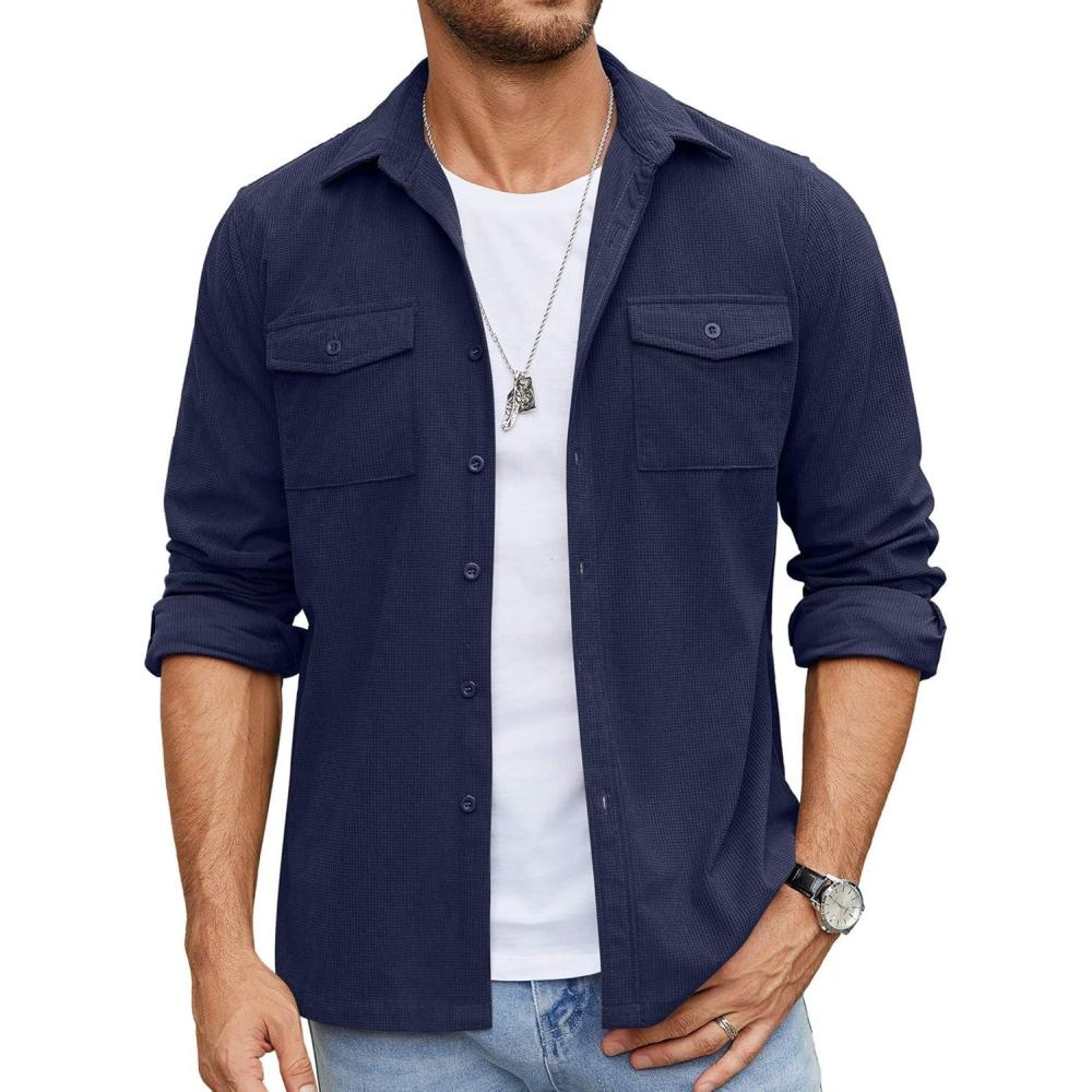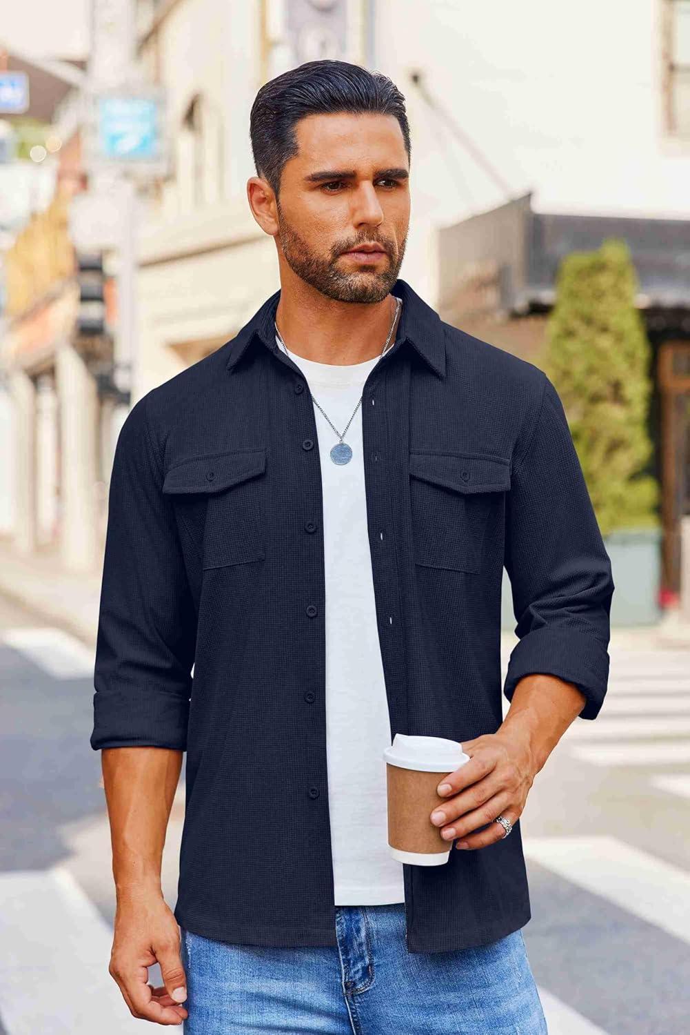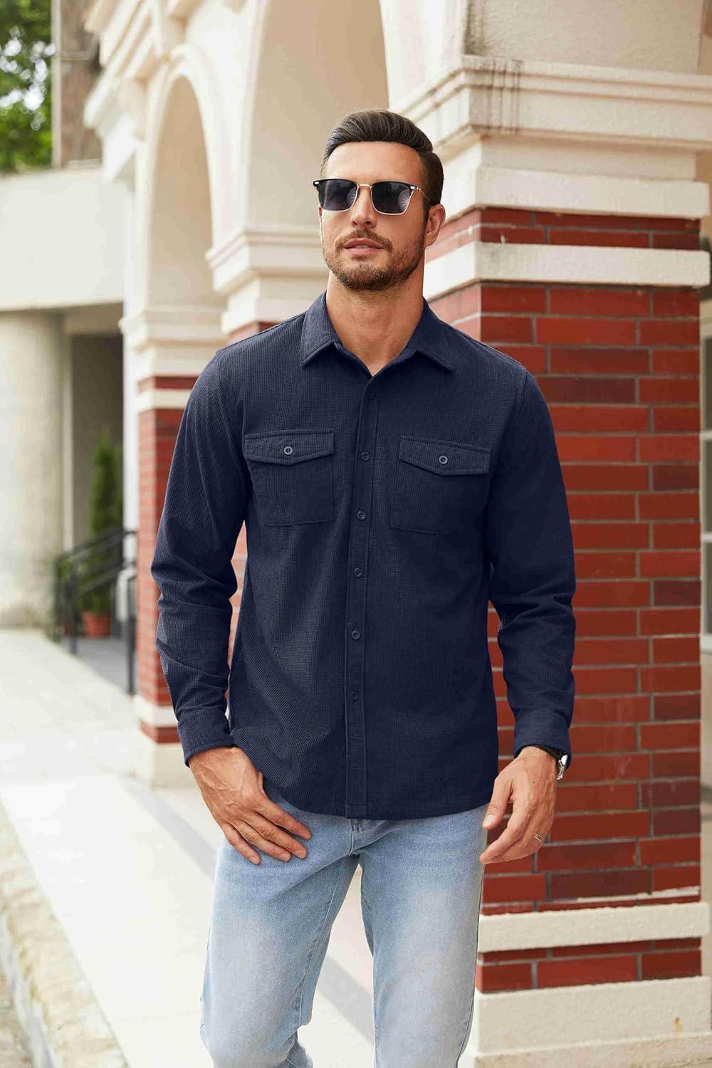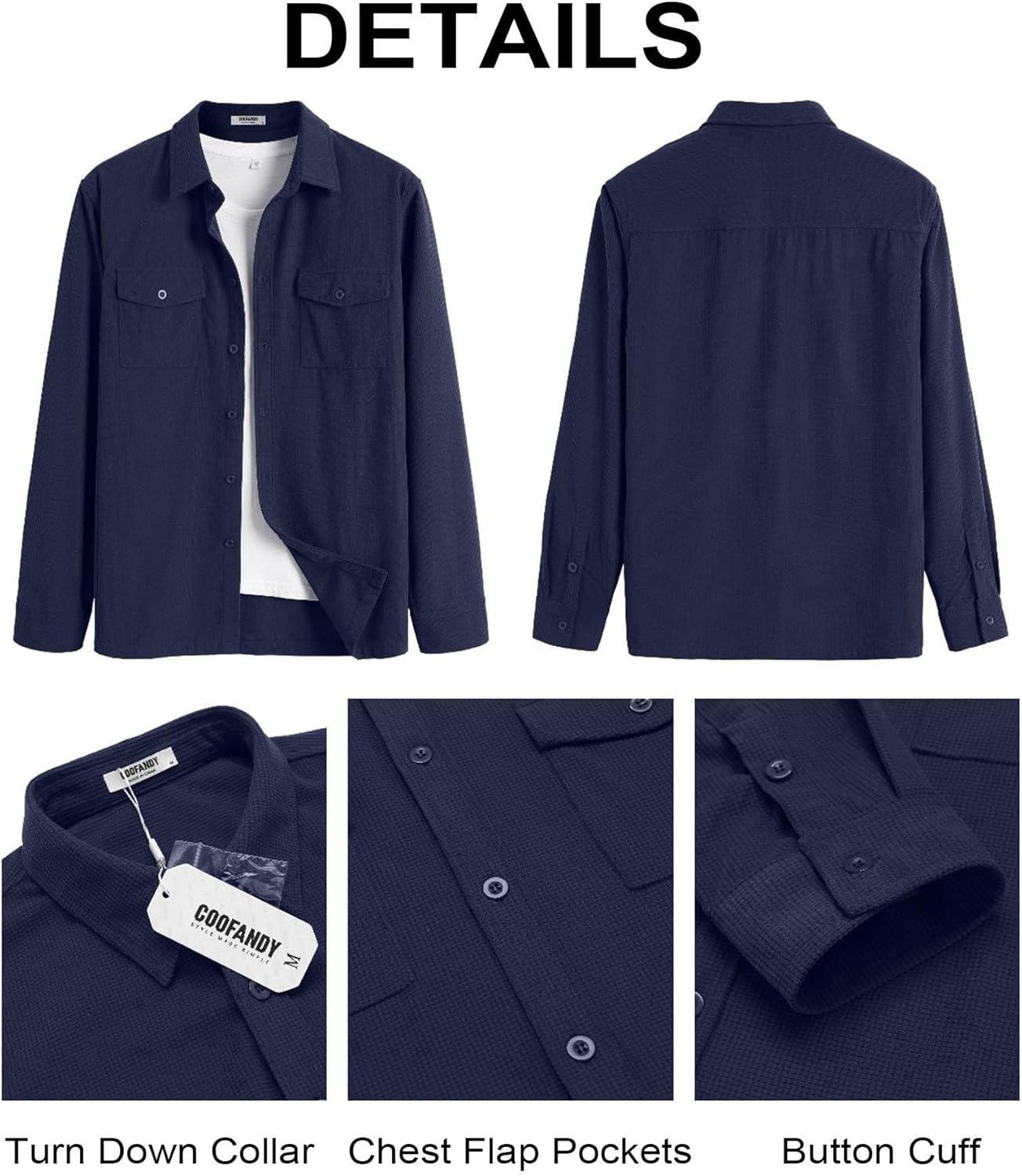 COOFANDY Men’s Button Down Waffle Shirt Jacket Casual Long Sleeve Shacket Lightweight Overshirts with Flap Pockets(Nave Blue)
