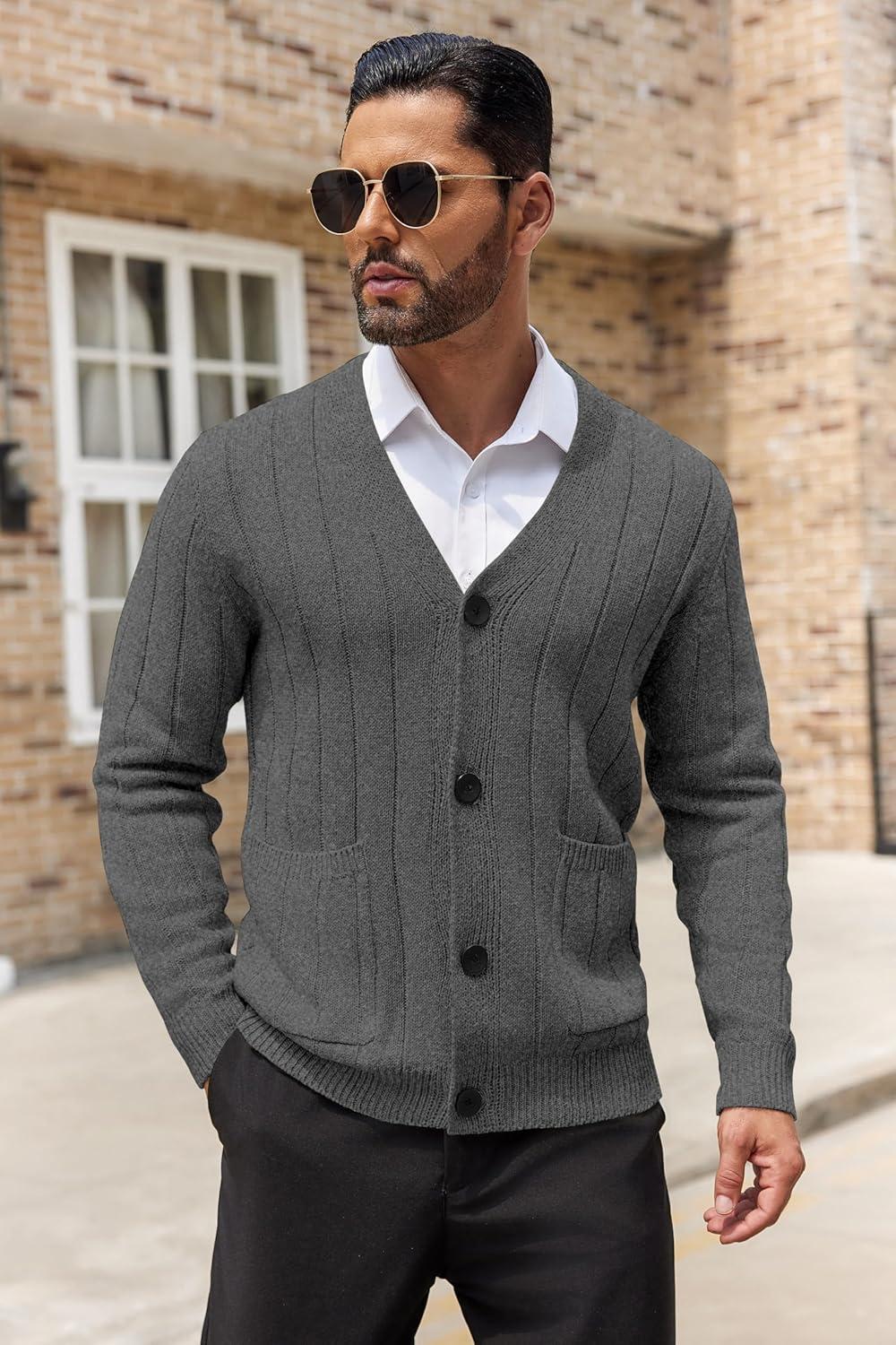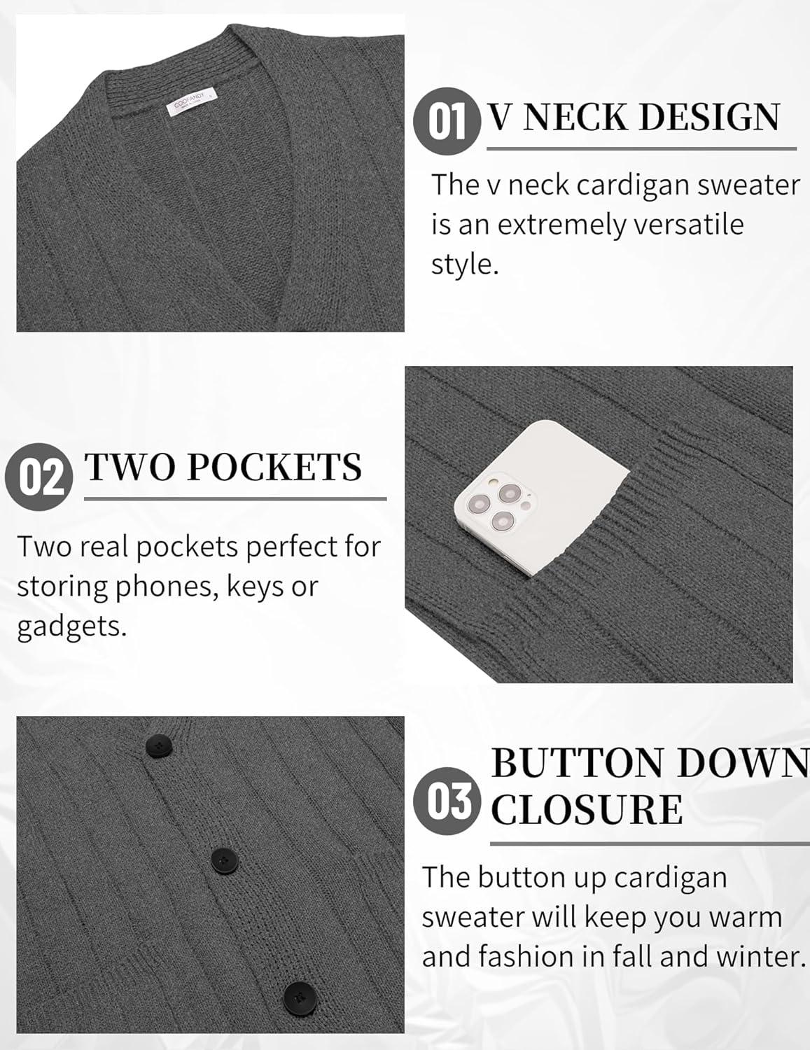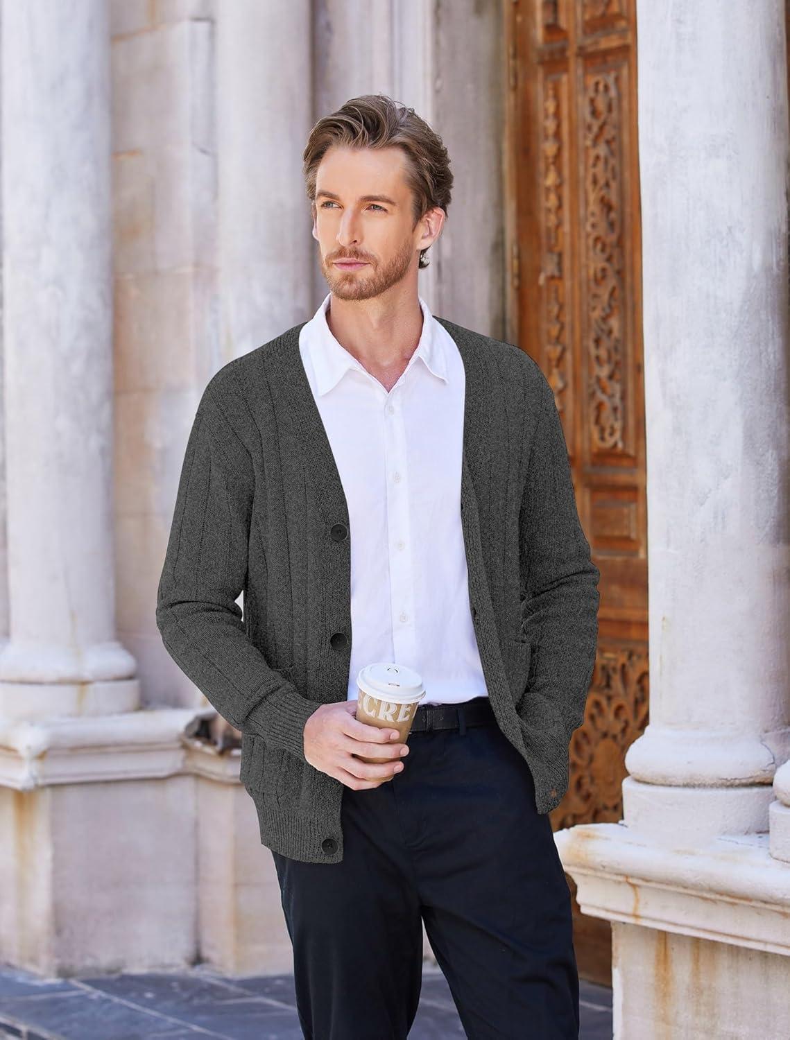 COOFANDY Men’s Cardigan Sweater Cable Knit V Neck Button up Sweaters Ribbed Cardigan Sweater with Pockets(Dark Grey)