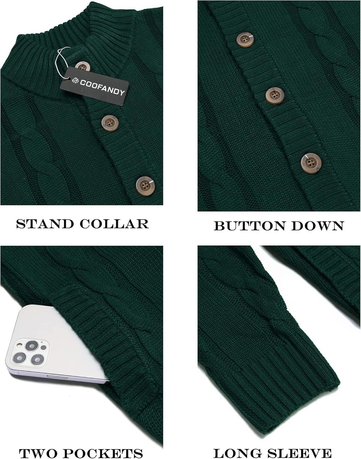 COOFANDY Men’s Cardigan Sweater Slim Fit Stand Collar Cardigan Casual Cable Knitted Button Down Sweater with Pockets(Green)