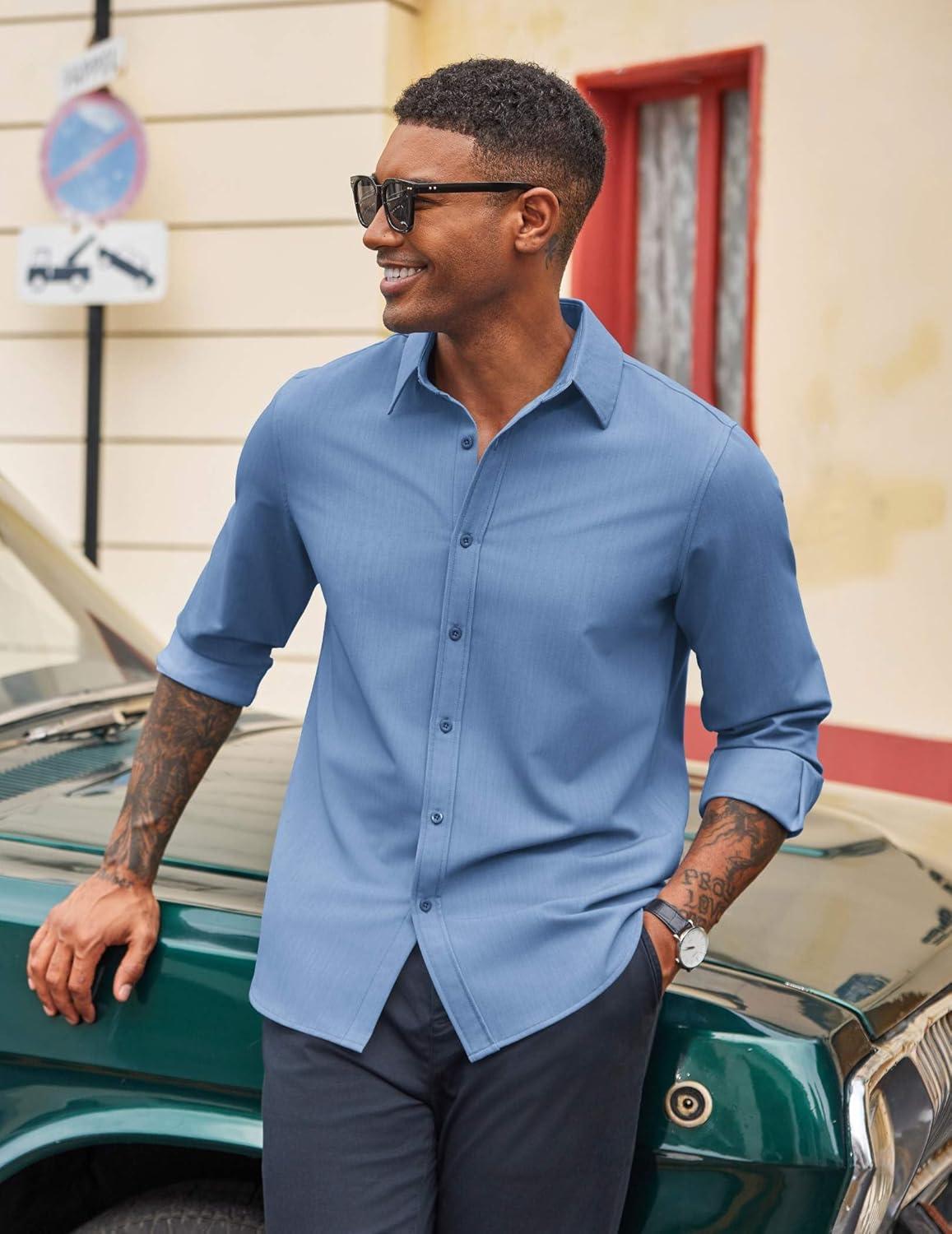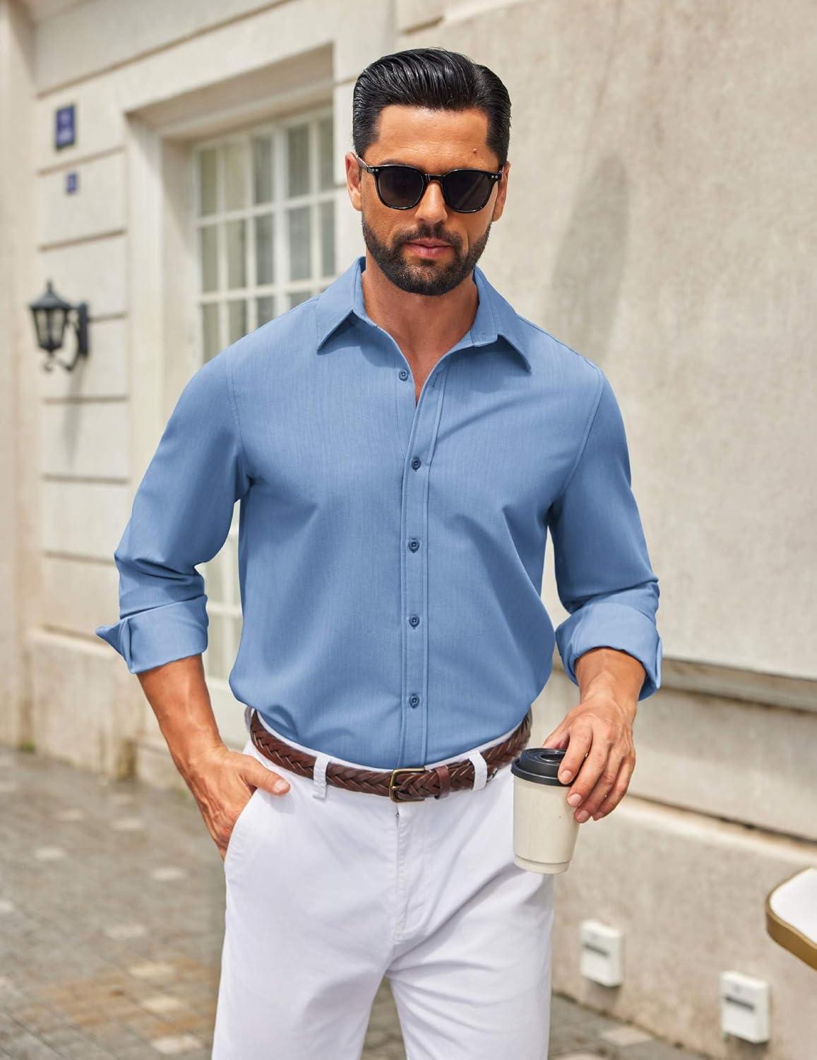 COOFANDY Men’s Casual Button Down Shirt Long Sleeve Untucked Shirt Wrinkle Free Denim Dress Shirt(Light Blue)