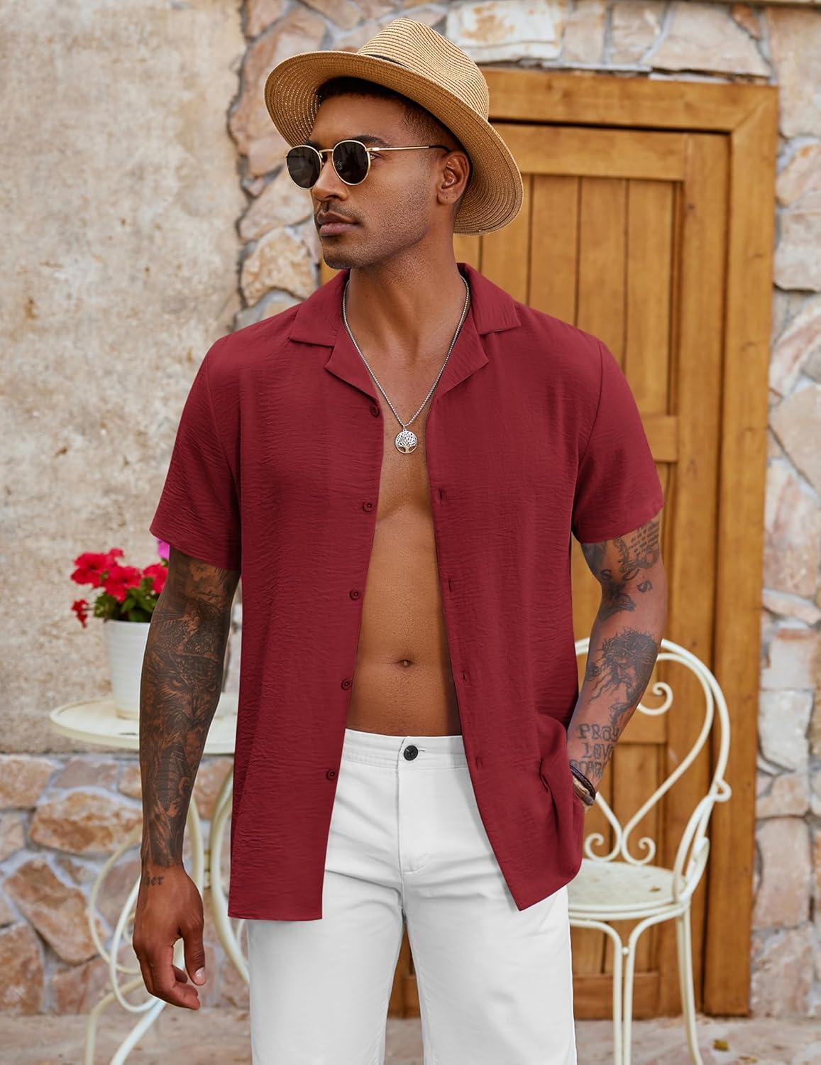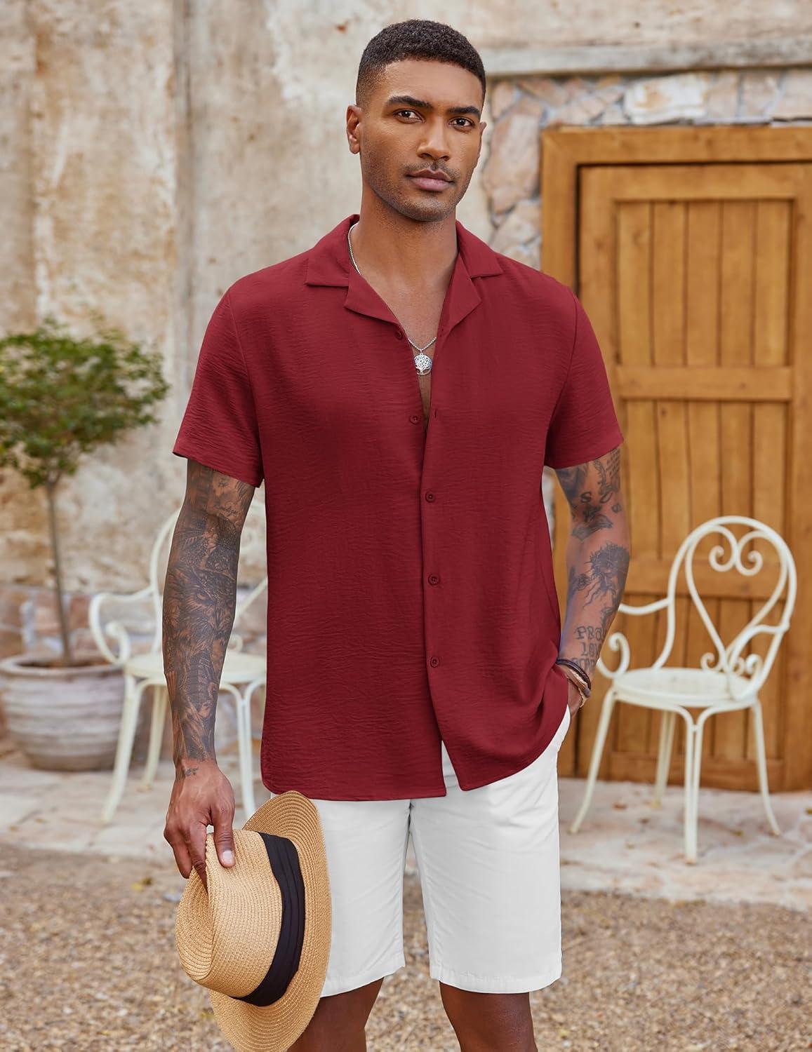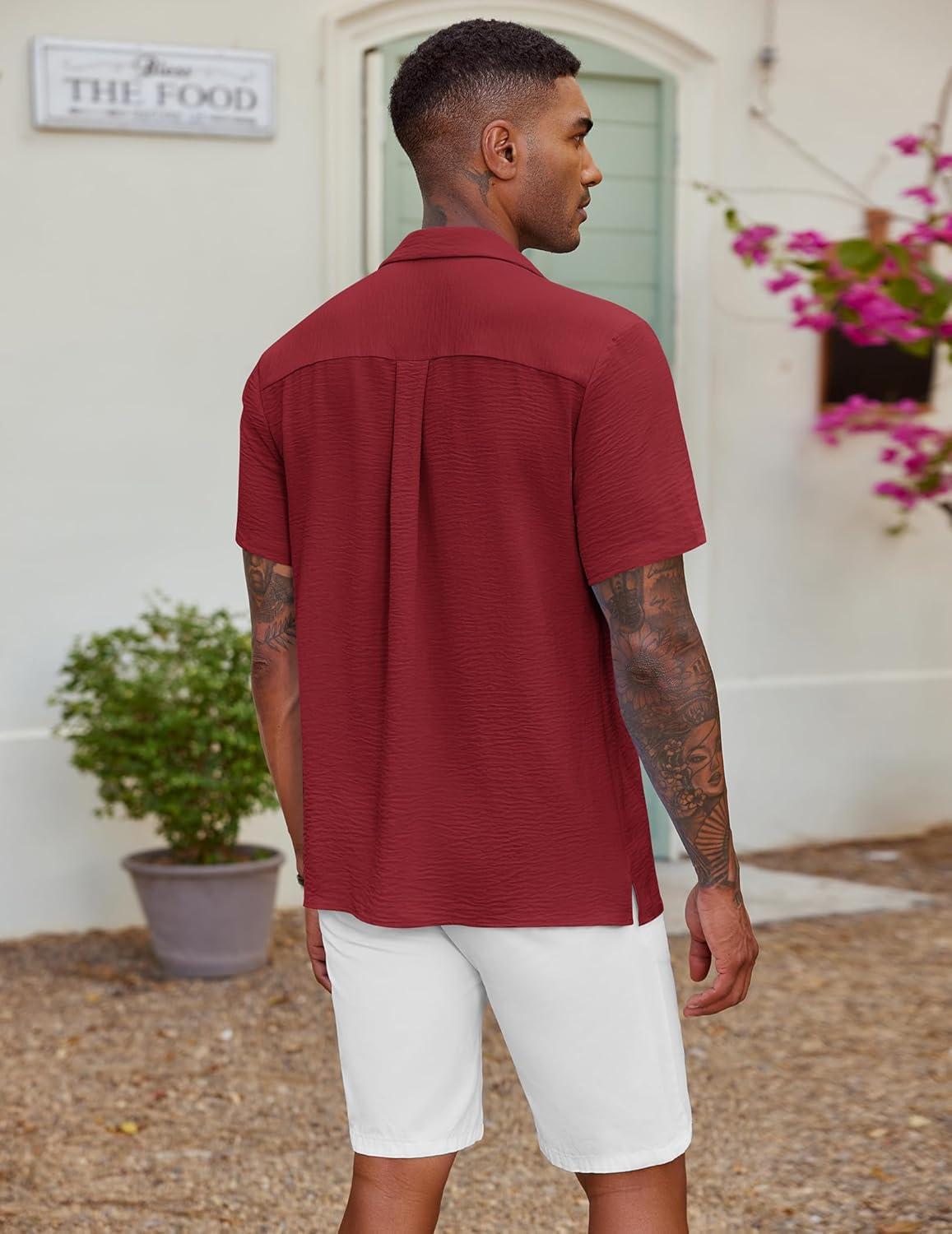 COOFANDY Men’s Casual Button Down Shirt Short Sleeve Textured Summer Cuban Beach Shirts(Wine Red)