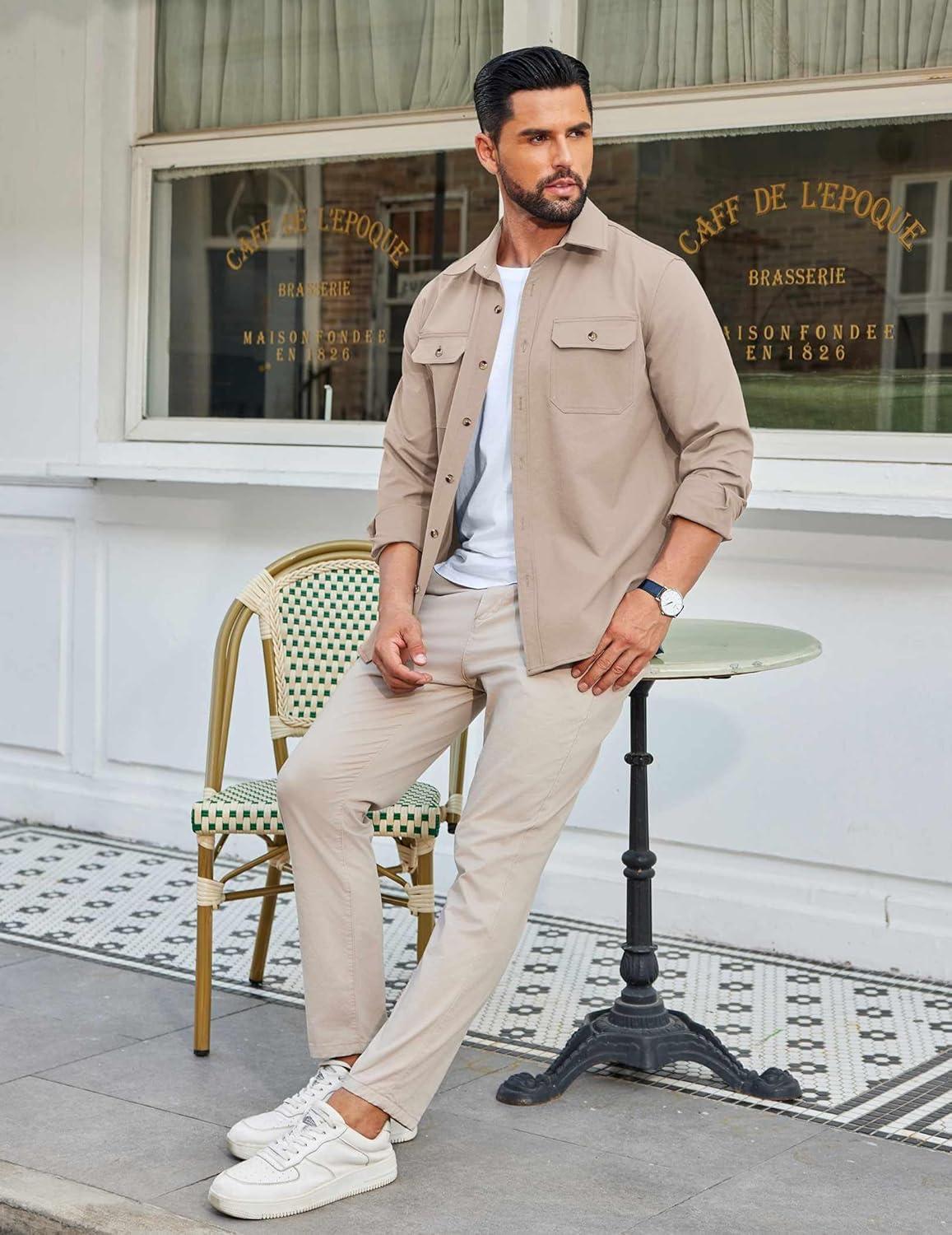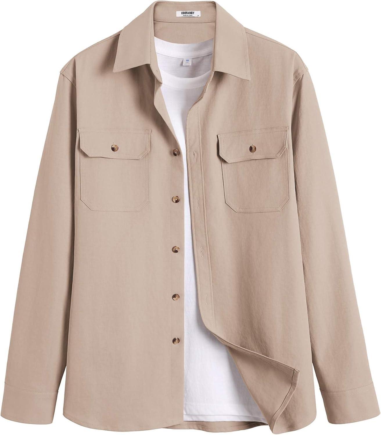COOFANDY Mens Casual Button Down Shirts Long Sleeve Wrinkle-Free Shirt Lightweight Shirt Jacket(Light Khaki)