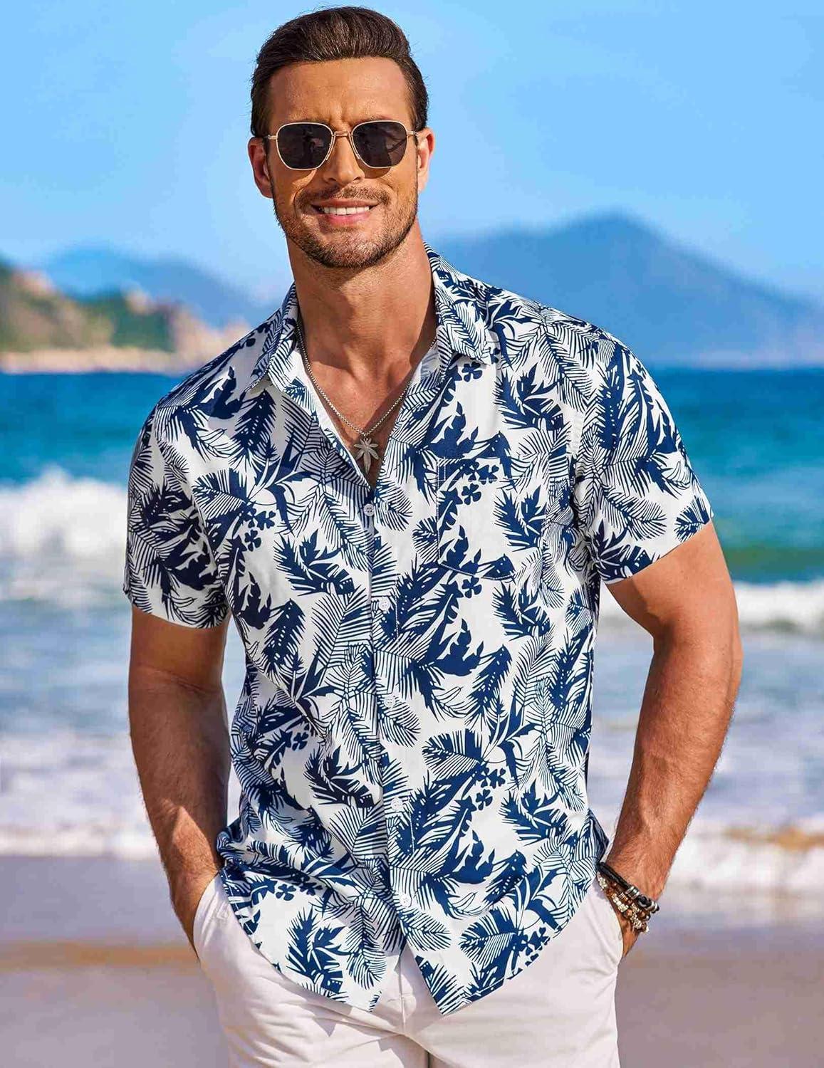 COOFANDY Men’s Casual Button Down Shirts Short Sleeve Summer Beach Shirt Fashion Textured Shirts with Pocket(White – Palm Leaf)