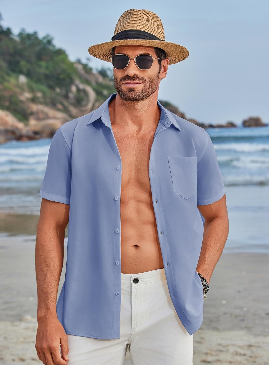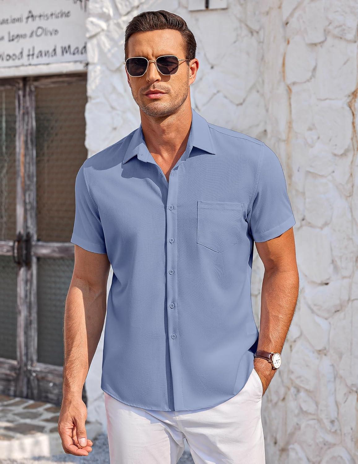 COOFANDY Men’s Casual Button Down Shirts Short Sleeve Summer Beach Vacation Untucked Dress Shirts with Pocket(Dark Blue)