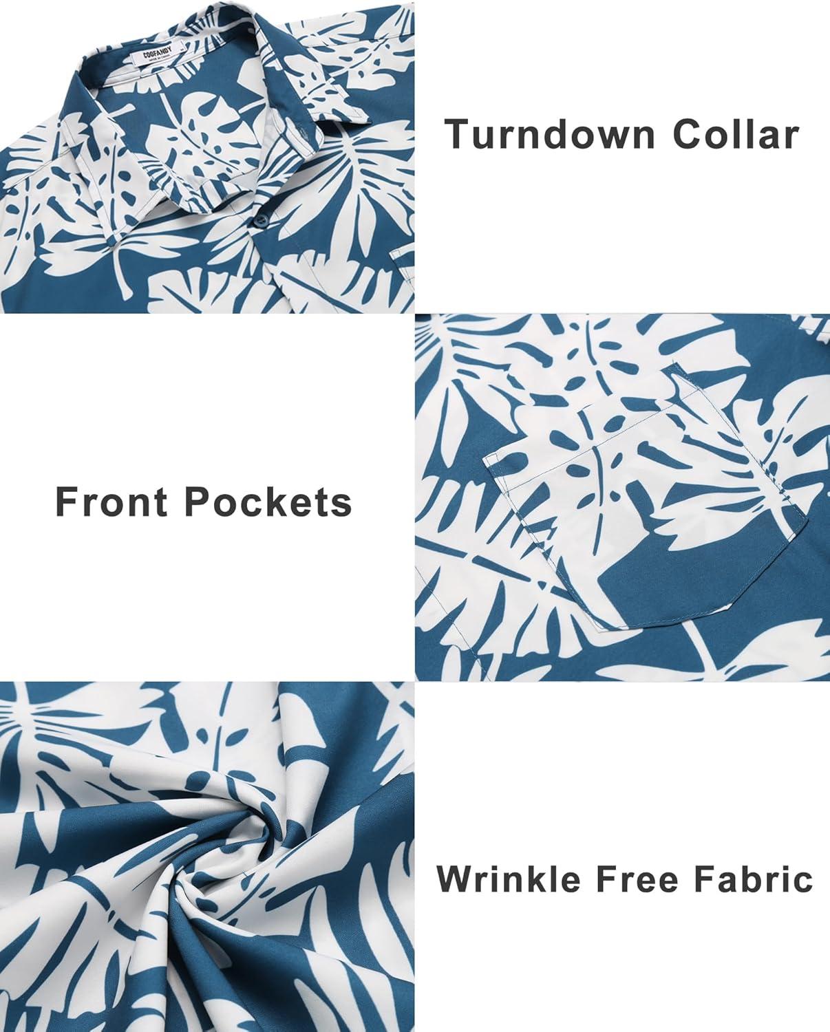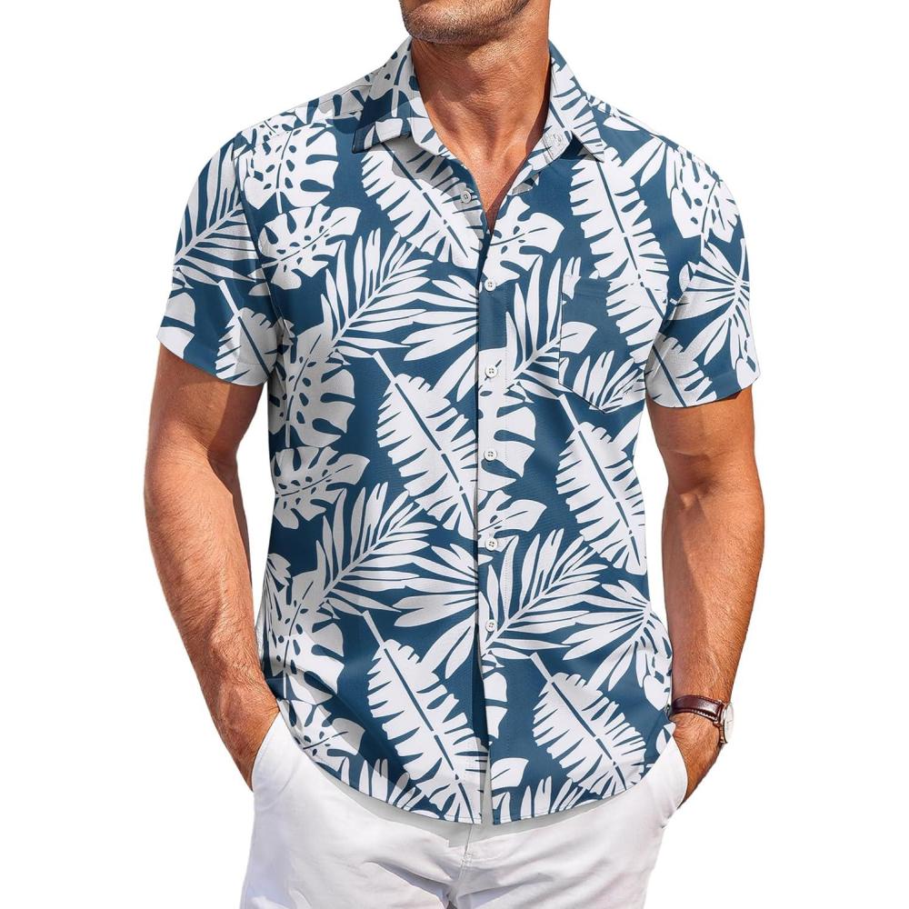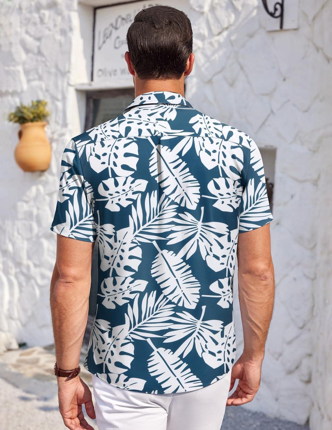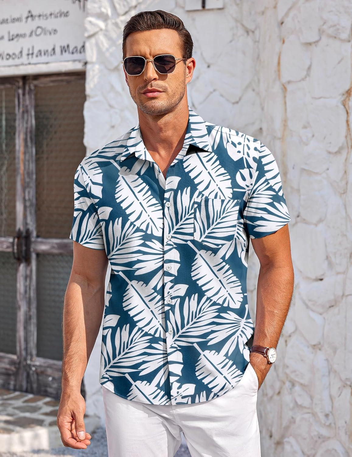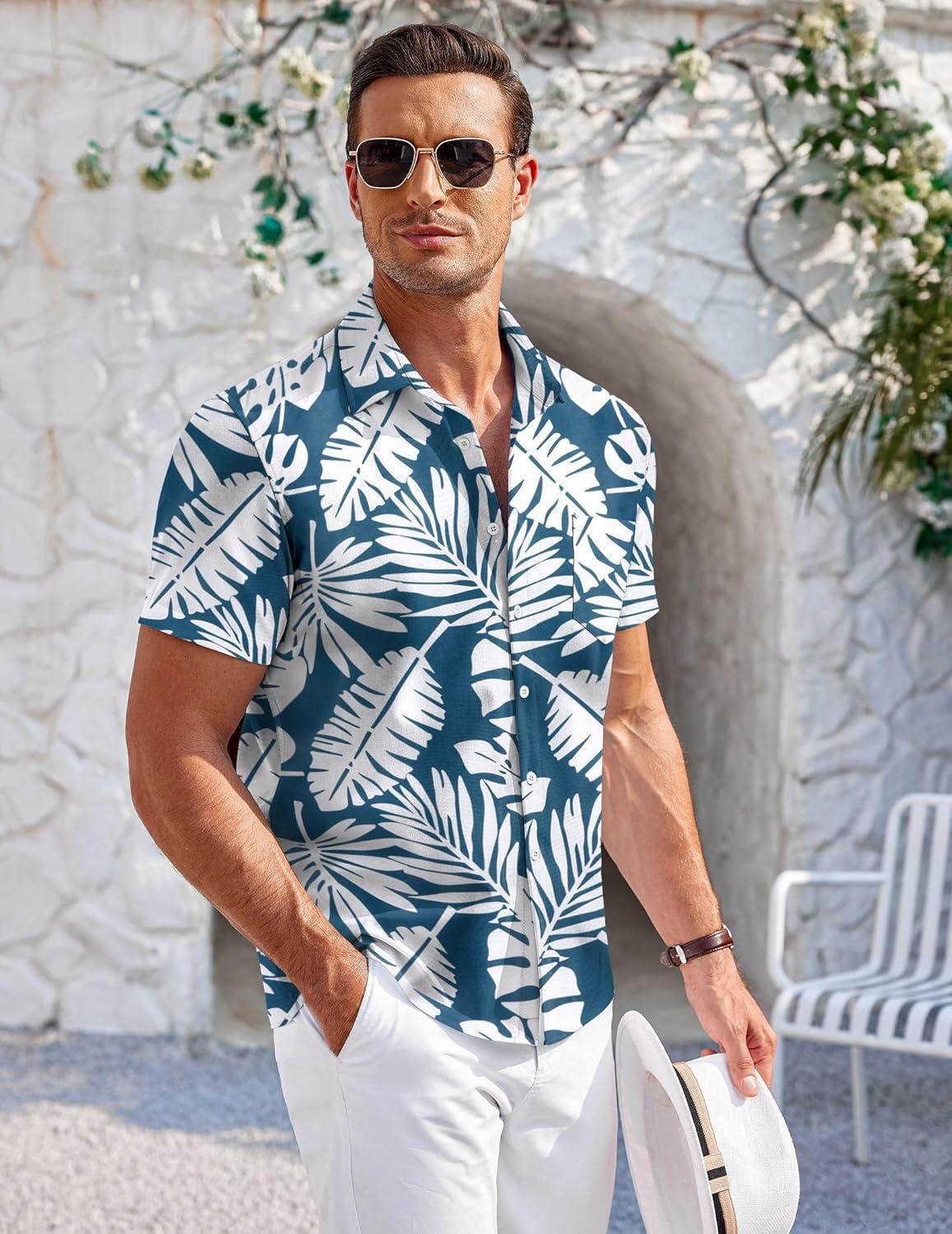 COOFANDY Men’s Casual Button Down Shirts Short Sleeve Summer Beach Vacation Untucked Dress Shirts with Pocket(Leaf-blue)