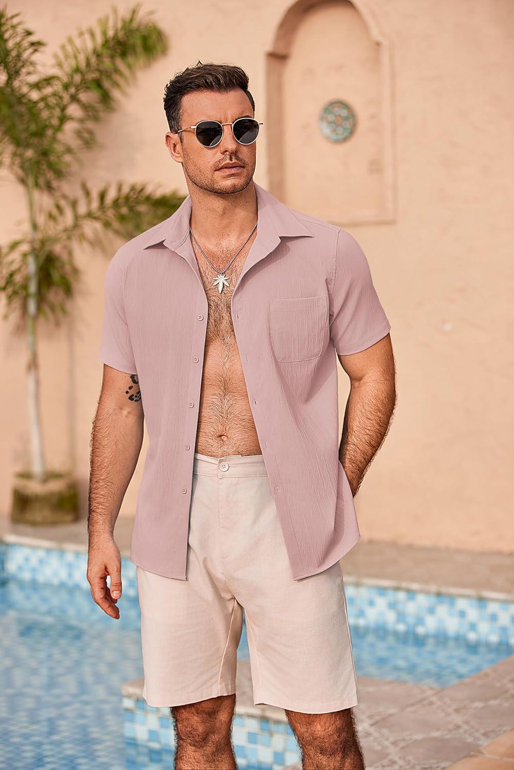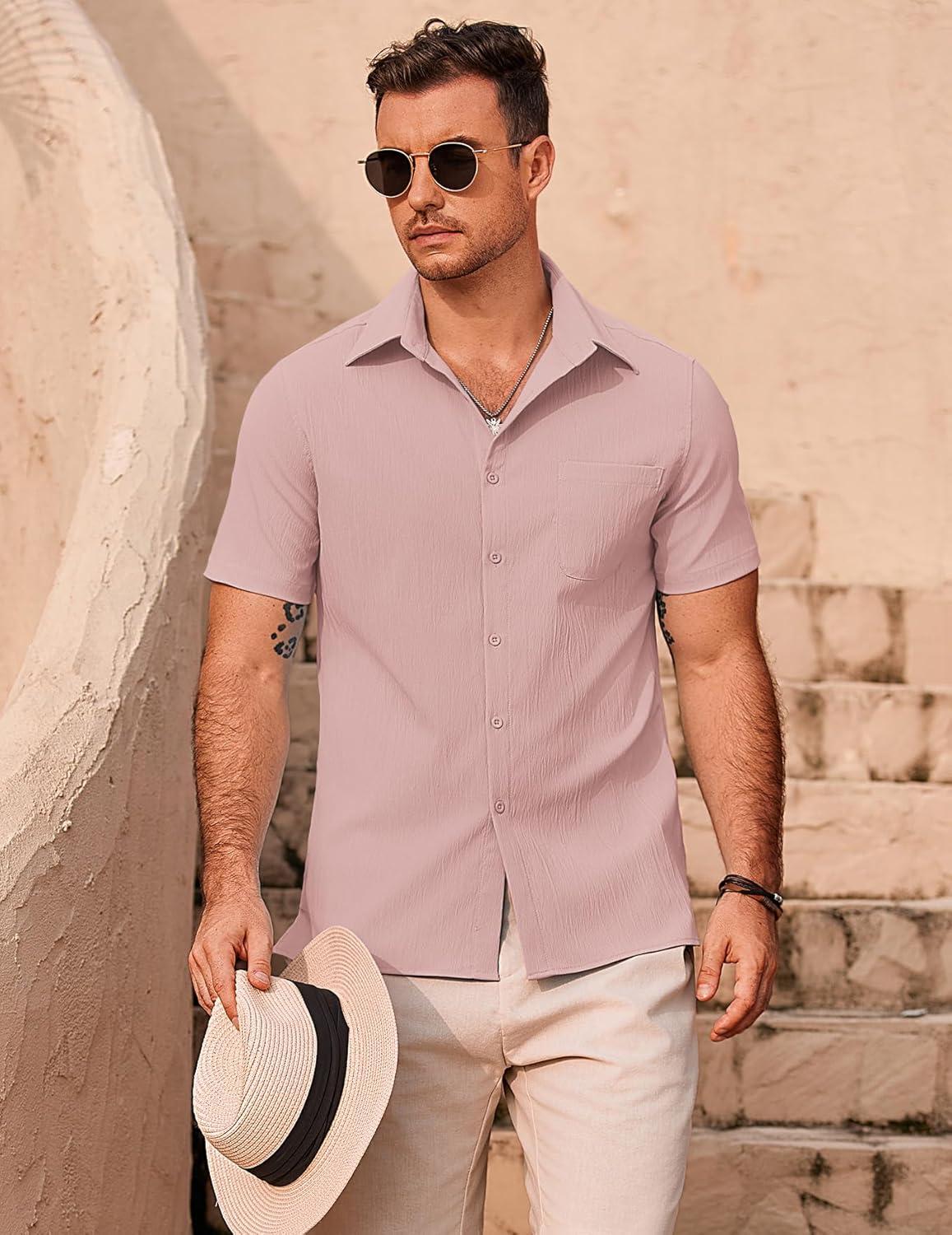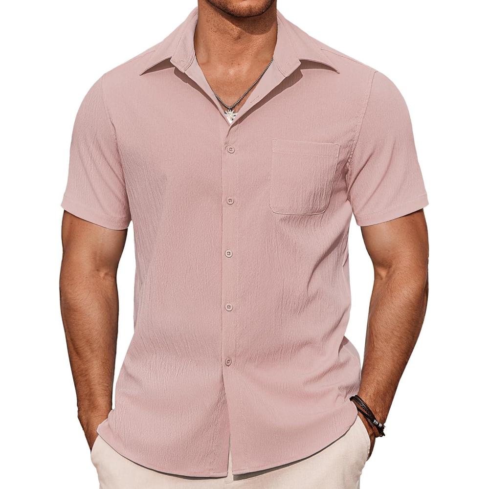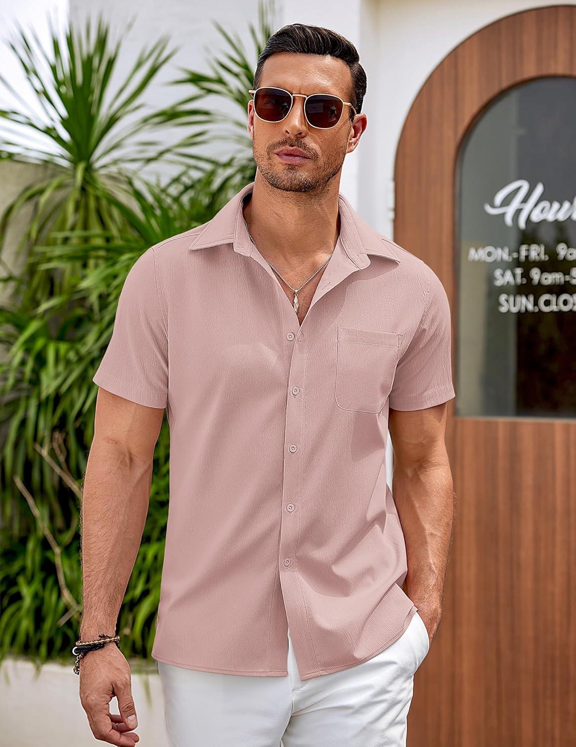 COOFANDY Men’s Casual Button Down Shirts Short Sleeve Summer Beach Vacation Untucked Dress Shirts with Pocket(Light Pink)