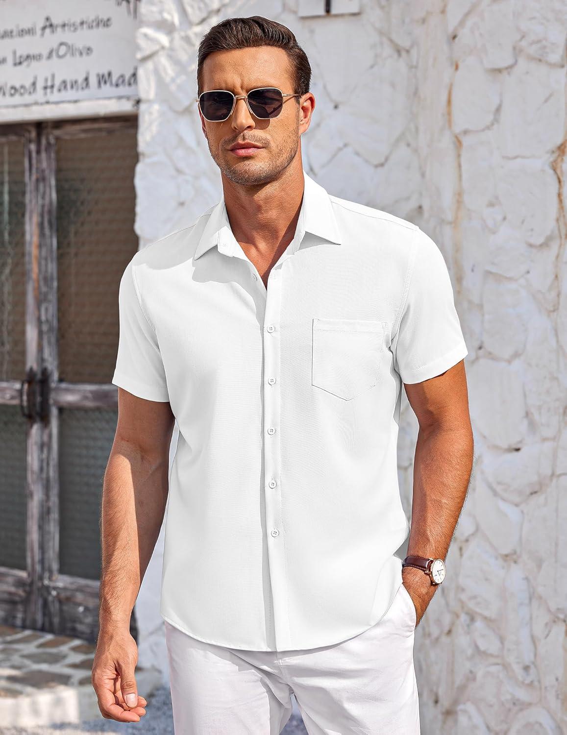 COOFANDY Men’s Casual Button Down Shirts Short Sleeve Summer Beach Vacation Untucked Dress Shirts with Pocket(White)