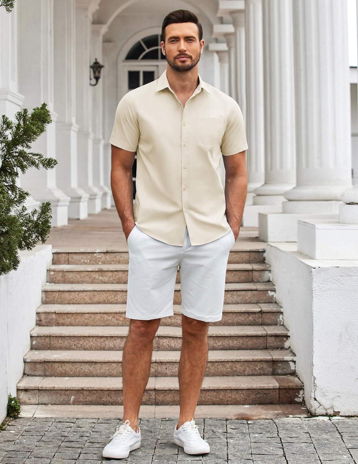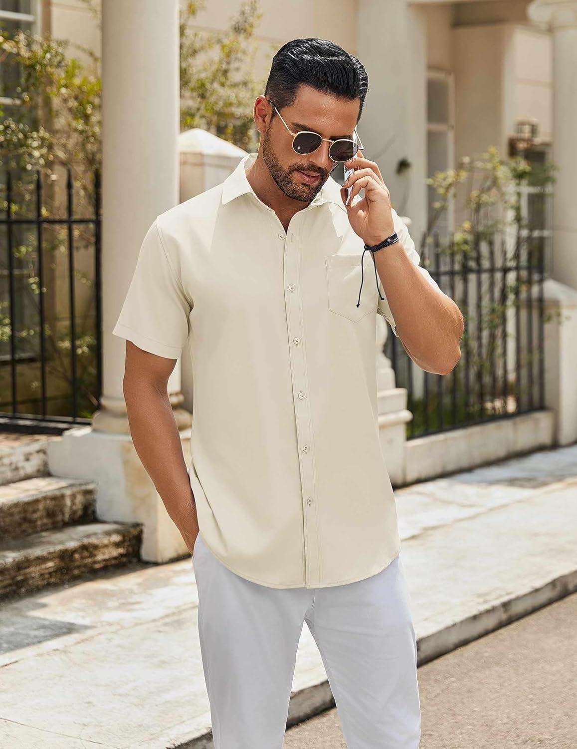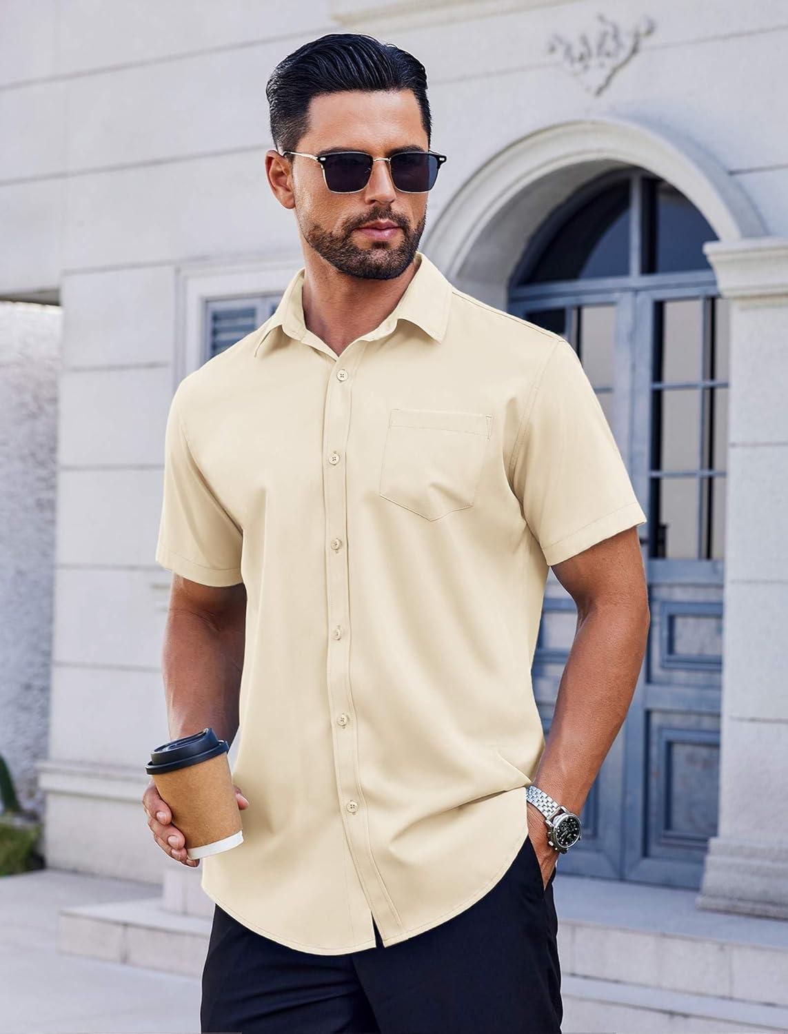 COOFANDY Mens Casual Button Down Shirts Short Sleeve Summer Untucked Dress Shirt with Pocket(Beige)