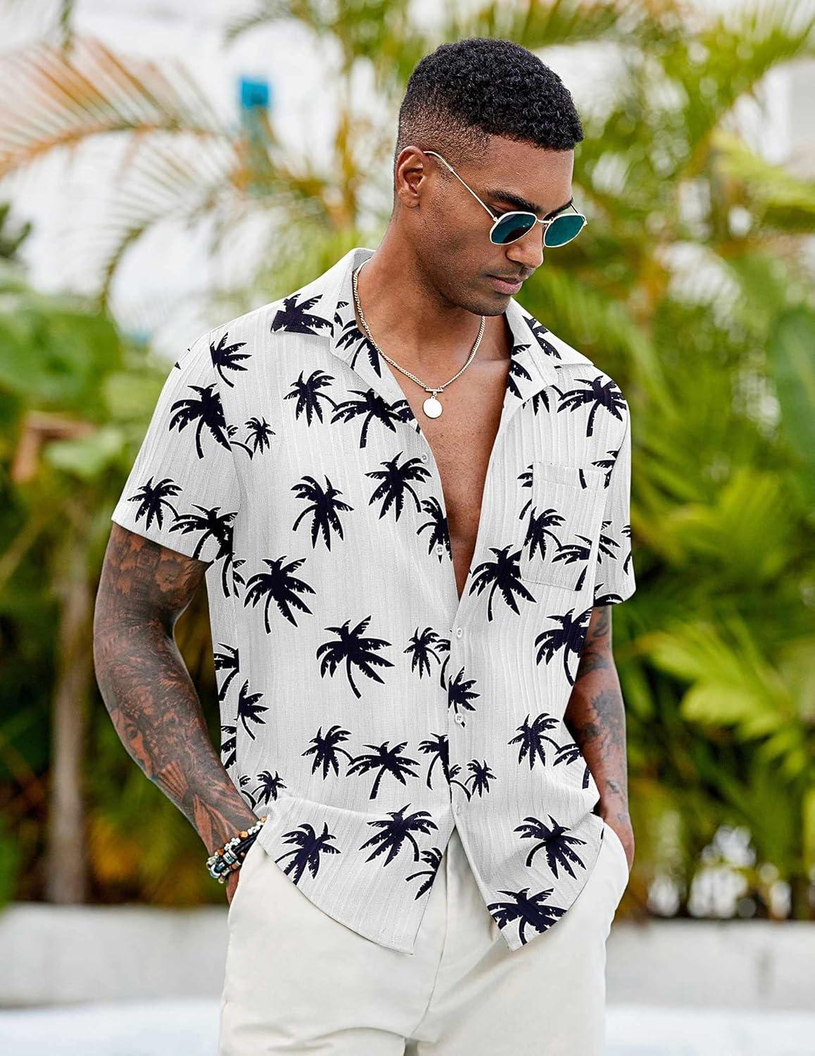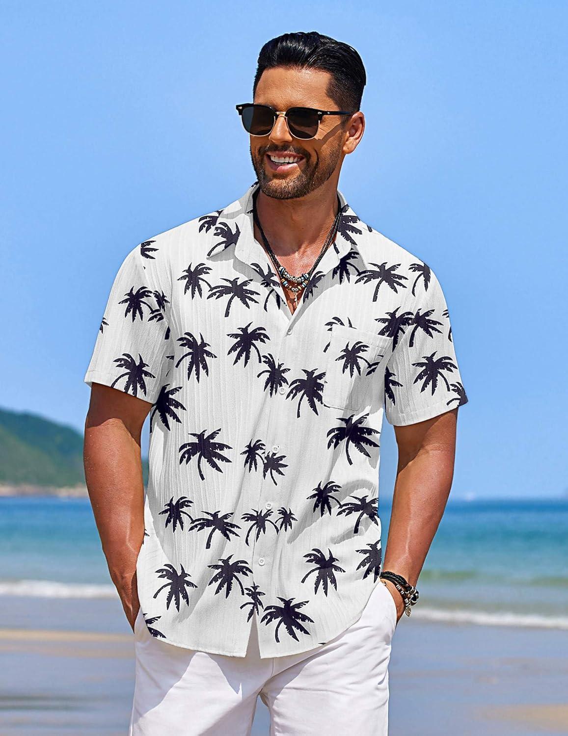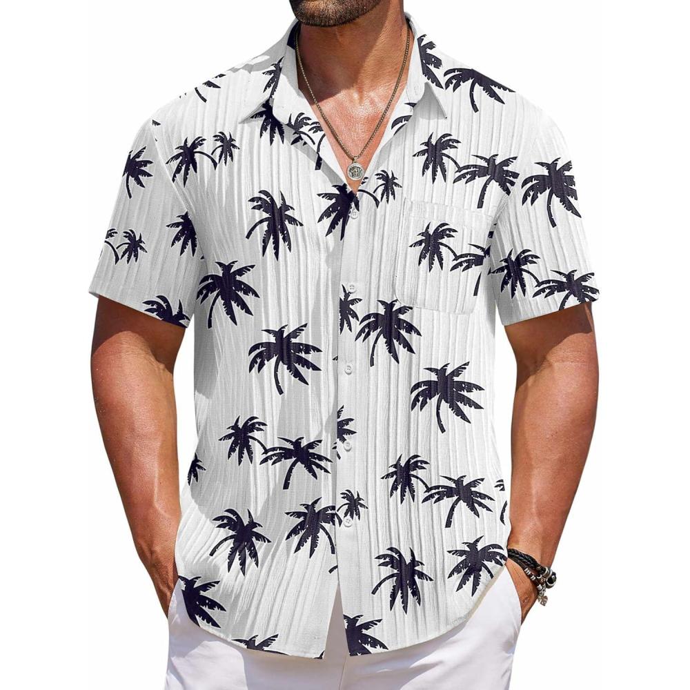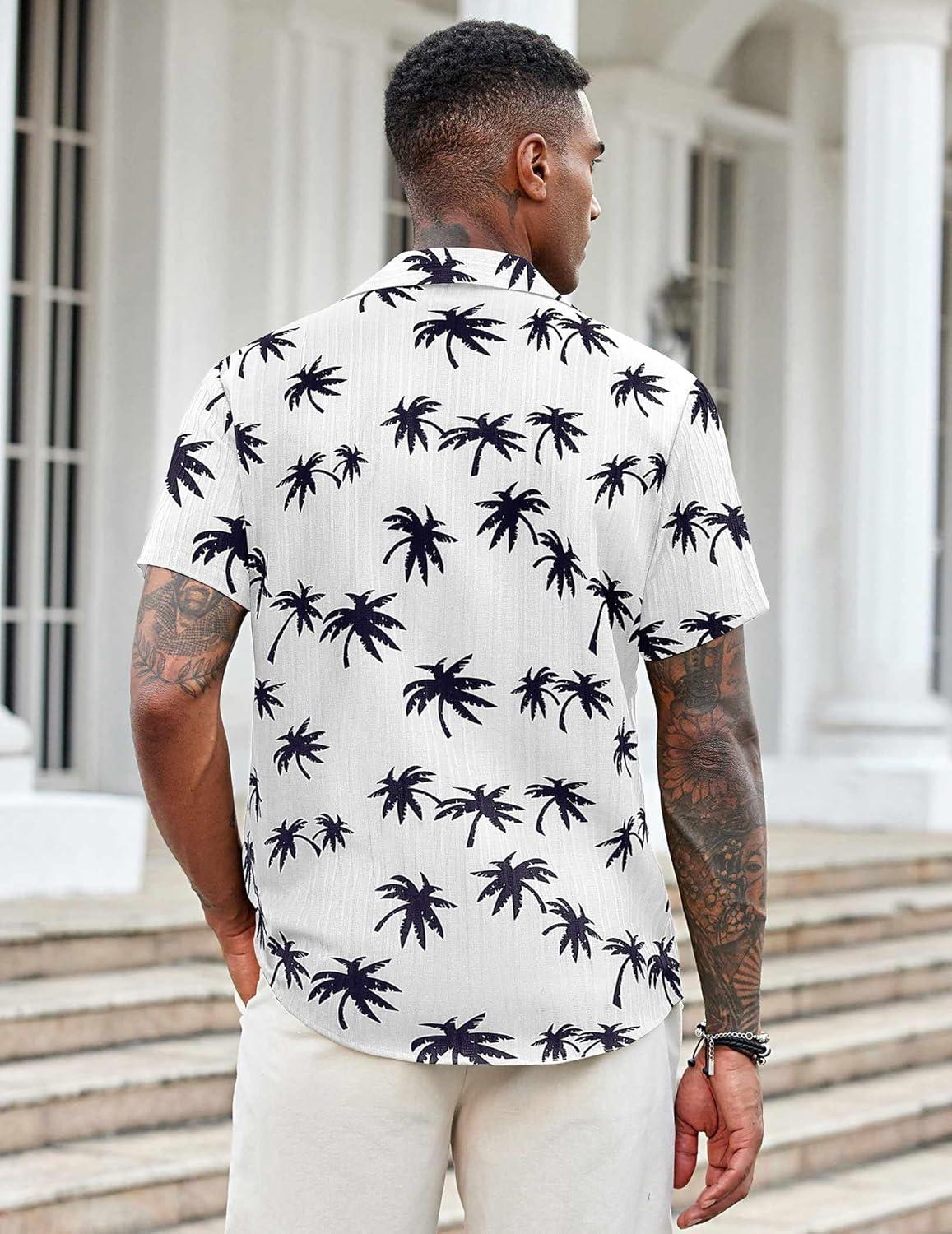COOFANDY Mens Casual Button Down Shirts Short Sleeve Textured Shirt Summer Beach Shirts for Men(White-coconut Tree)