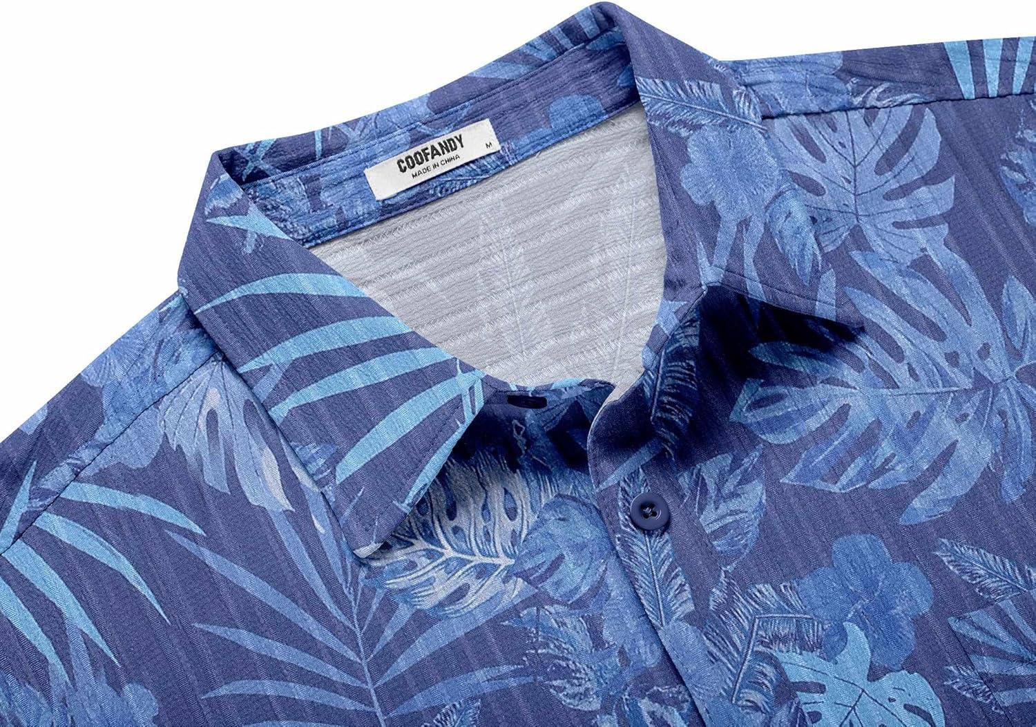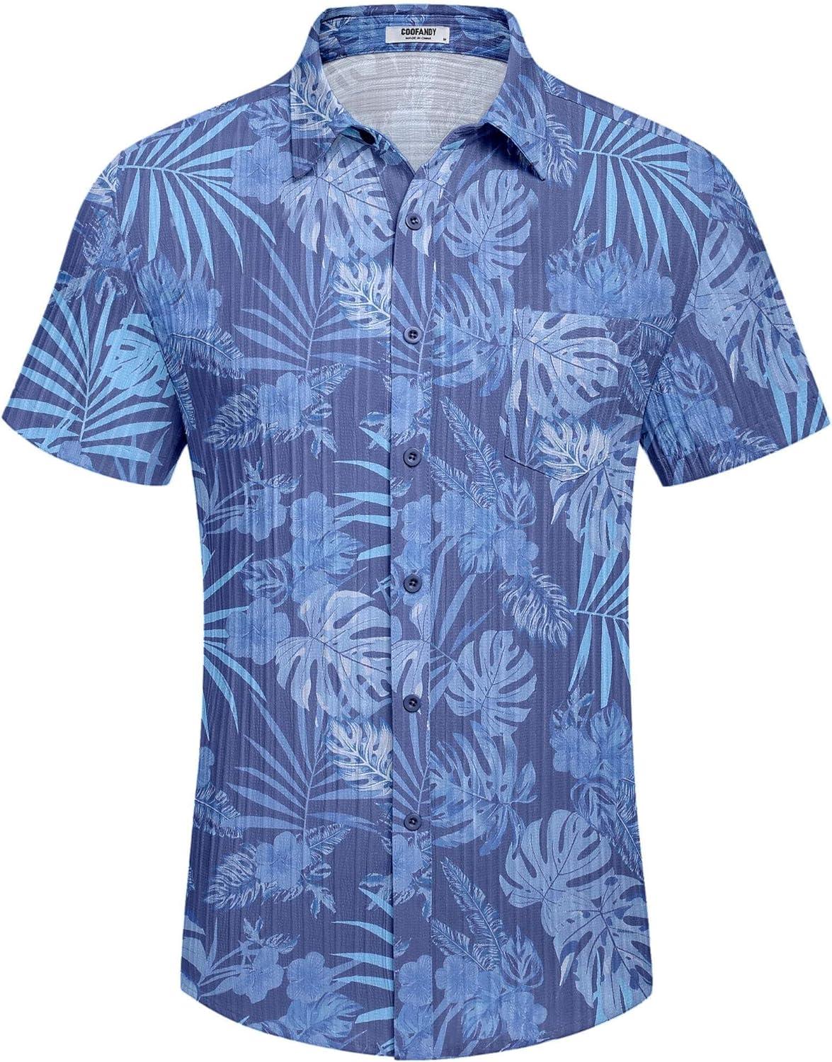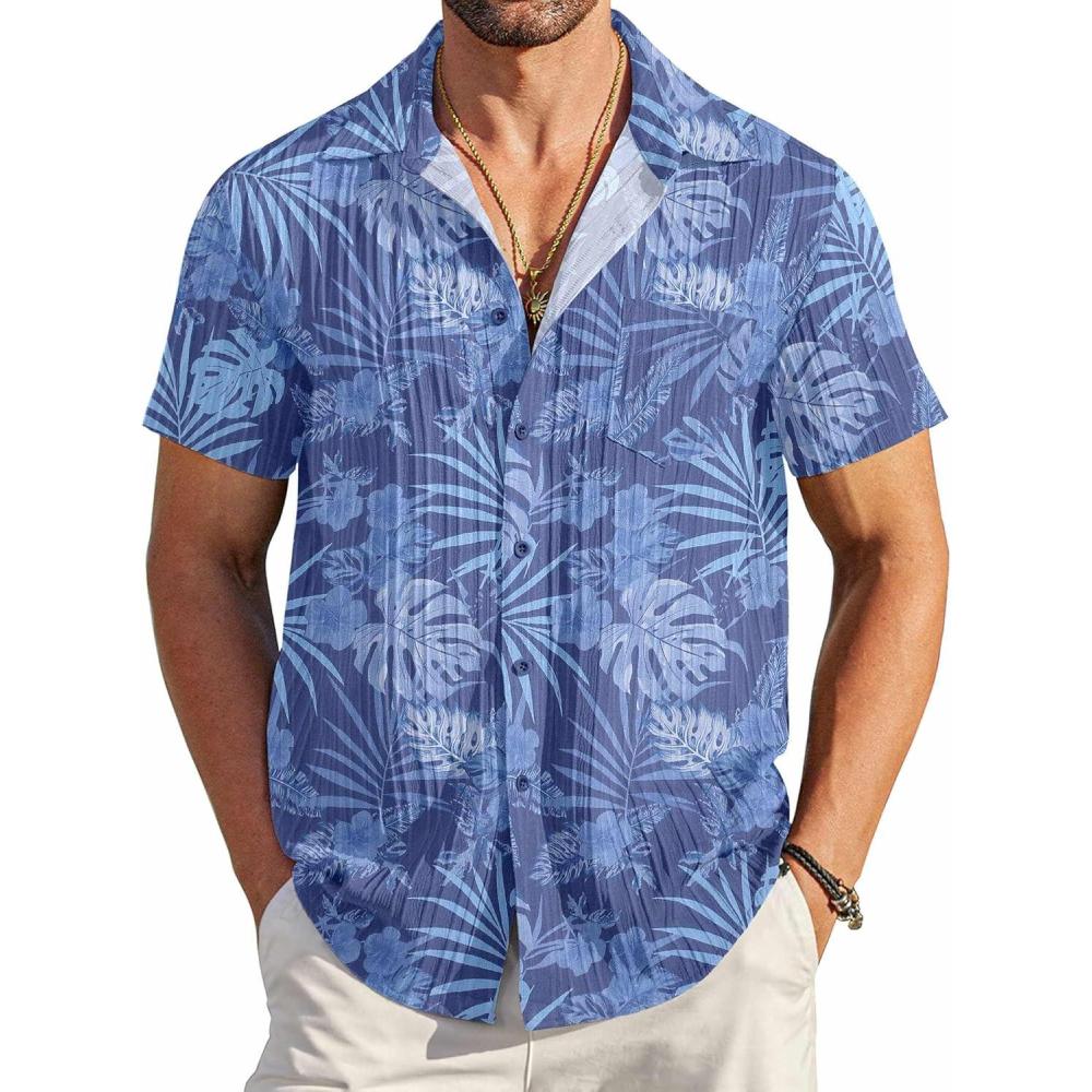 COOFANDY Men’s Casual Button Down Shirts Short Sleeve Textured Summer Beach Shirt with Pocket(Gray Blue-leaves)