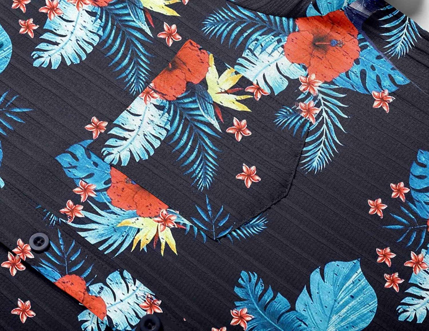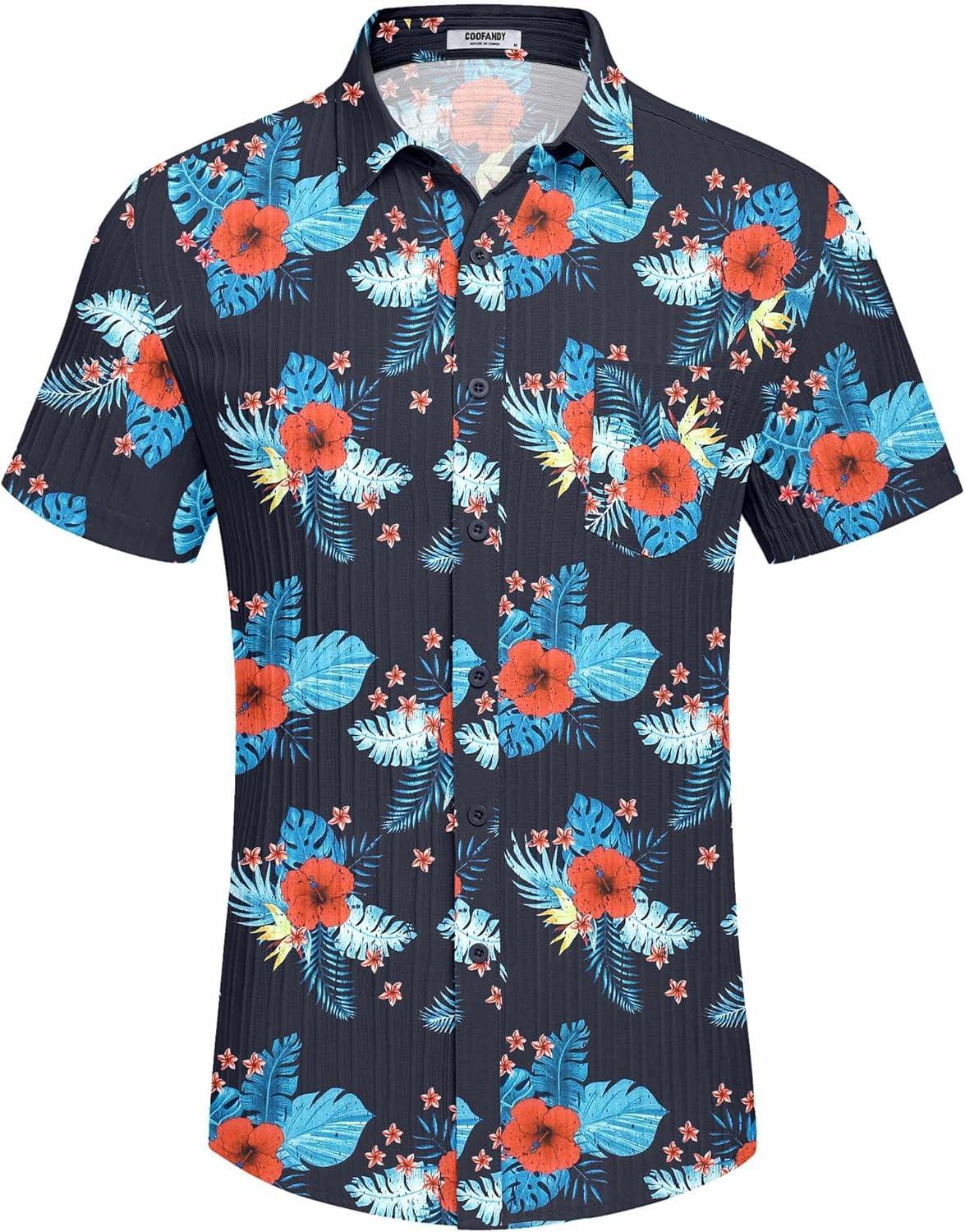 COOFANDY Men’s Casual Button Down Shirts Short Sleeve Textured Summer Beach Shirt with Pocket(Navy-red Floral)