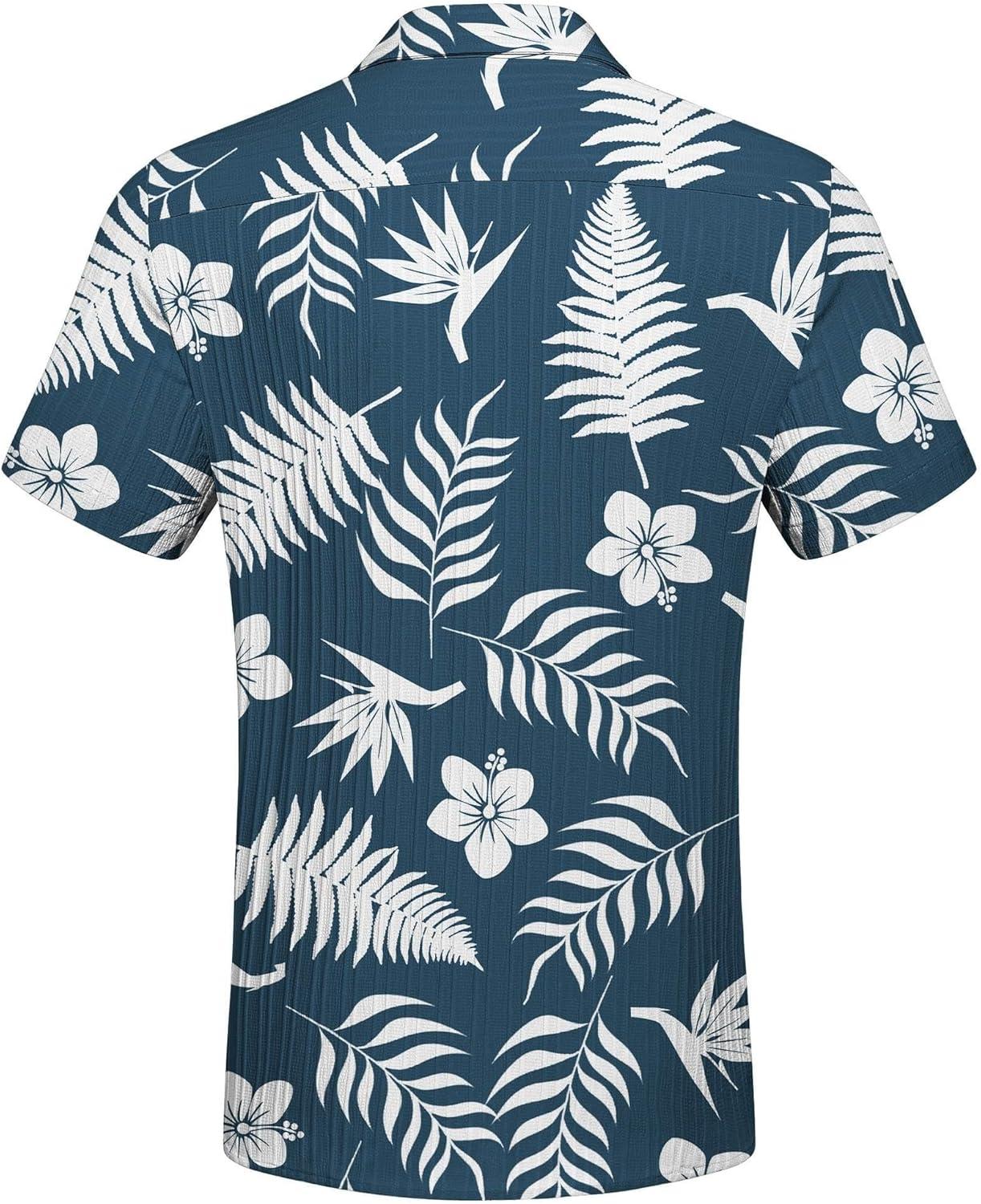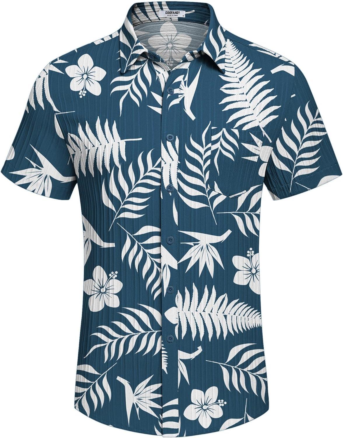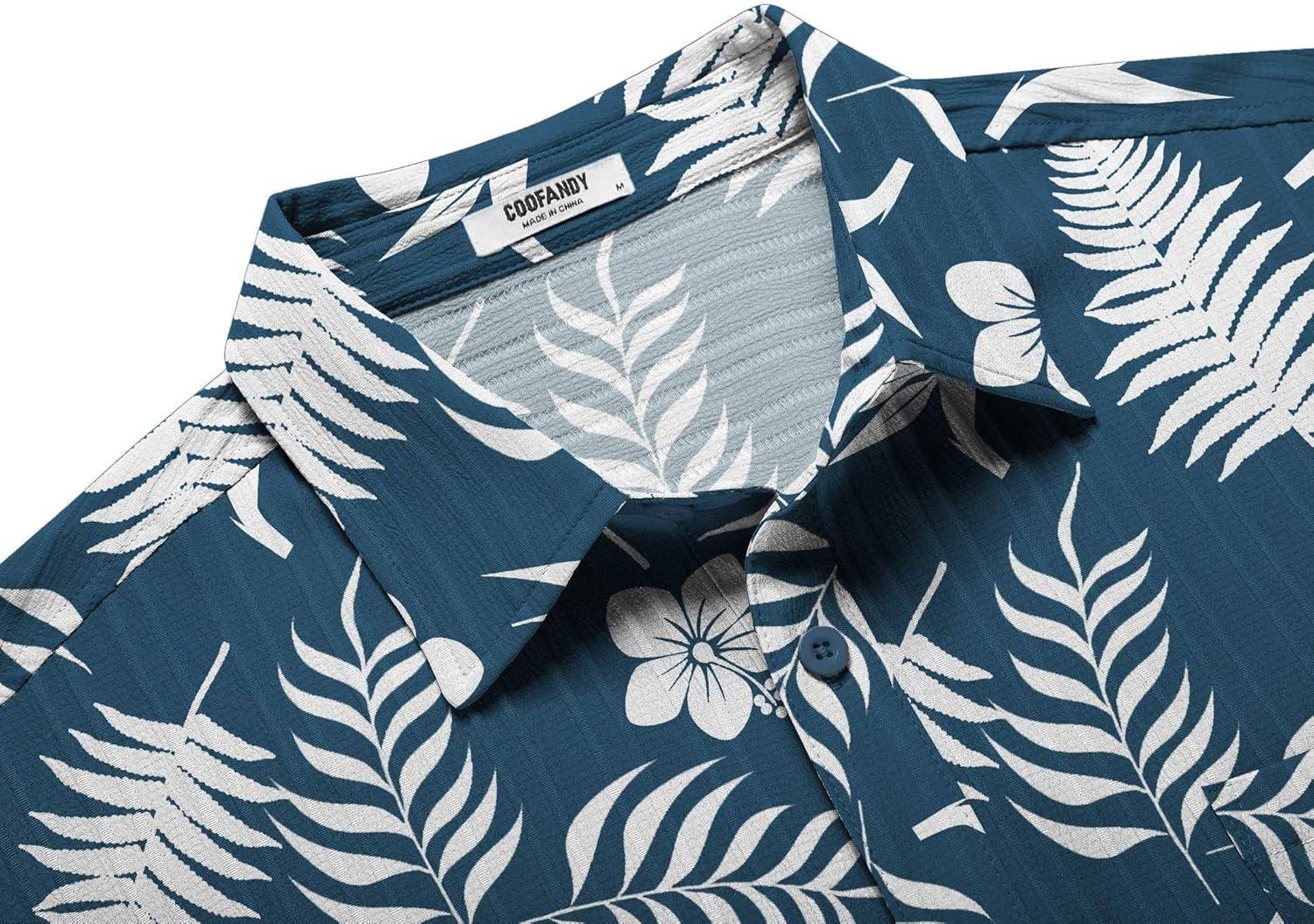 COOFANDY Men’s Casual Button Down Shirts Short Sleeve Textured Summer Beach Shirt with Pocket(Navy-white Leaves)