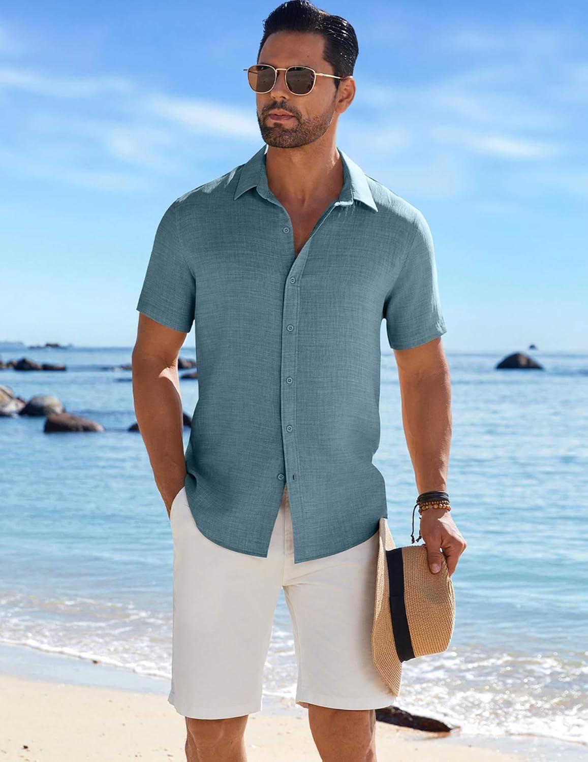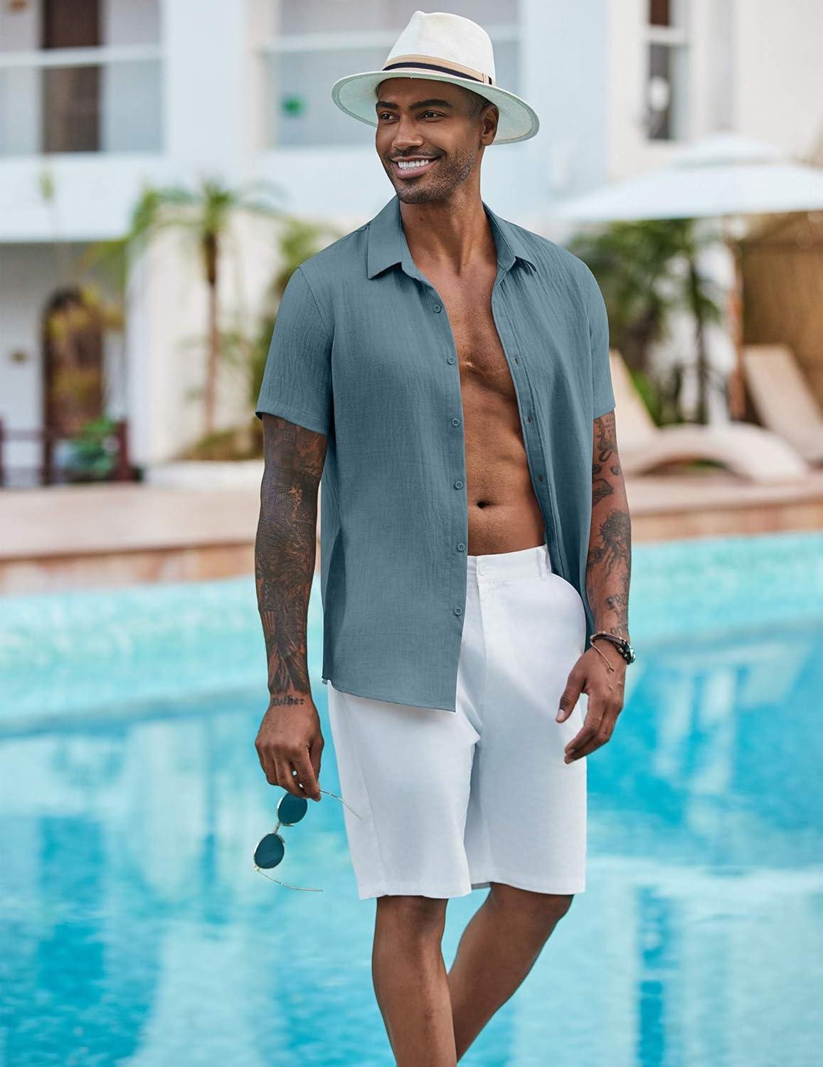 COOFANDY Men’s Casual Button Down Shirts Short Sleeve Textured Summer Beach Shirt(Dark Blue)