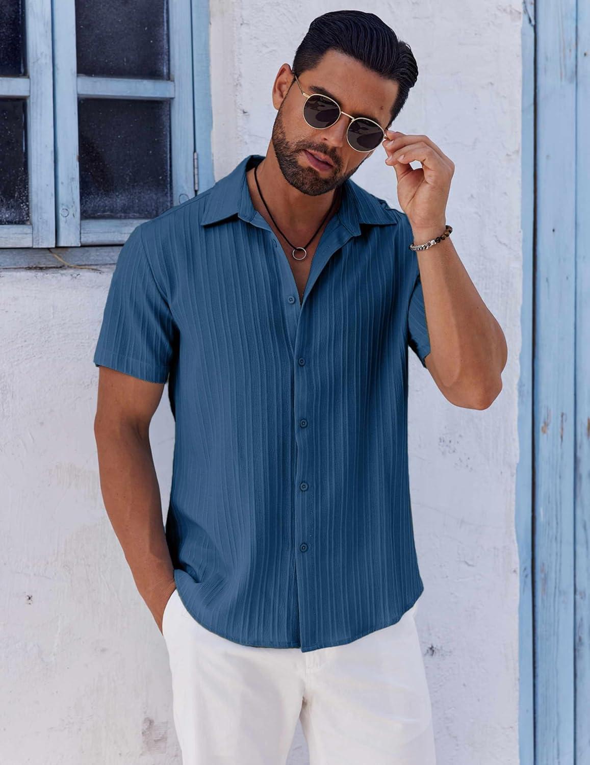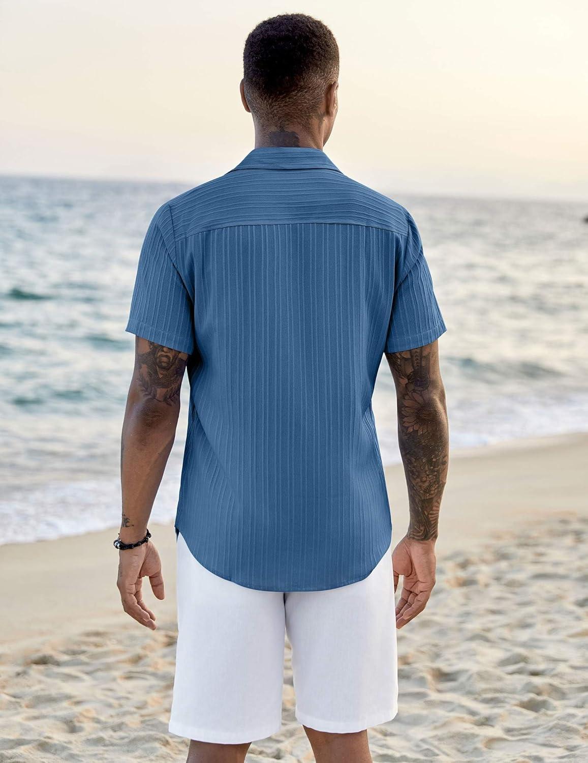 COOFANDY Men’s Casual Button Down Shirts Short Sleeve Textured Summer Beach Shirts(Dark Blue)