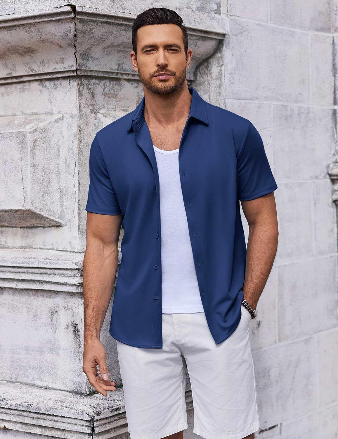 COOFANDY Men’s Casual Button Down Short Sleeve Shirts Untucked Wrinkle Free Shirt Stretch Dress Shirts(Ocean Blue)