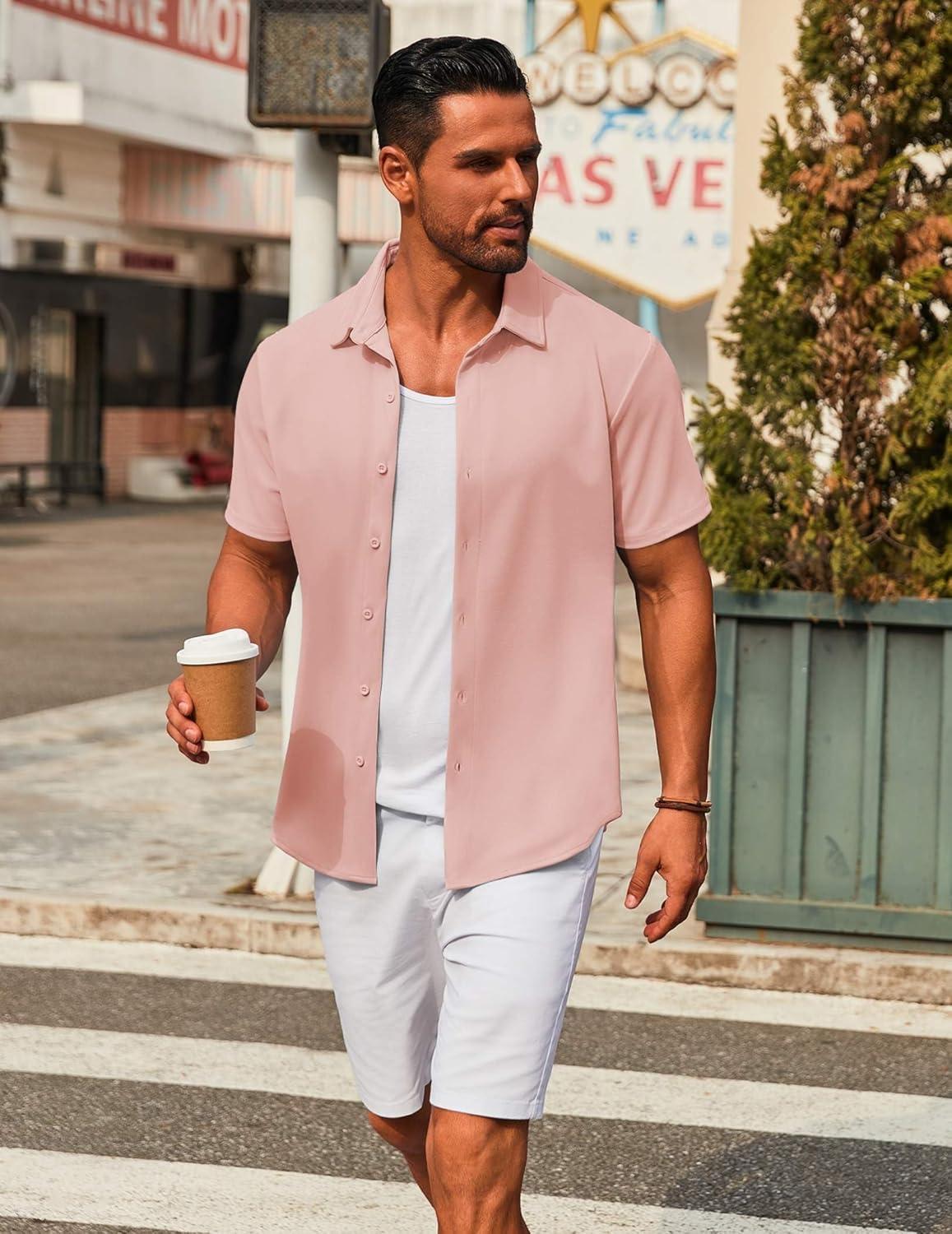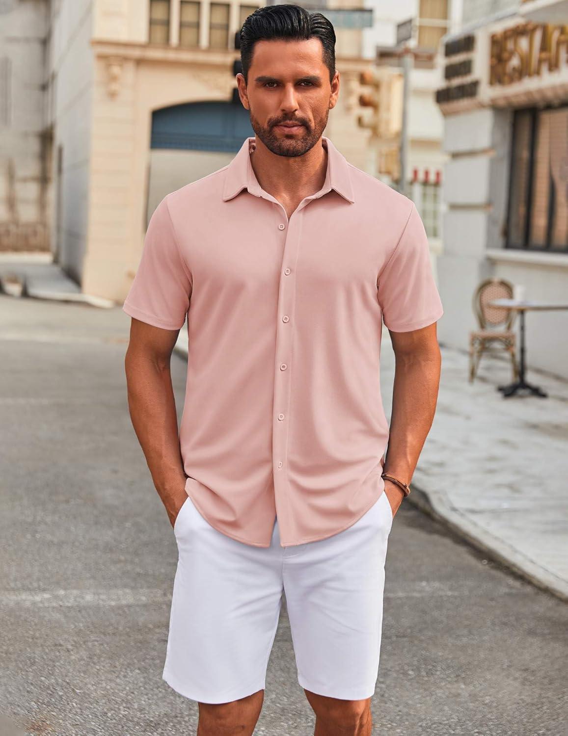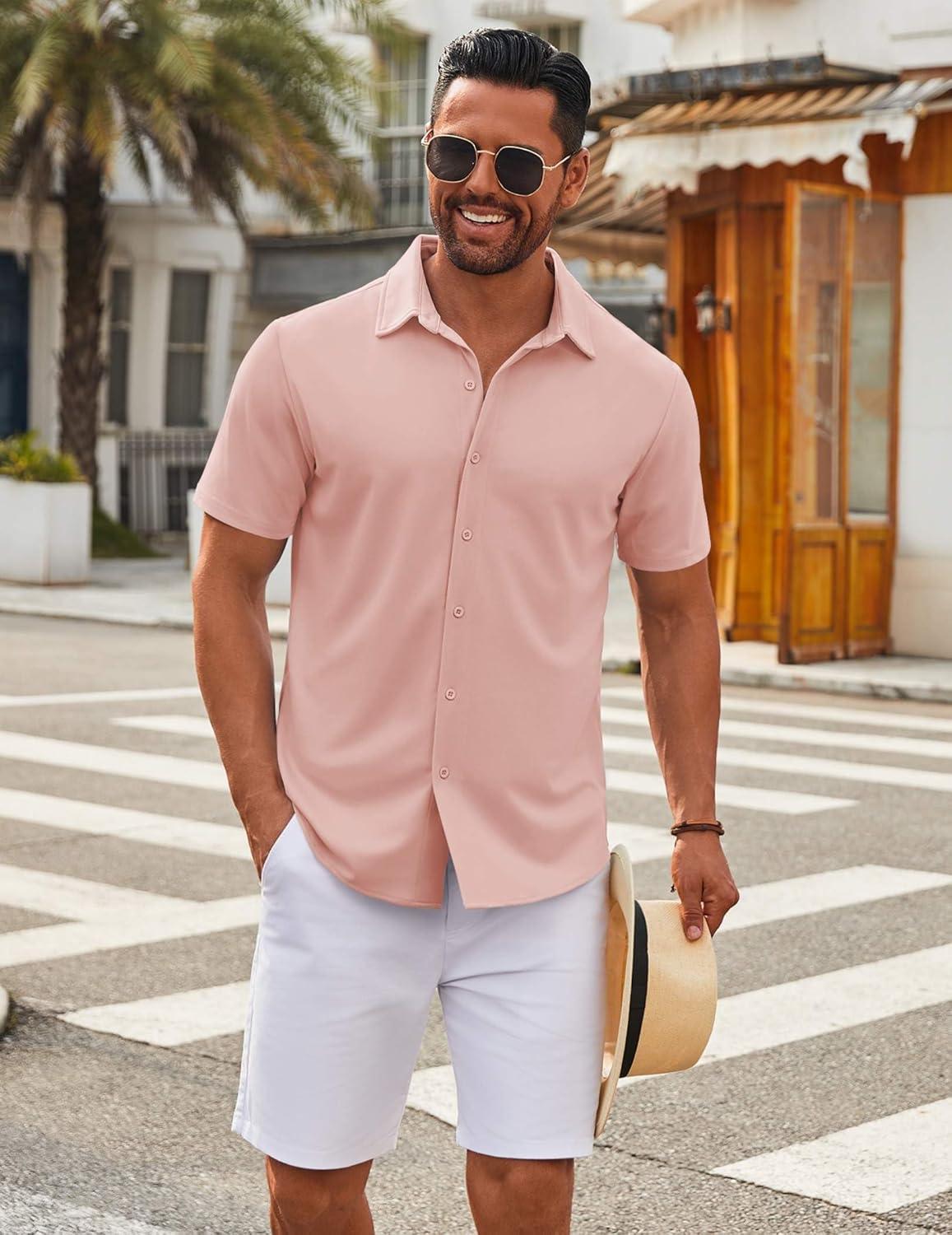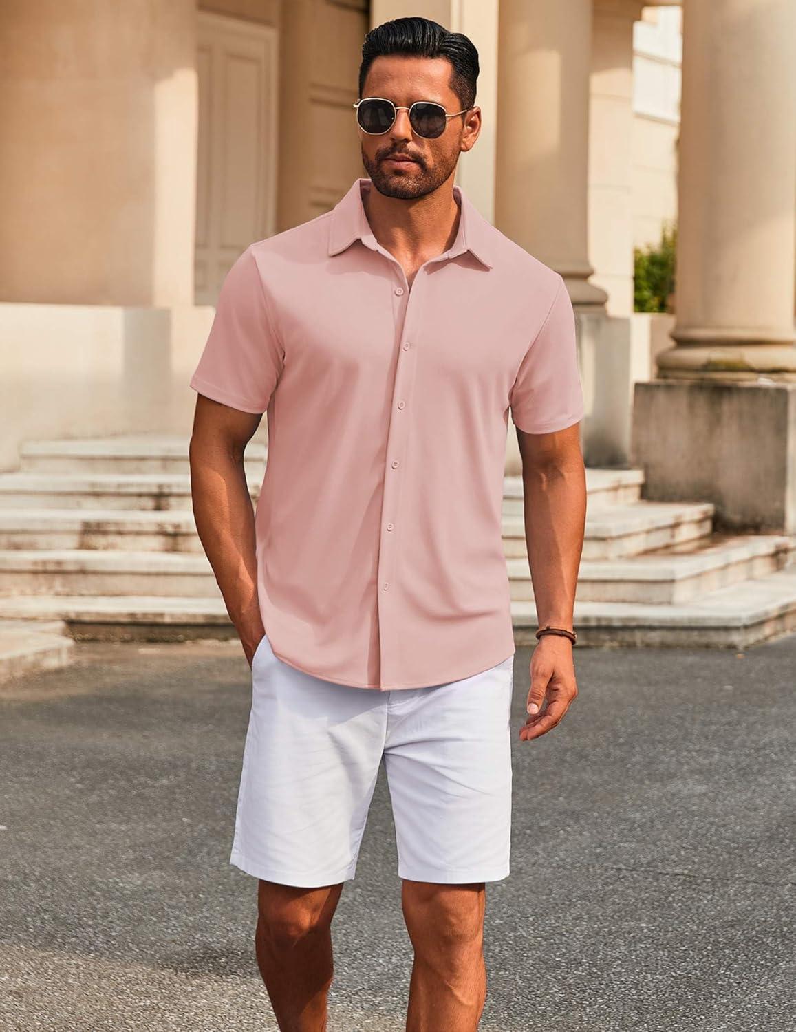 COOFANDY Men’s Casual Button Down Short Sleeve Shirts Untucked Wrinkle Free Shirt Stretch Dress Shirts(Pink)
