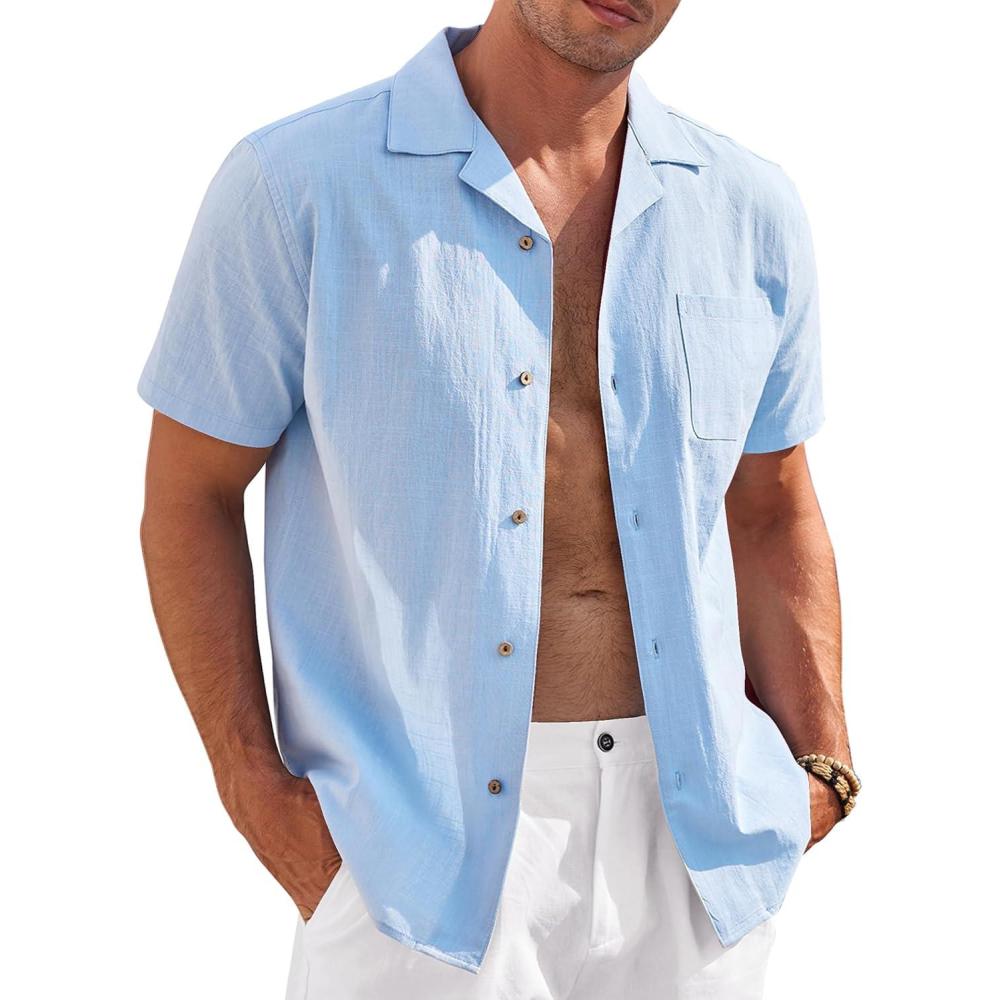 COOFANDY Mens Casual Cotton Linen Shirt Short Sleeve Button Up Shirts Summer Beach Top(Light Blue)