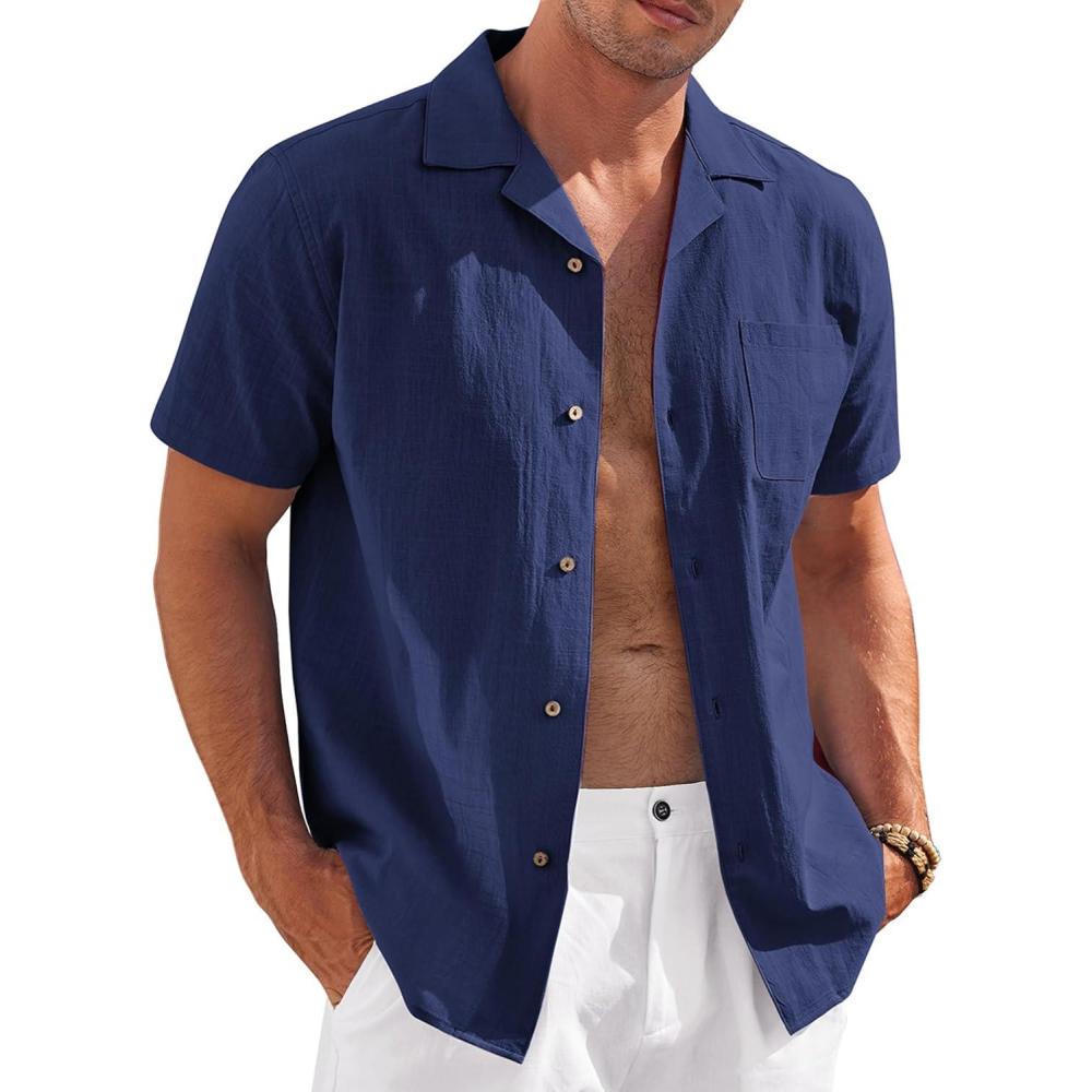 COOFANDY Mens Casual Cotton Linen Shirt Short Sleeve Button Up Shirts Summer Beach Top(Navy Blue)